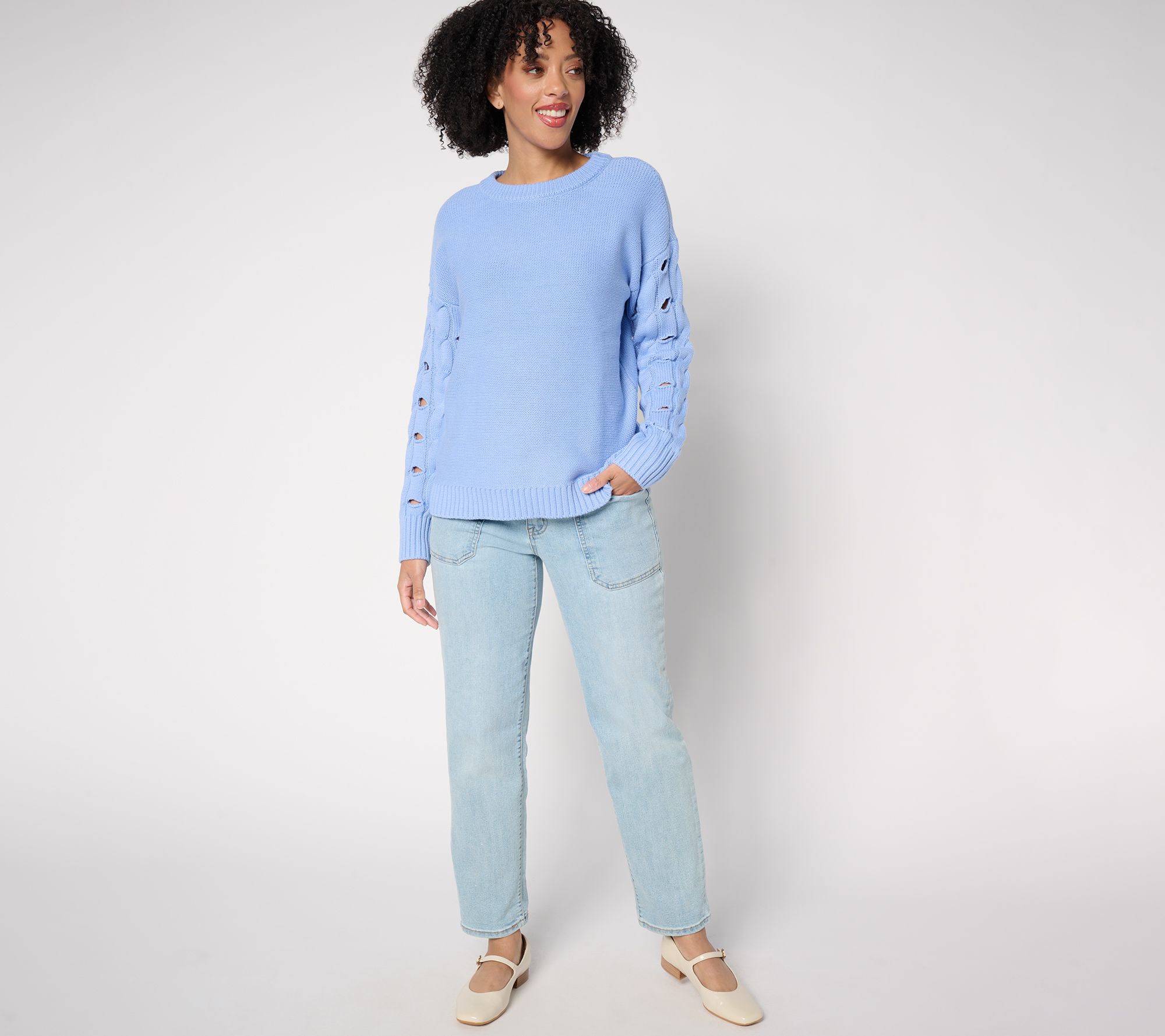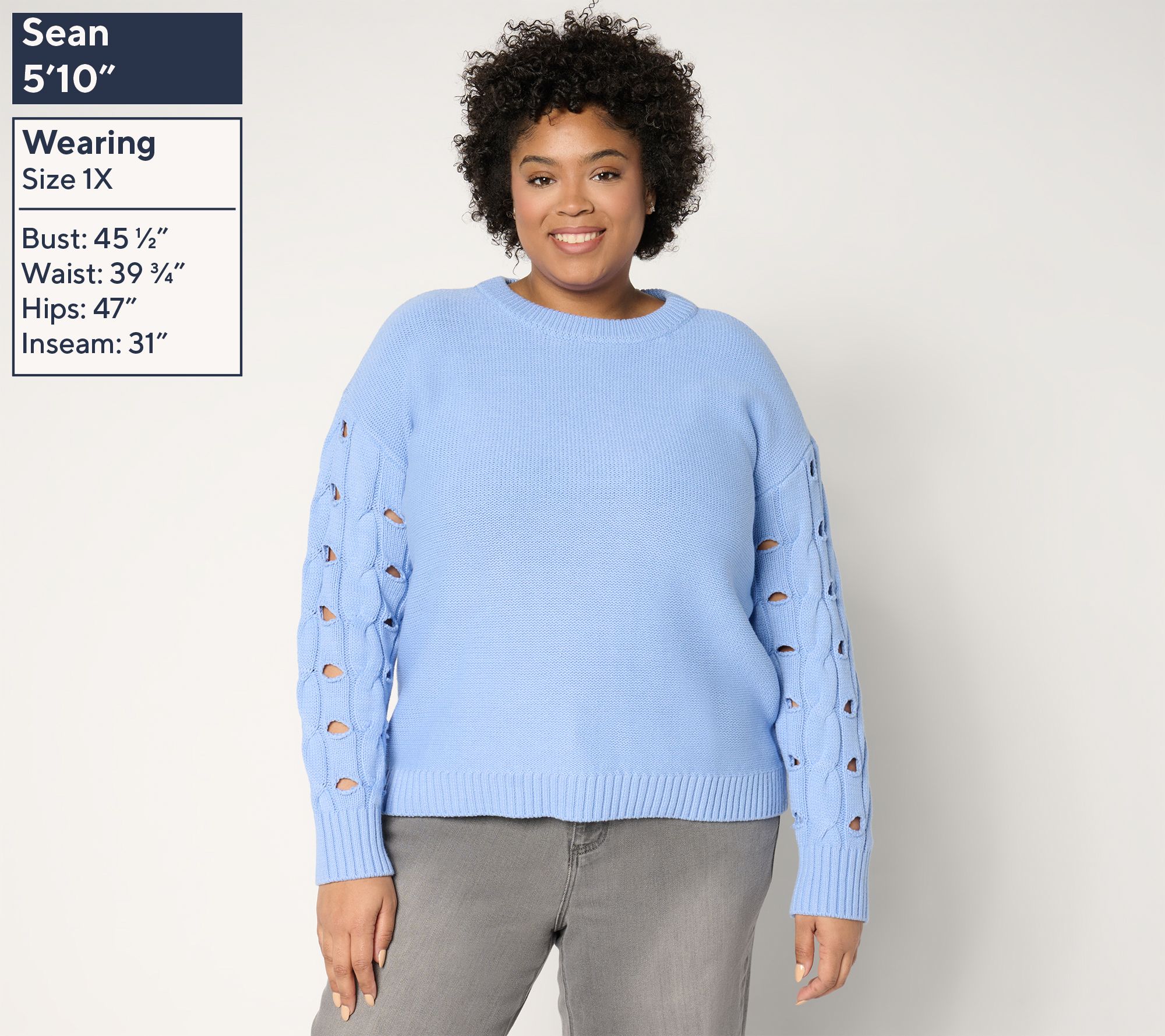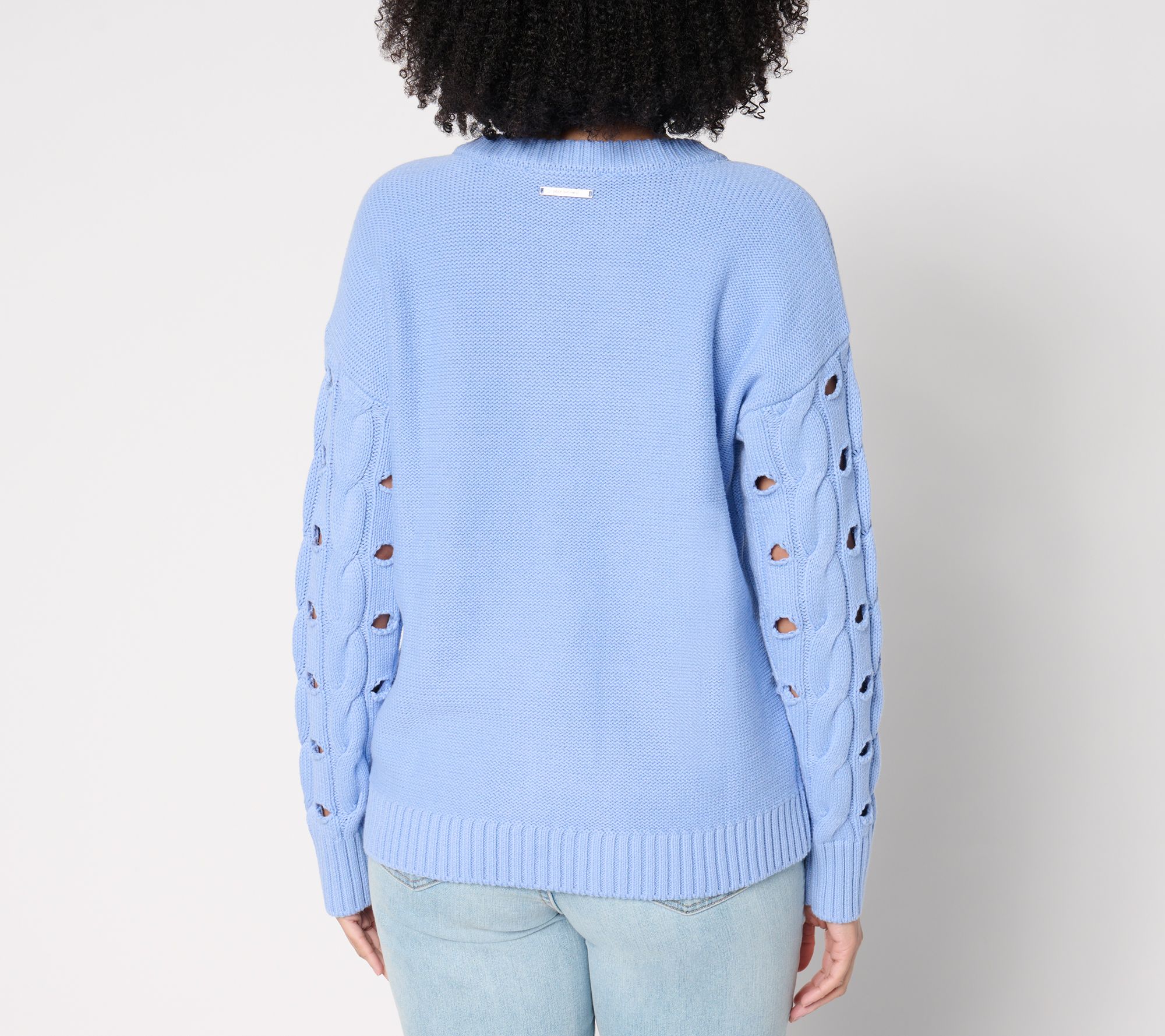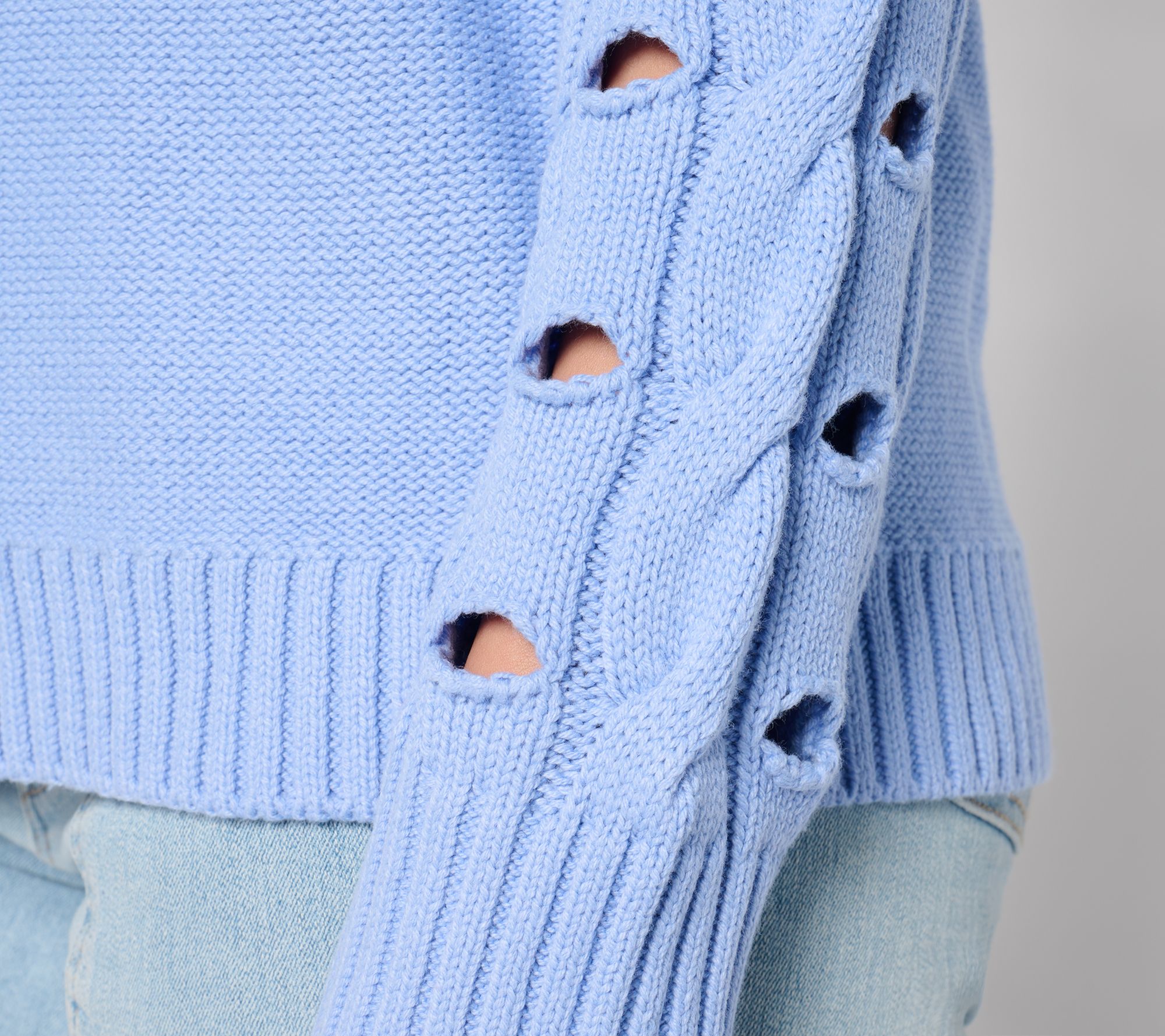 Sweater weather just got a playful update with this mock neckline style. Peek-a-boo cutouts on the long sleeves create an eye-catching element, while the ribbed details at the cuffs and hemline provide a polished finish. From Peace Love World.