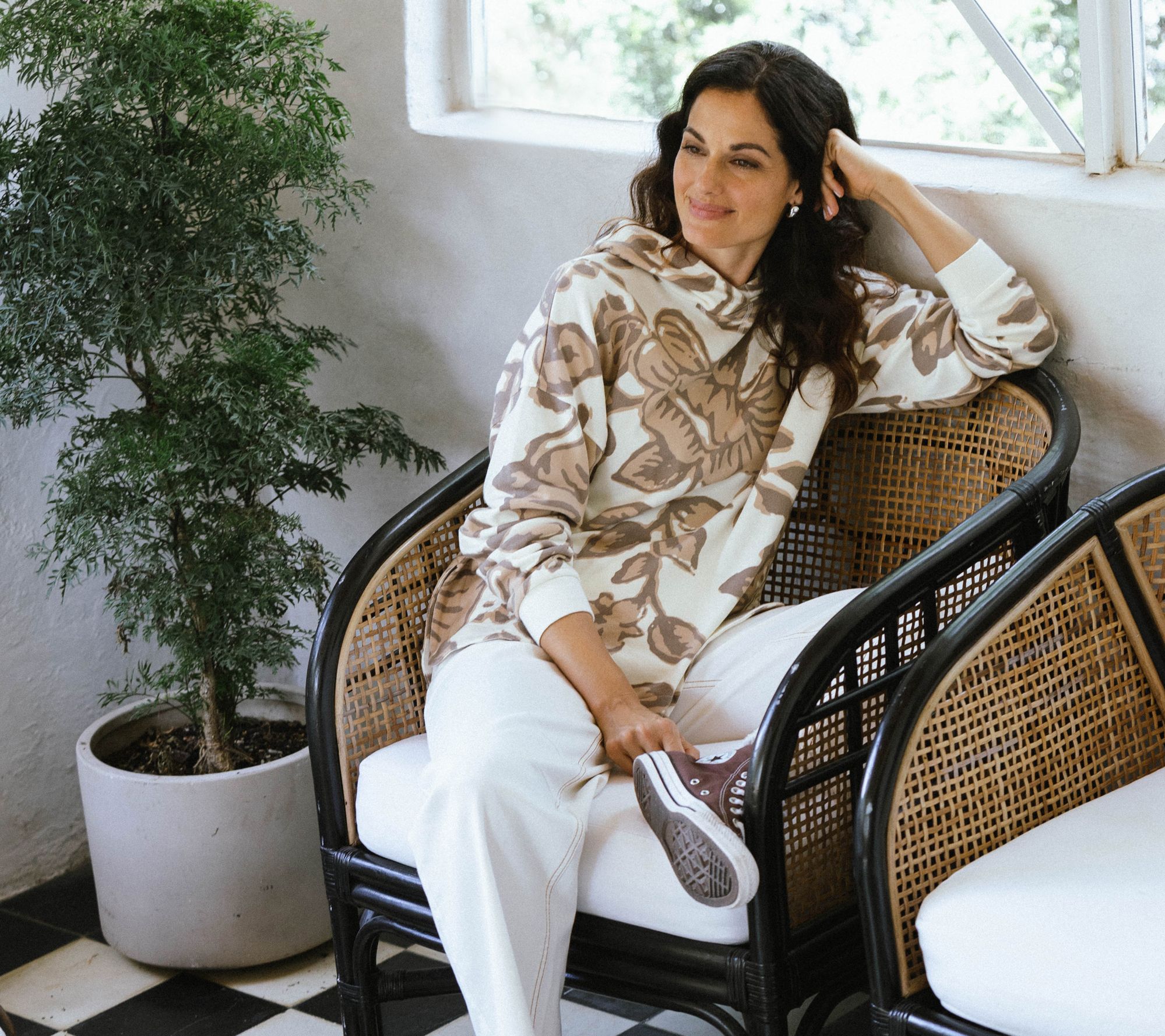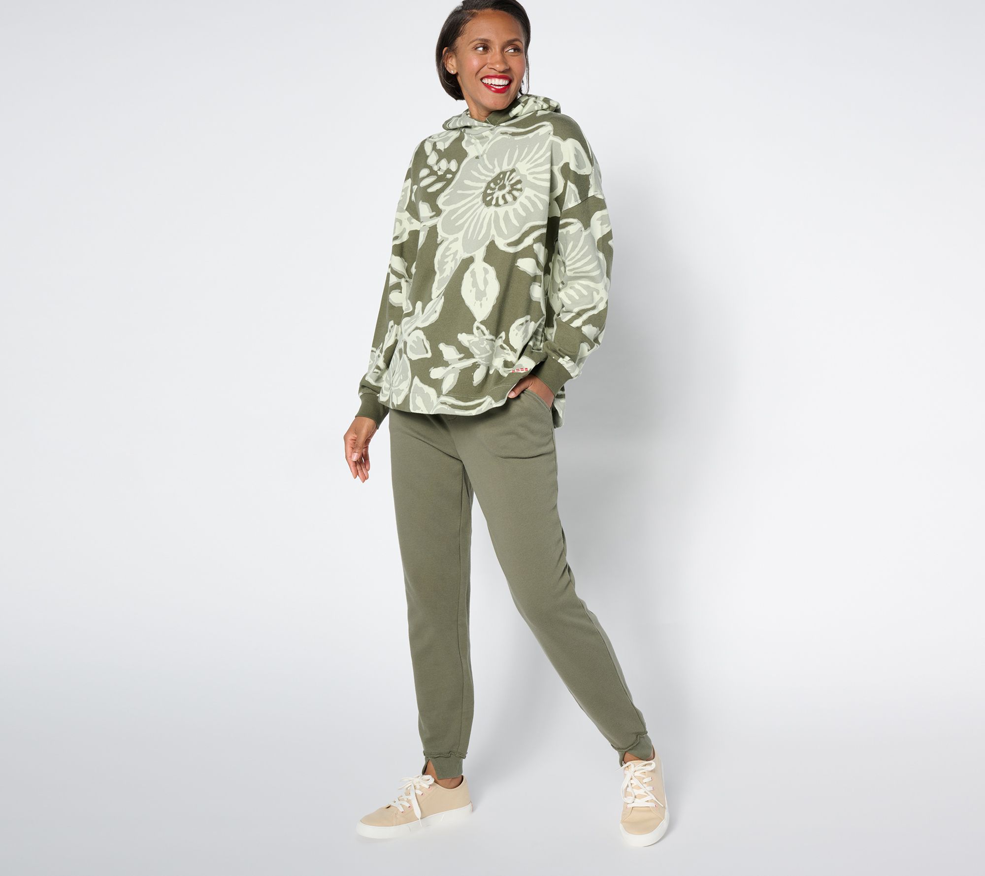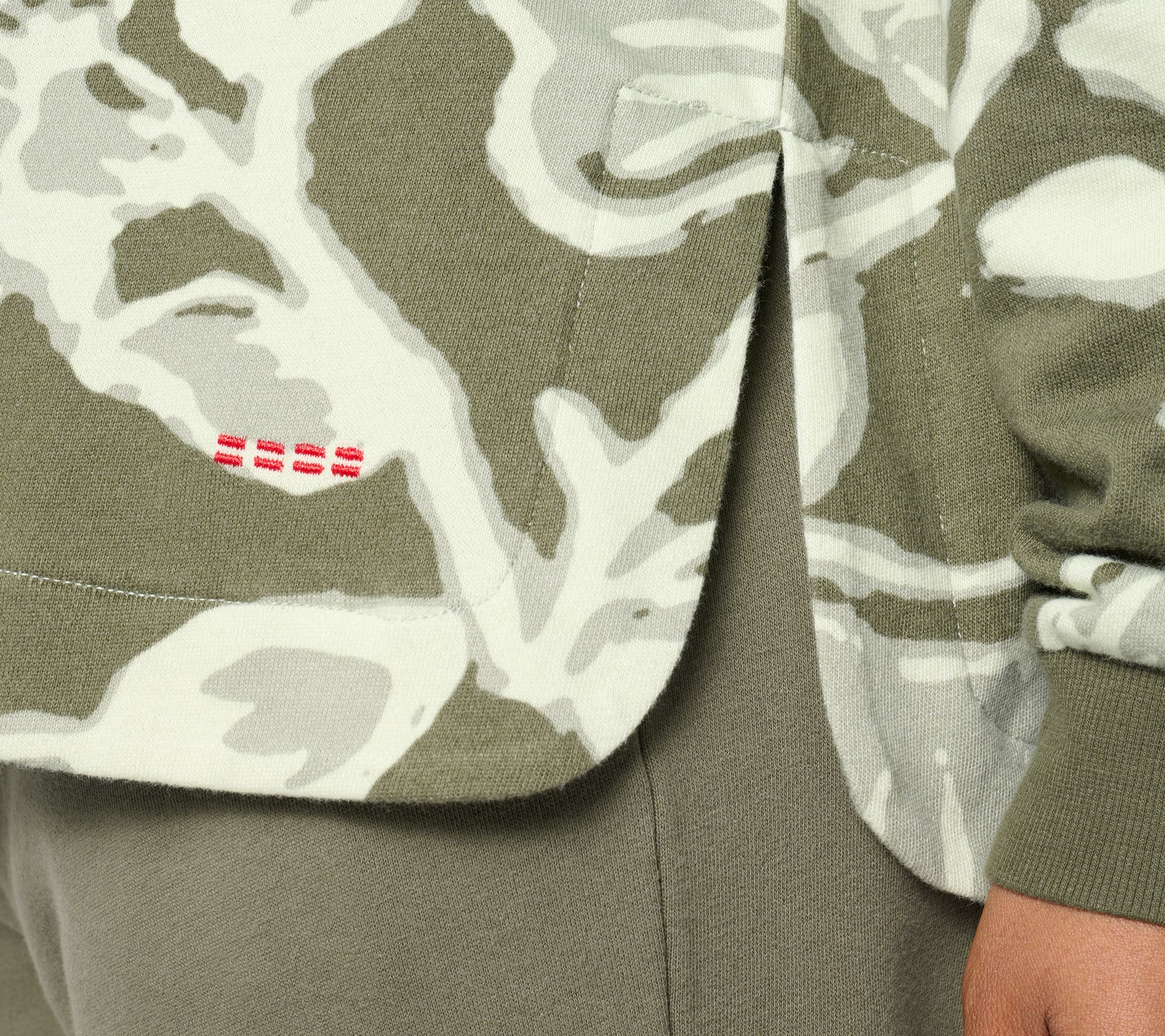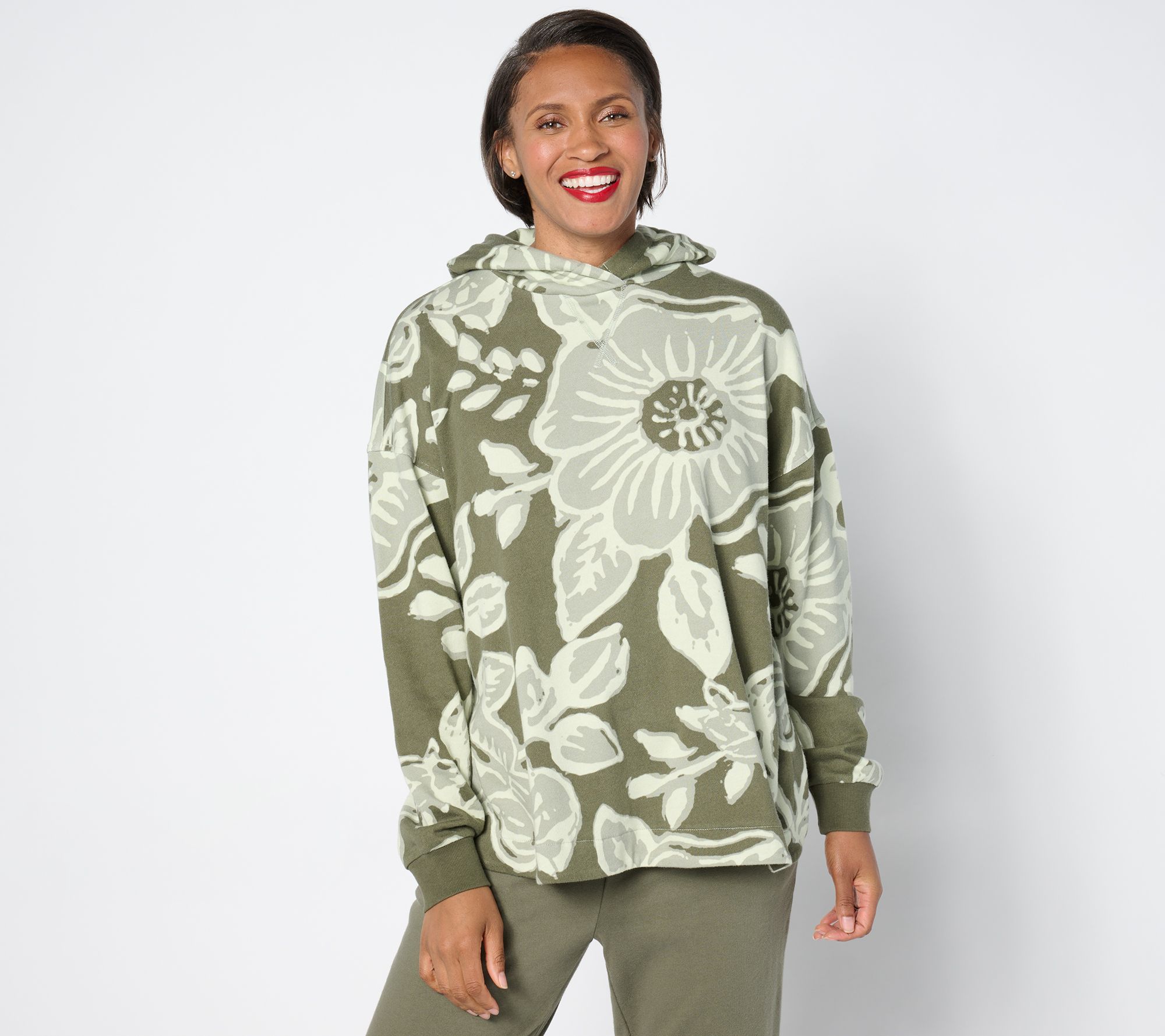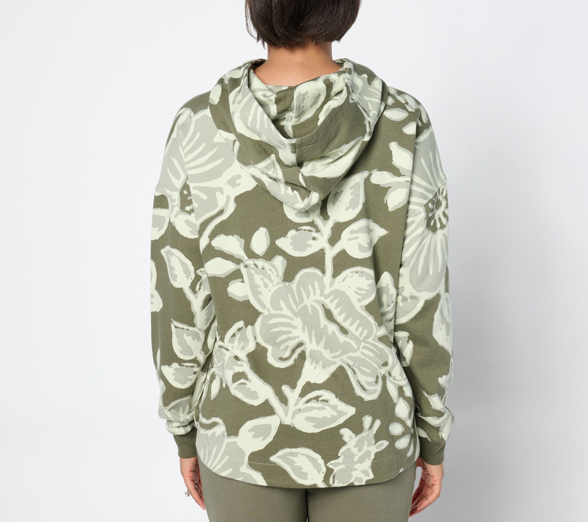 • Features: allover print, hood, drop shoulder, side slits, long sleeves with folded rib cuffs