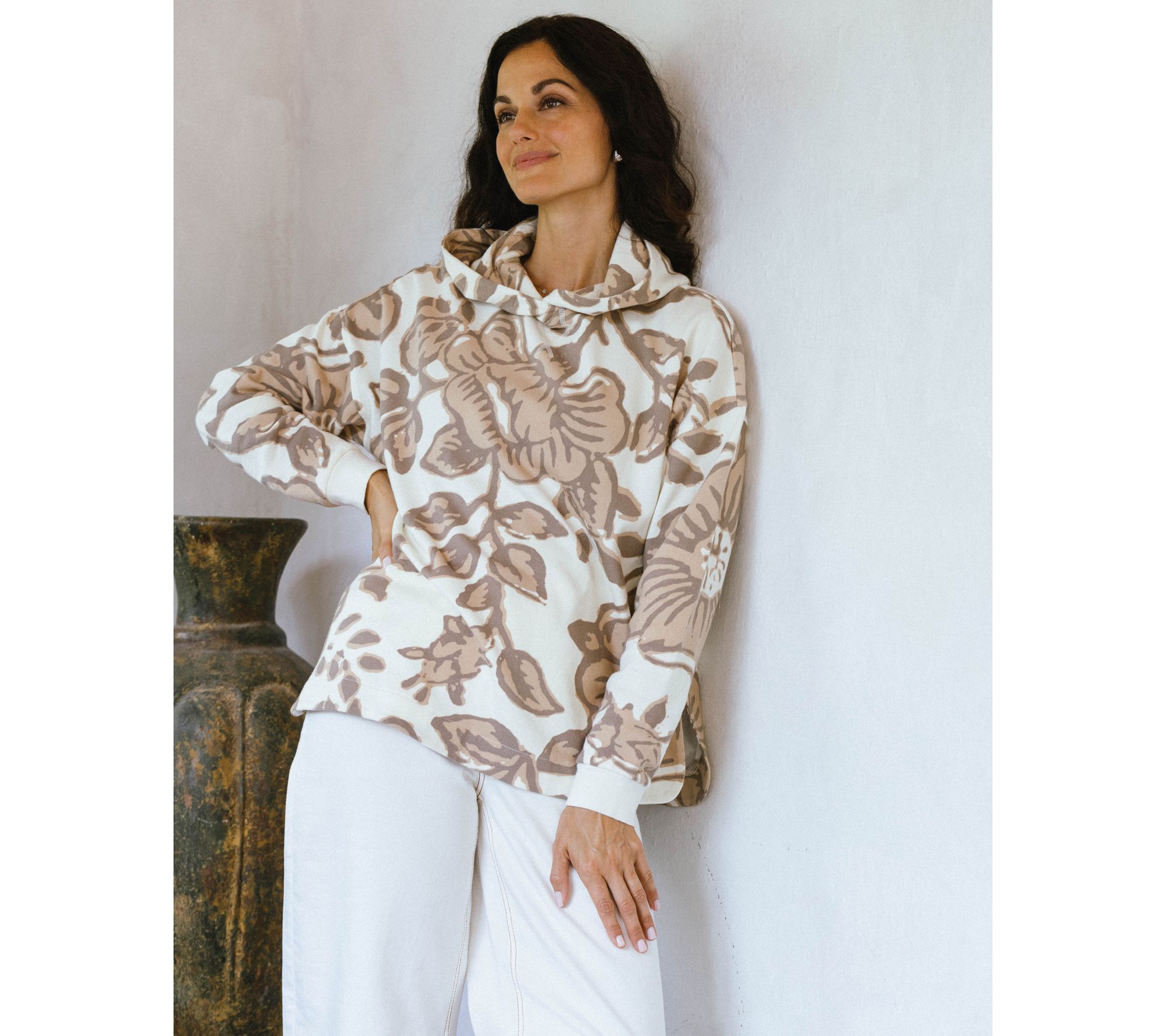 Add a touch of cozy charm to your wardrobe with the Peace Love World printed hooded pullover. This knit top features a stylish hood, drop shoulders, and side slits for added comfort and flair. From Peace Love World.