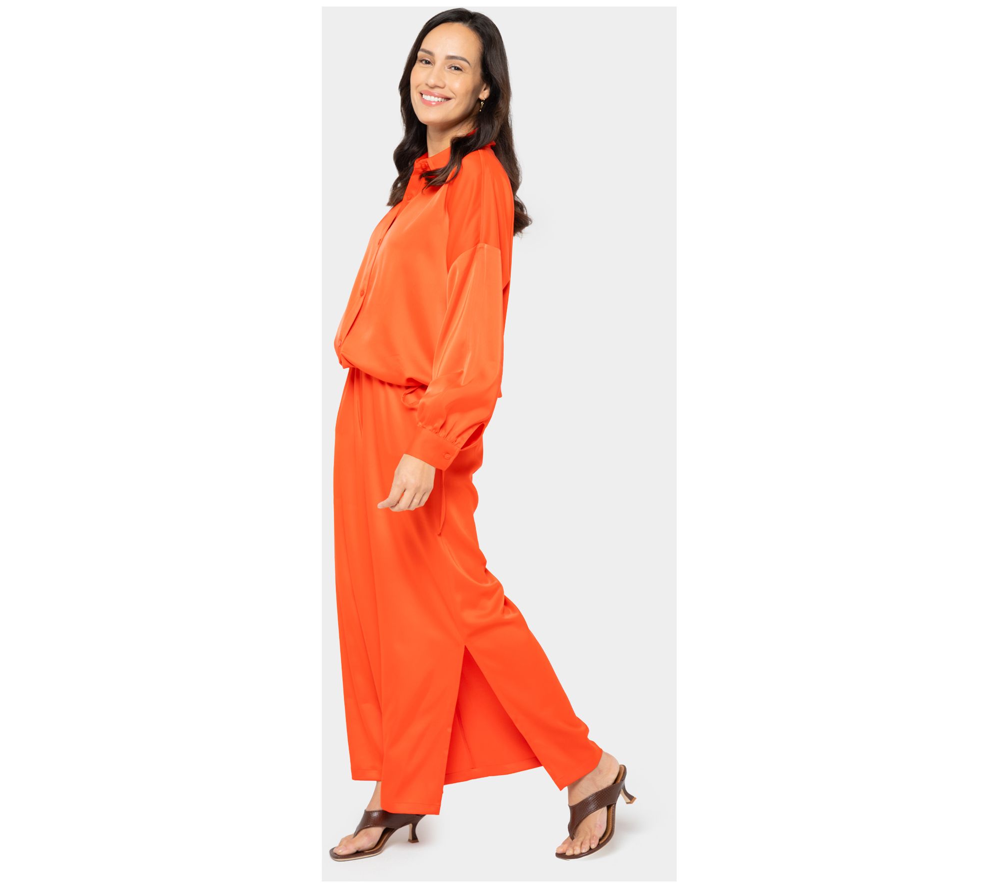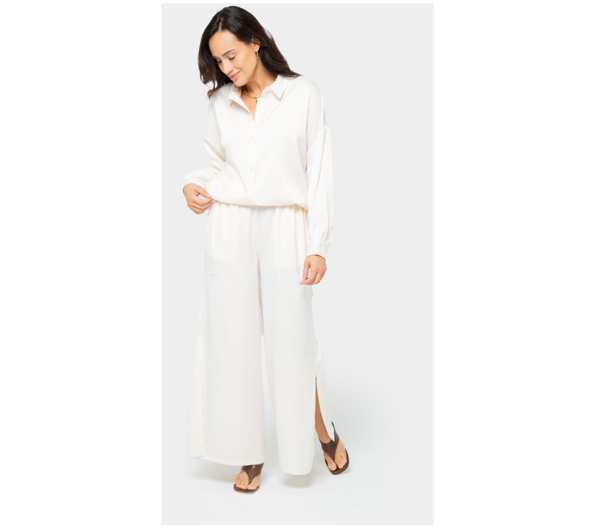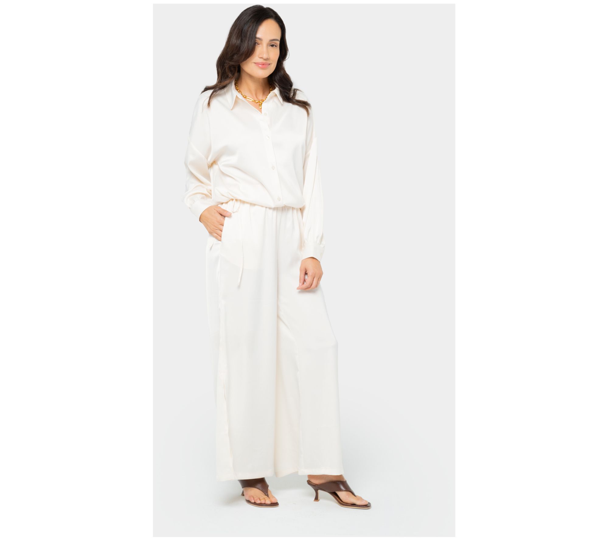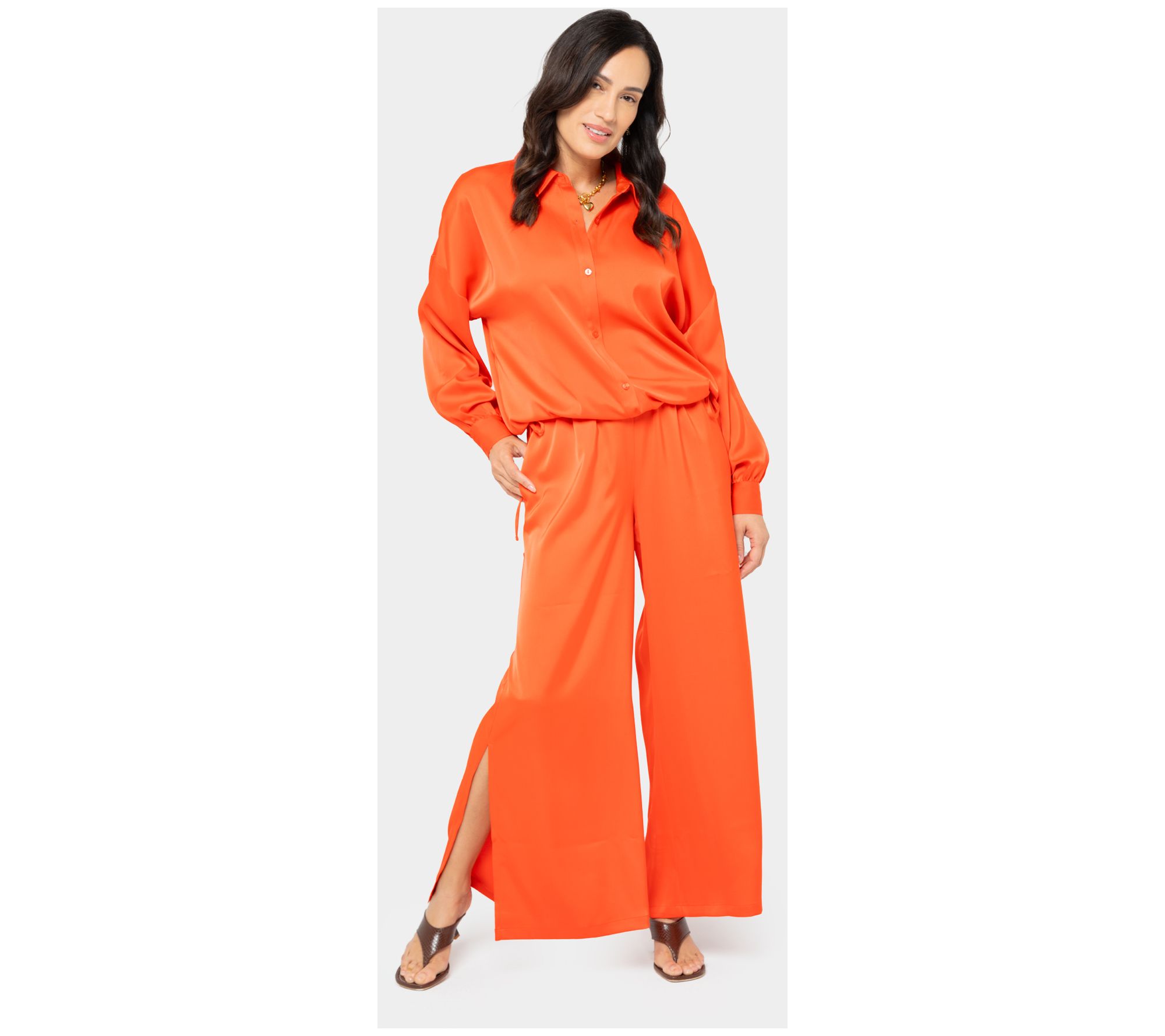 Make a strong style statement in these satin pull-on pants. Show a little leg with high side slits and finish the look with a pair of pumps. From Peace Love World.