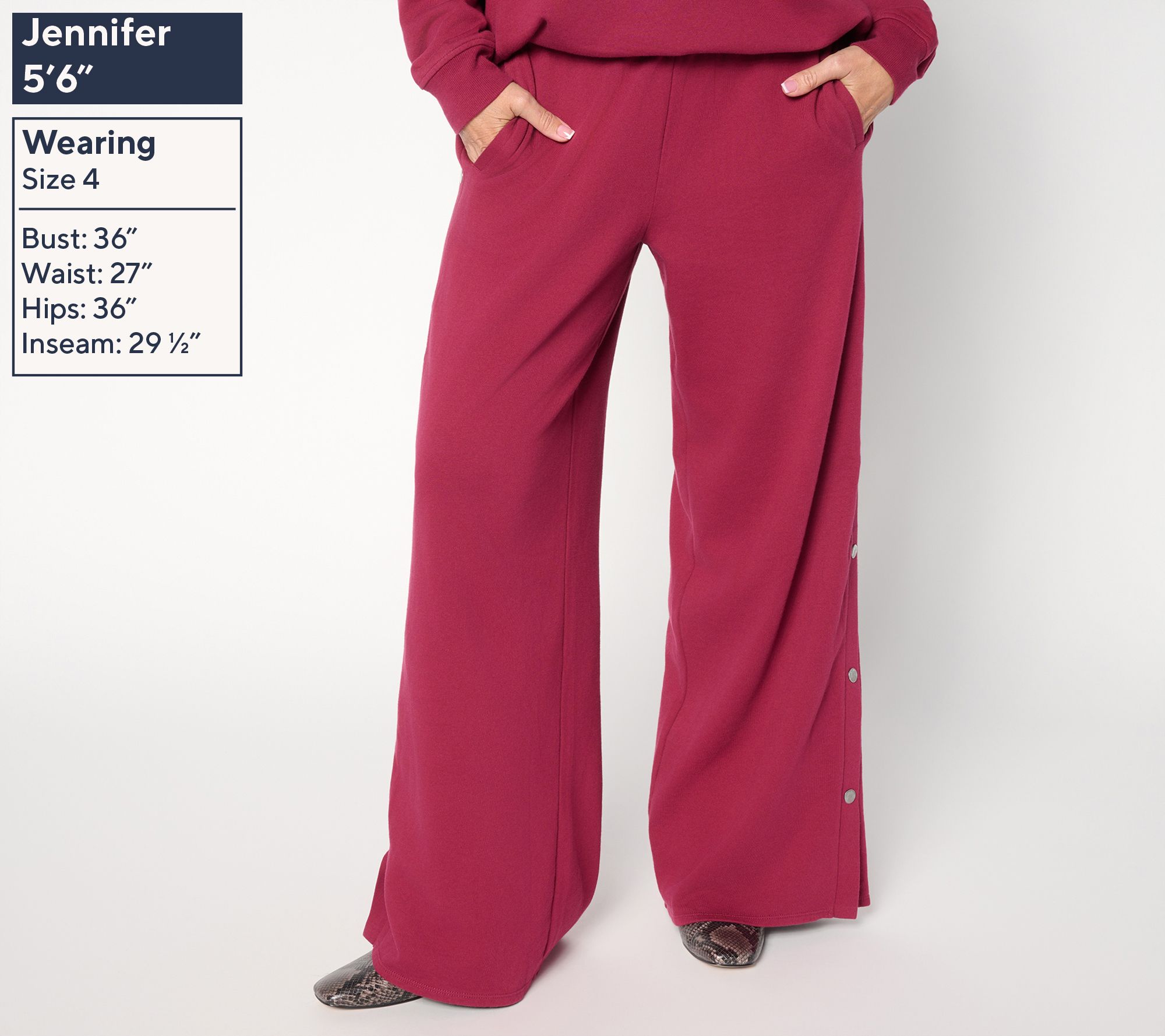 • Features: pull-on style, self-folded waistband, welt front pockets, seven bottom snaps (four are functional)