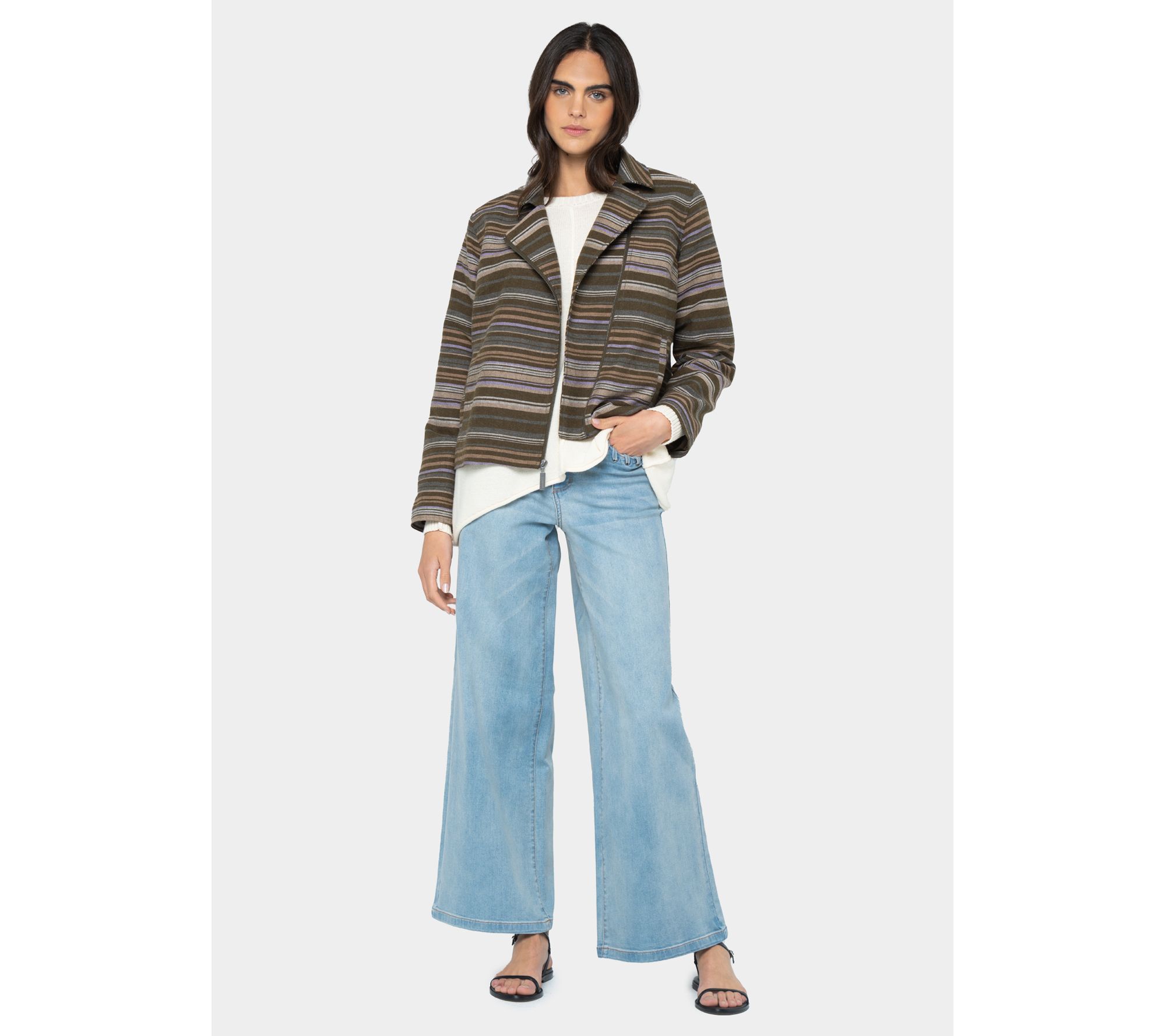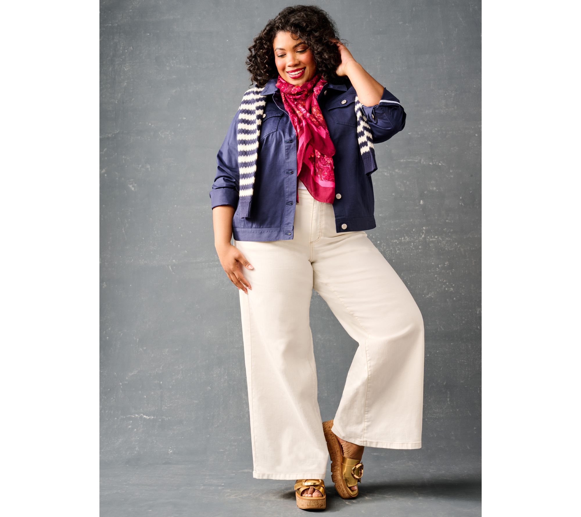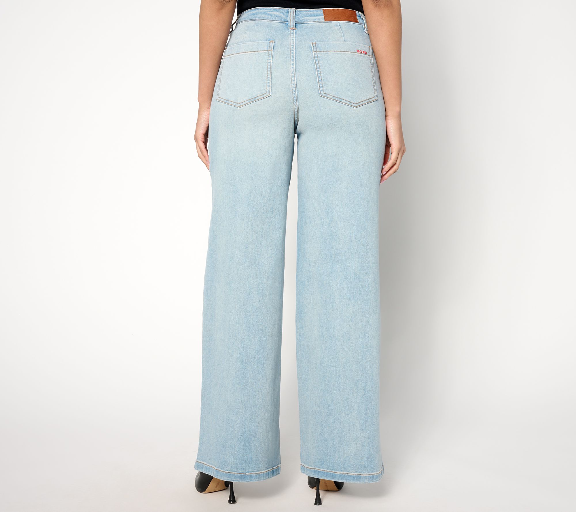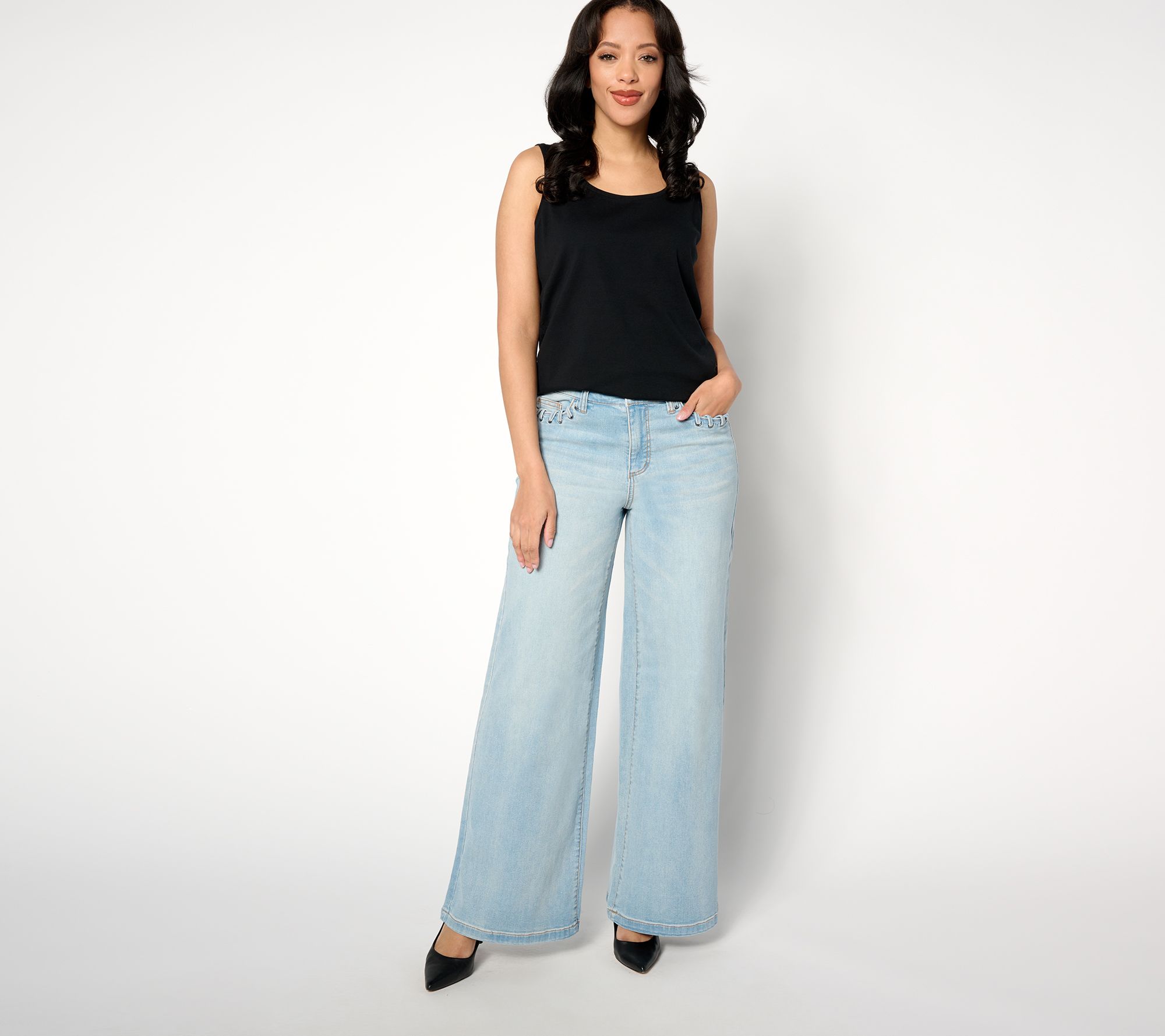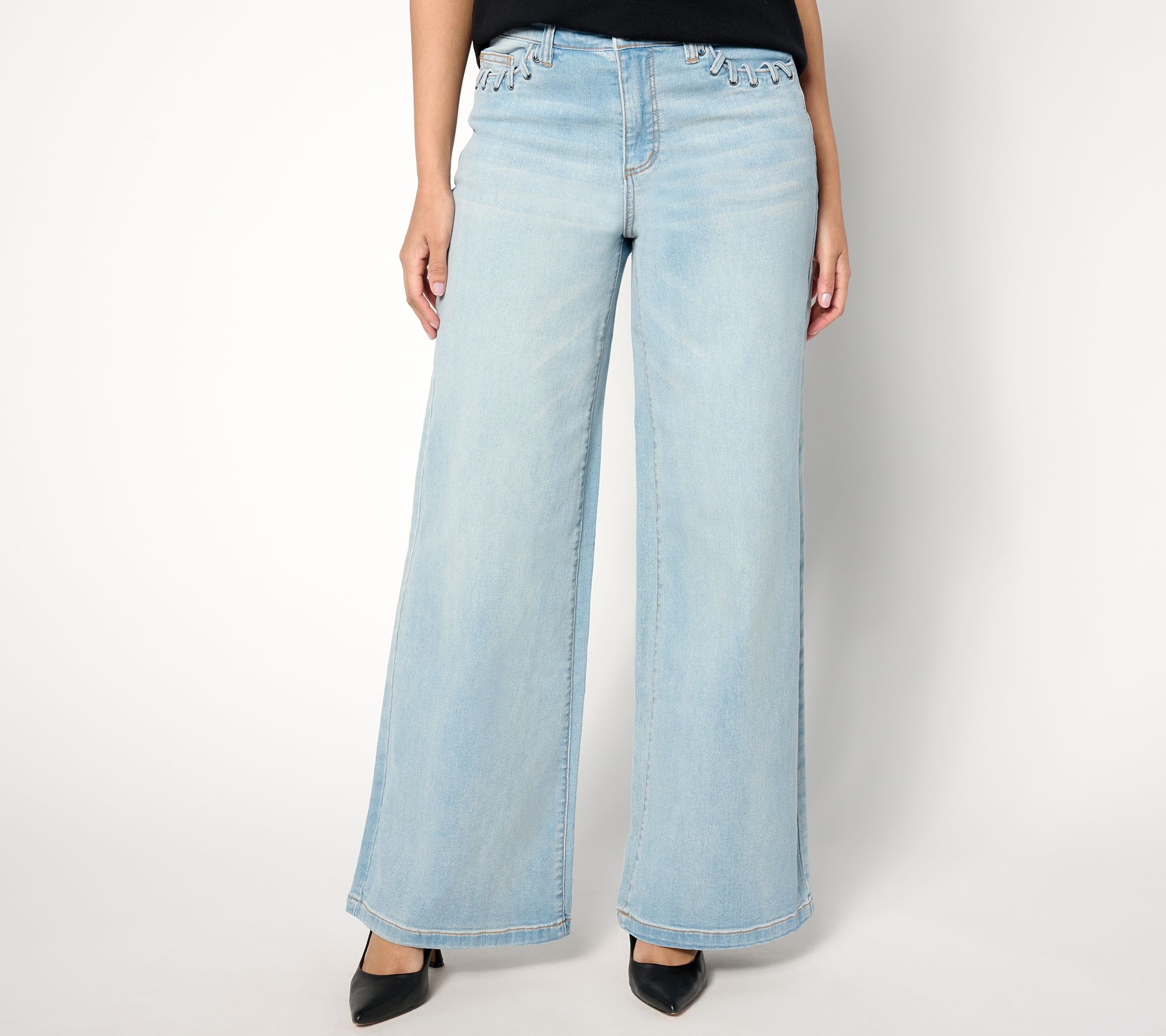 Work the room in a pair of wide-leg jeans designed to dazzle and delight. The grommet detail on the pockets makes this style extra special -- play it up with a luxe leather belt. From Peace Love World.