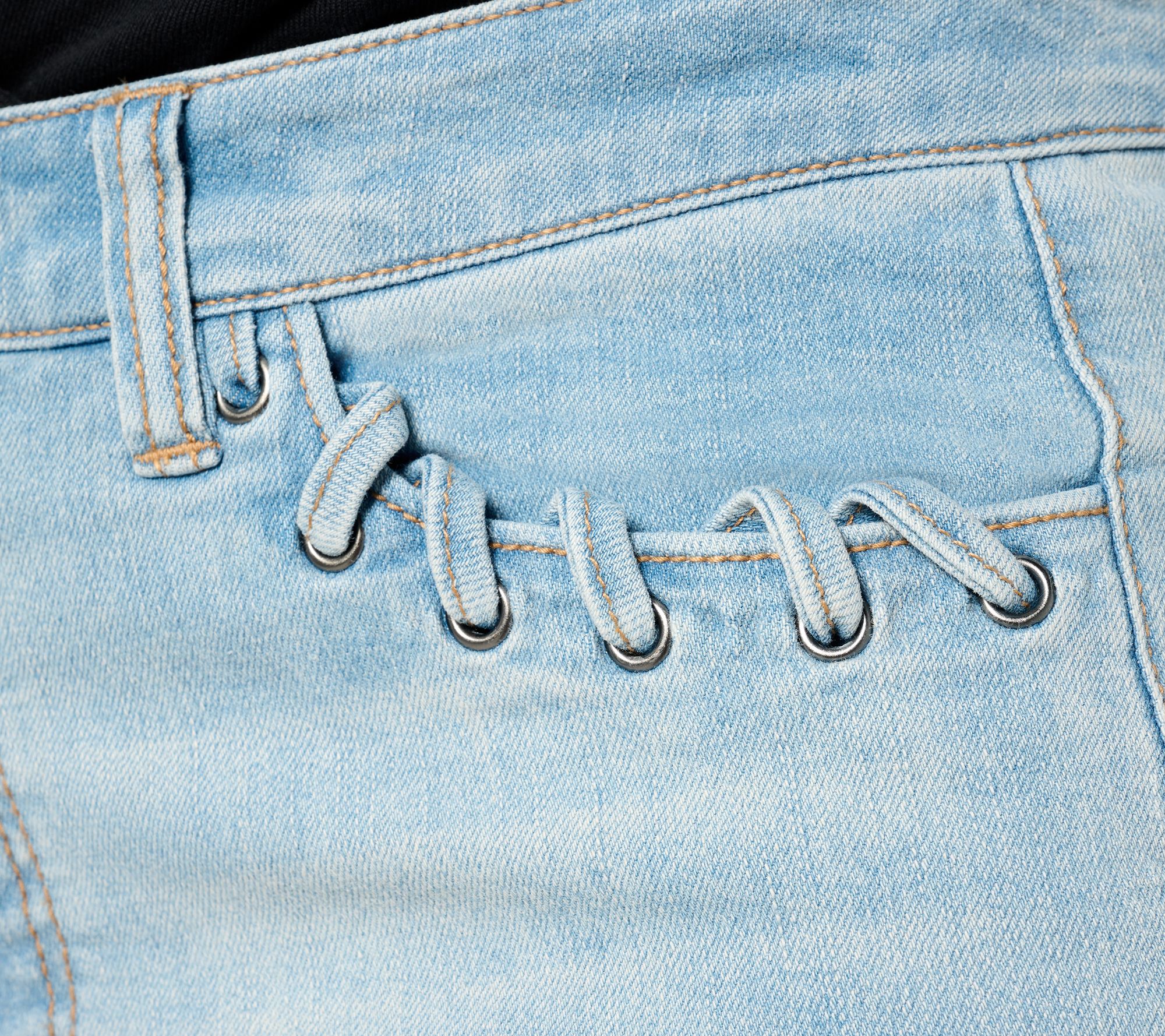 Features: contour waistband with shank button closure and self belt loops, scoop pockets with grommet and ties details at pocket opening edge, coin pocket, back patch pockets