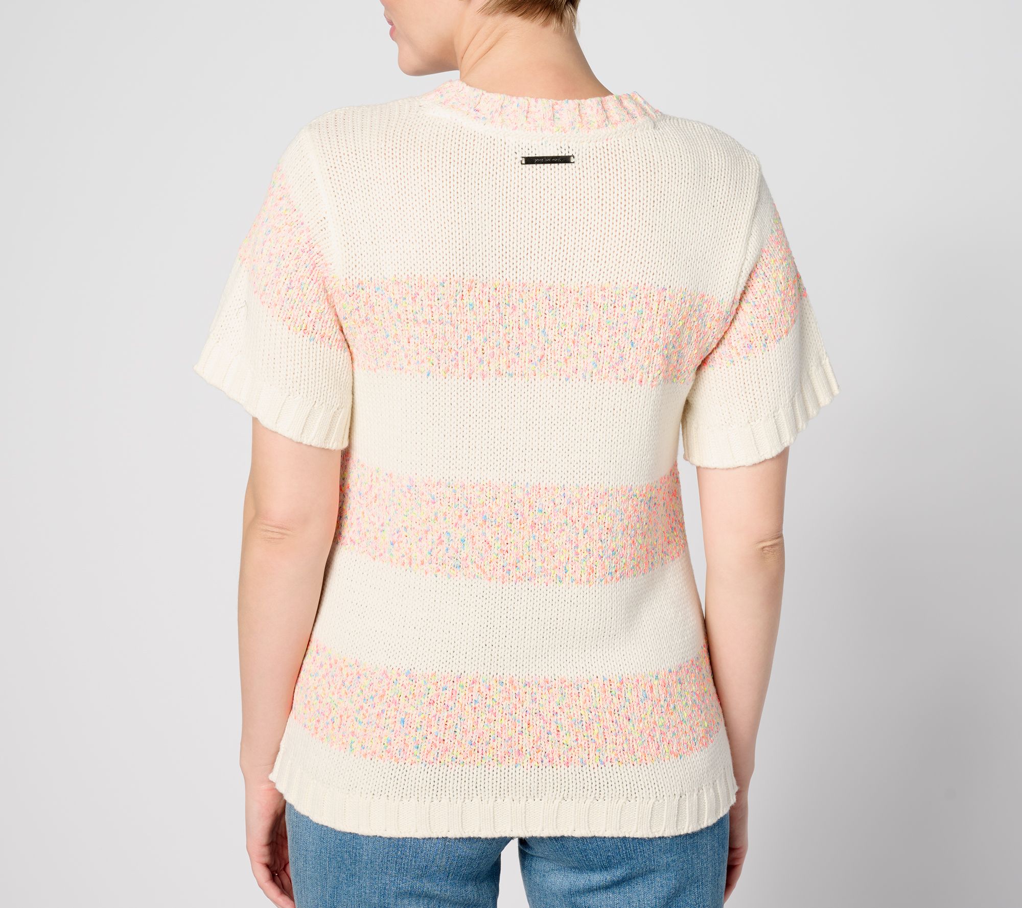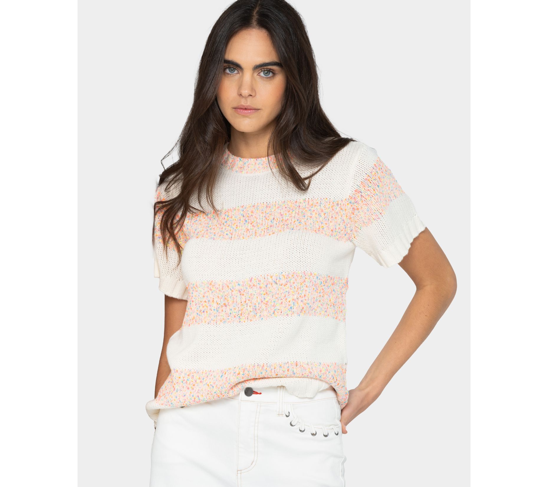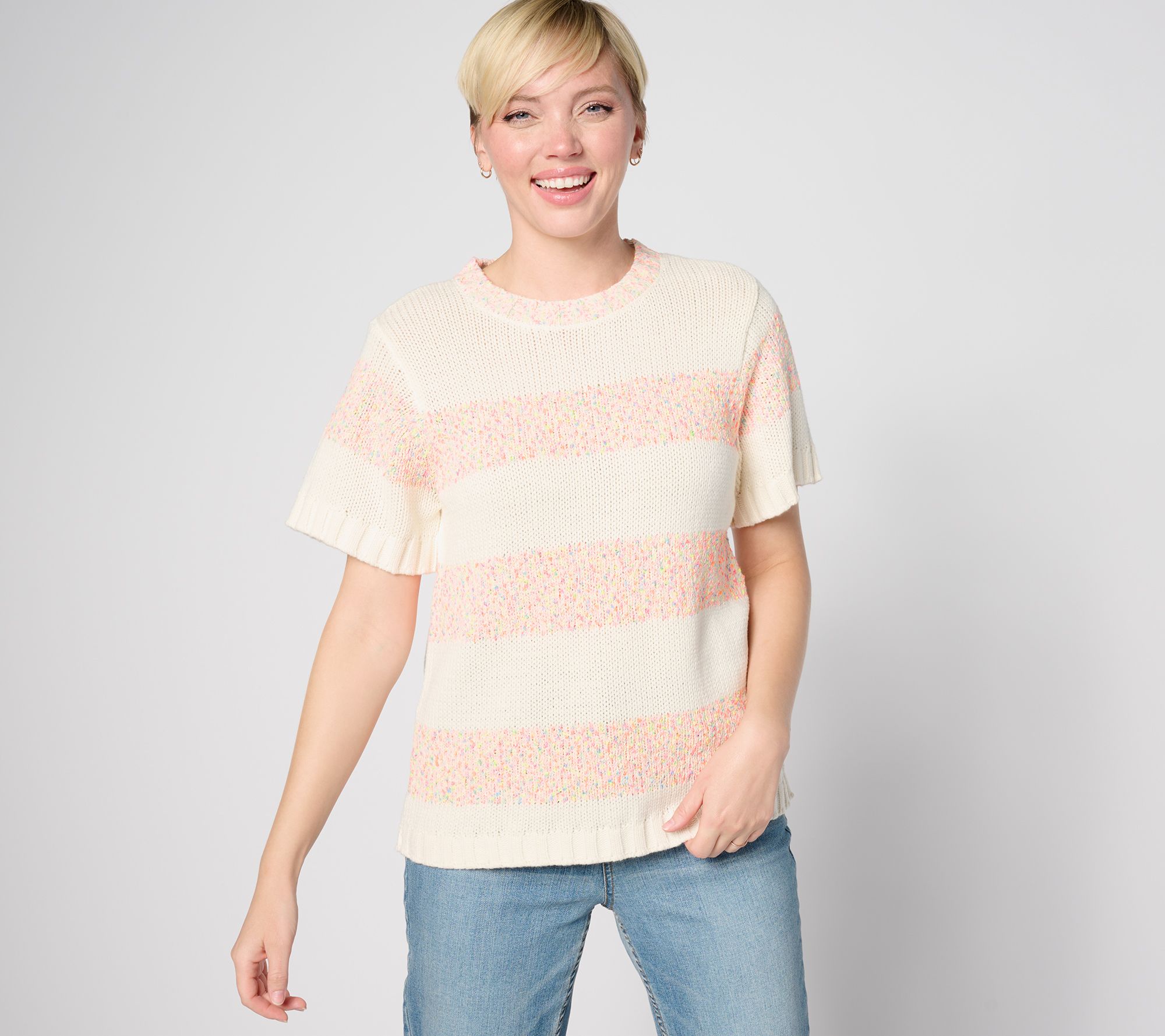 Neon confetti-like stripes give this short-sleeve sweater a fun, playful vibe. That's why it's bound to be in heavy rotation all season long. From Peace Love World.