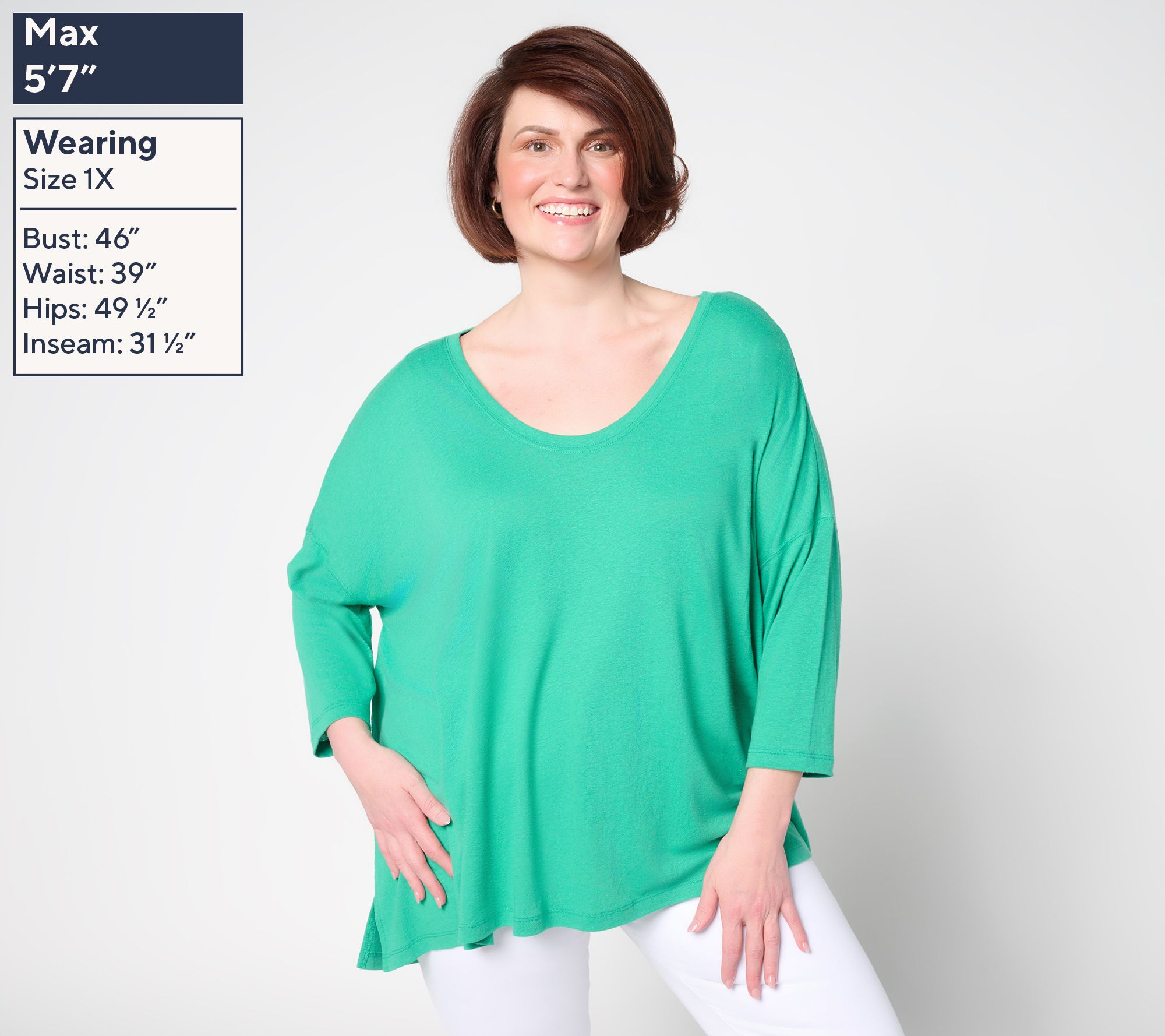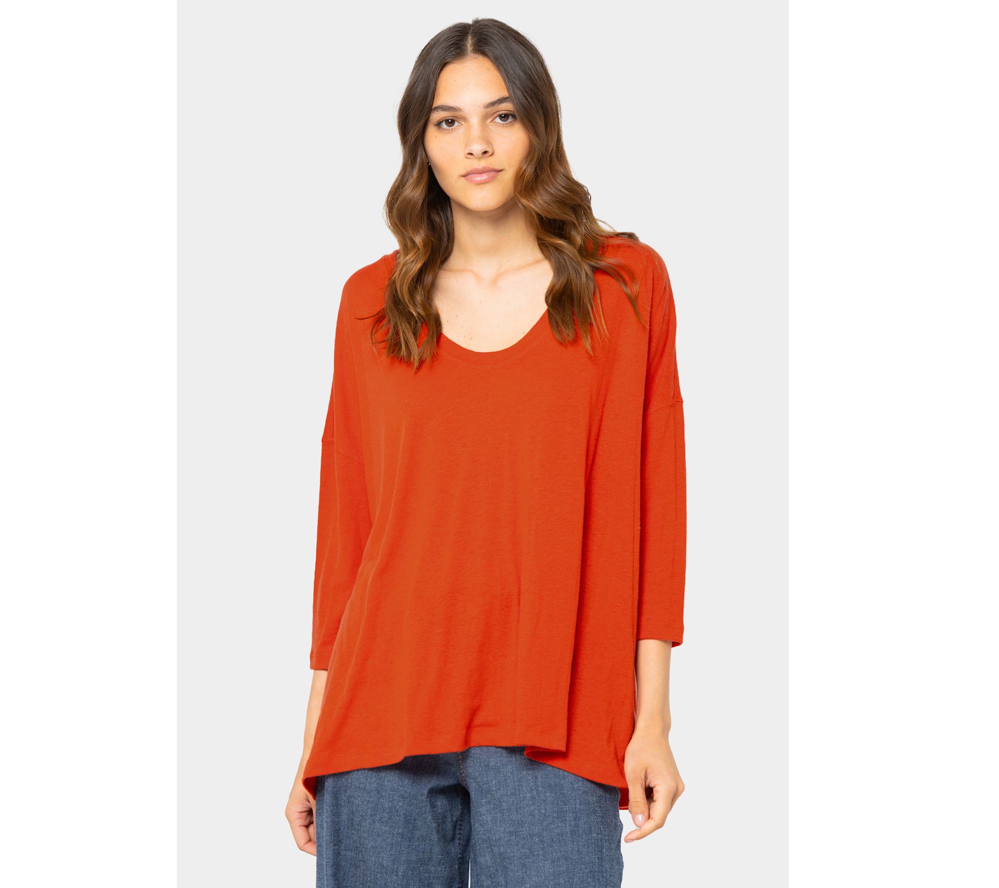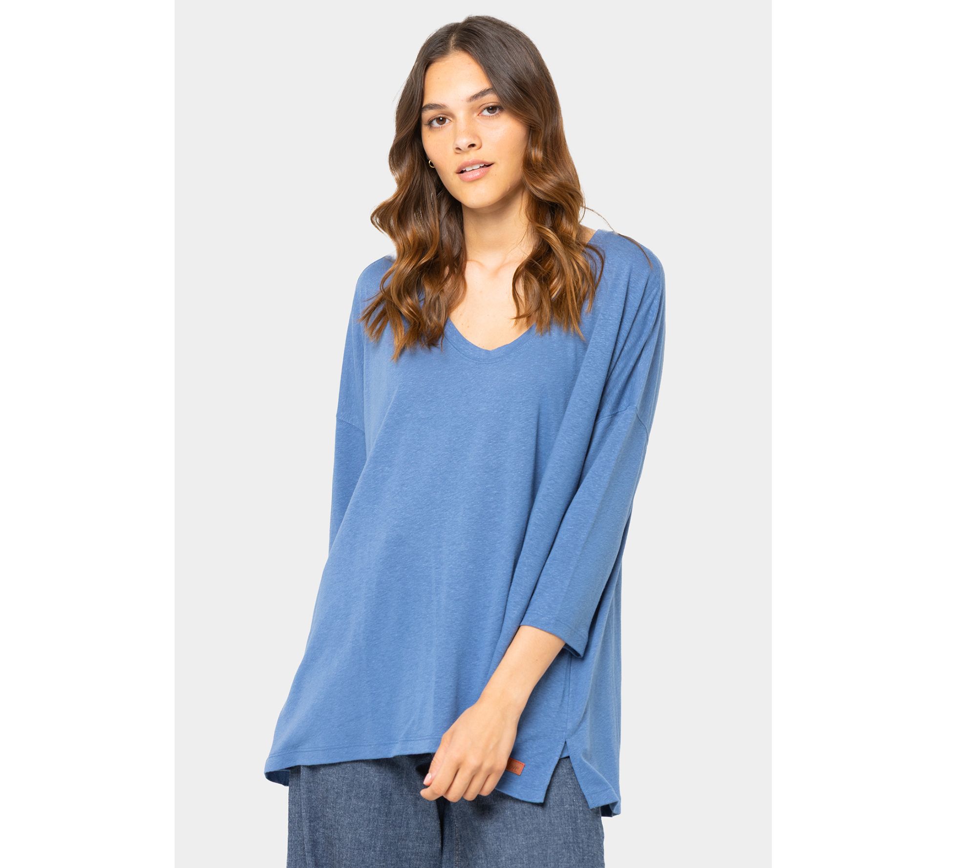 • Features: soft V-neckline, 3/4-length sleeves, boxy shape, drop-shoulder design, hi-low hem, side slits, Love leather patch at hem