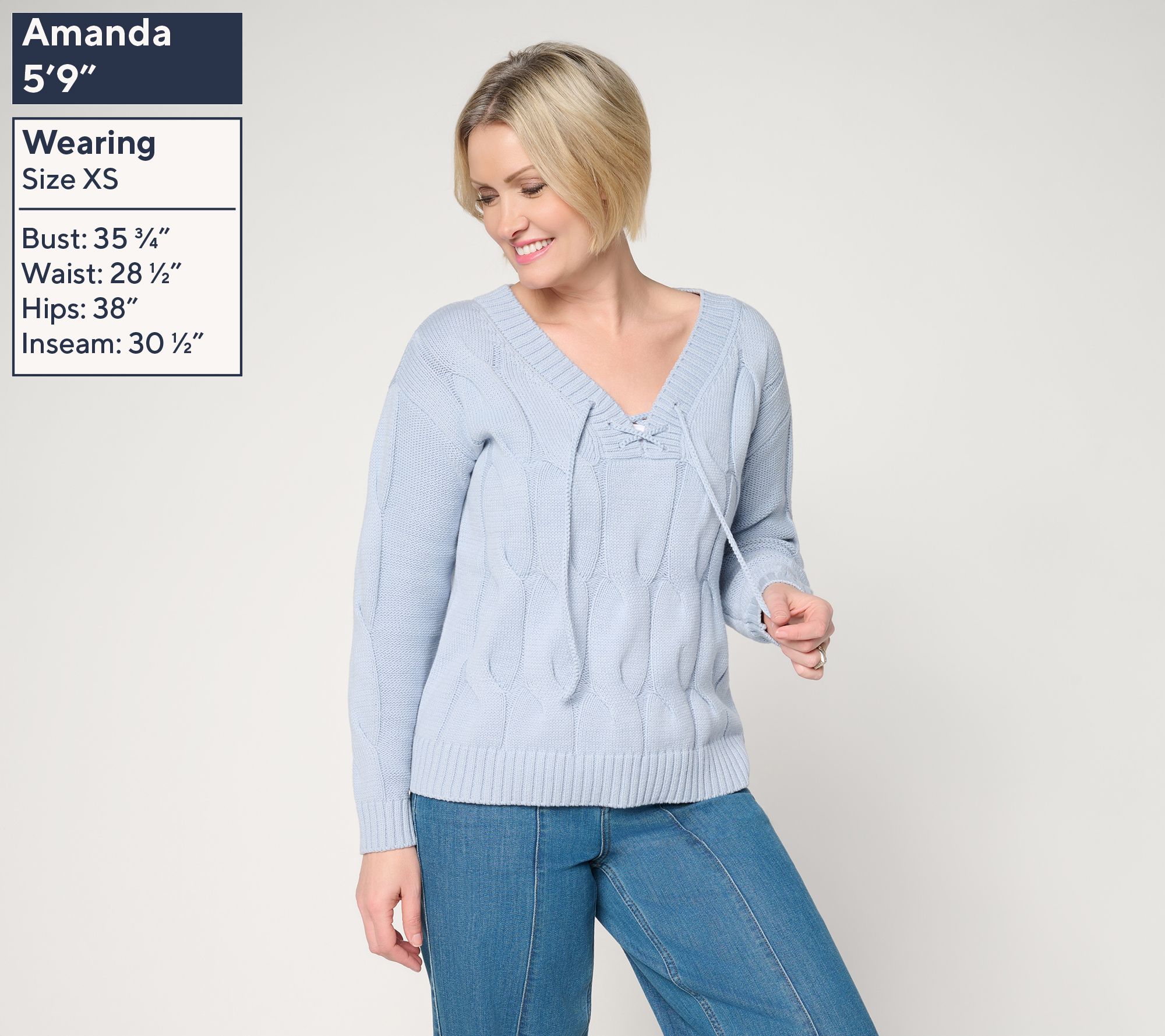 • Features: V-neck, lace-up drawcord at neckline, classic cable at body, reverse jersey sleeve with one row of cable, drop shoulder, long sleeves, ribbed detail at neckline, sleeve cuff, and bottom hem