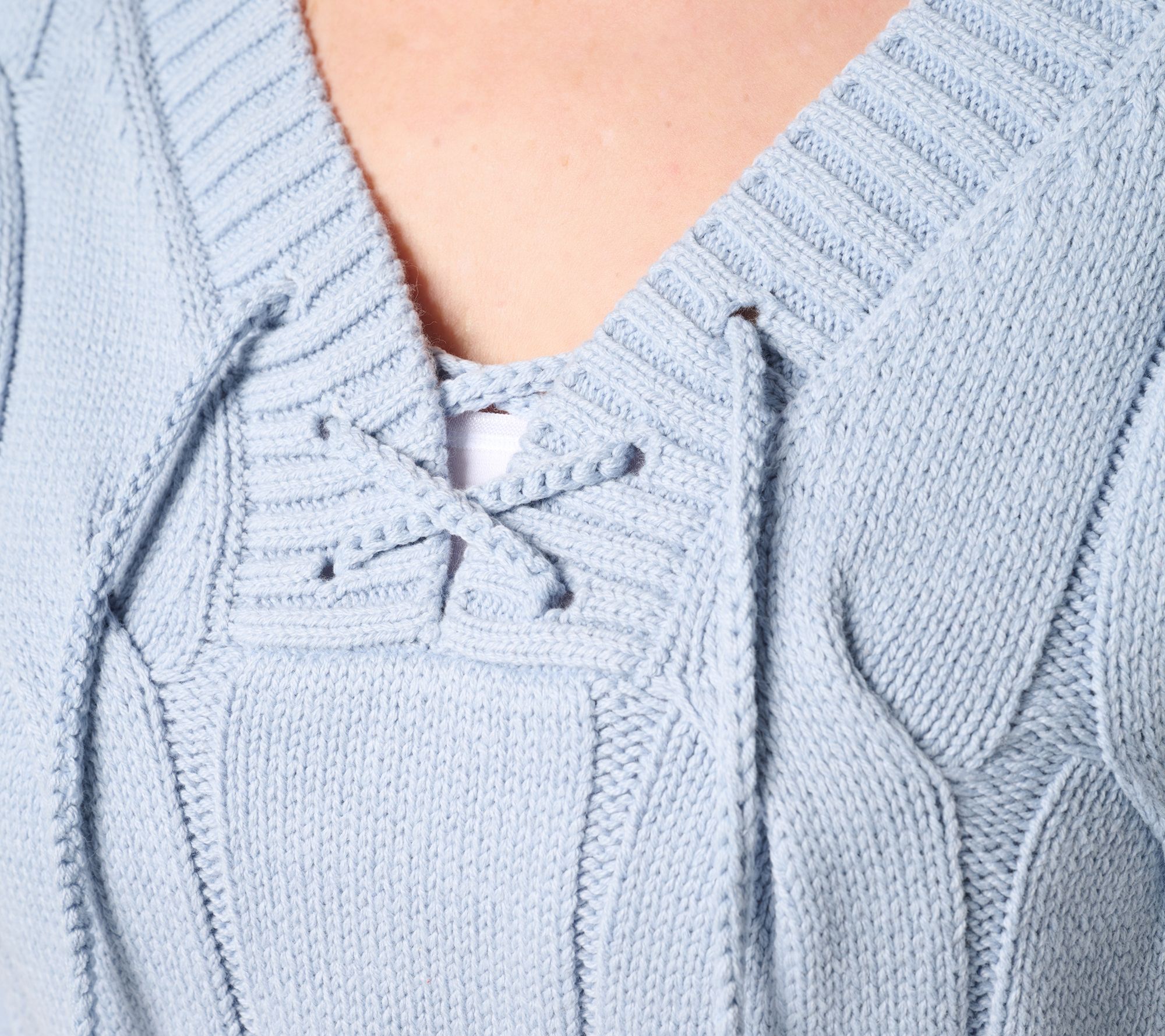 "As Is" Peace Love World V-Neck Lace Up Cable Sweater