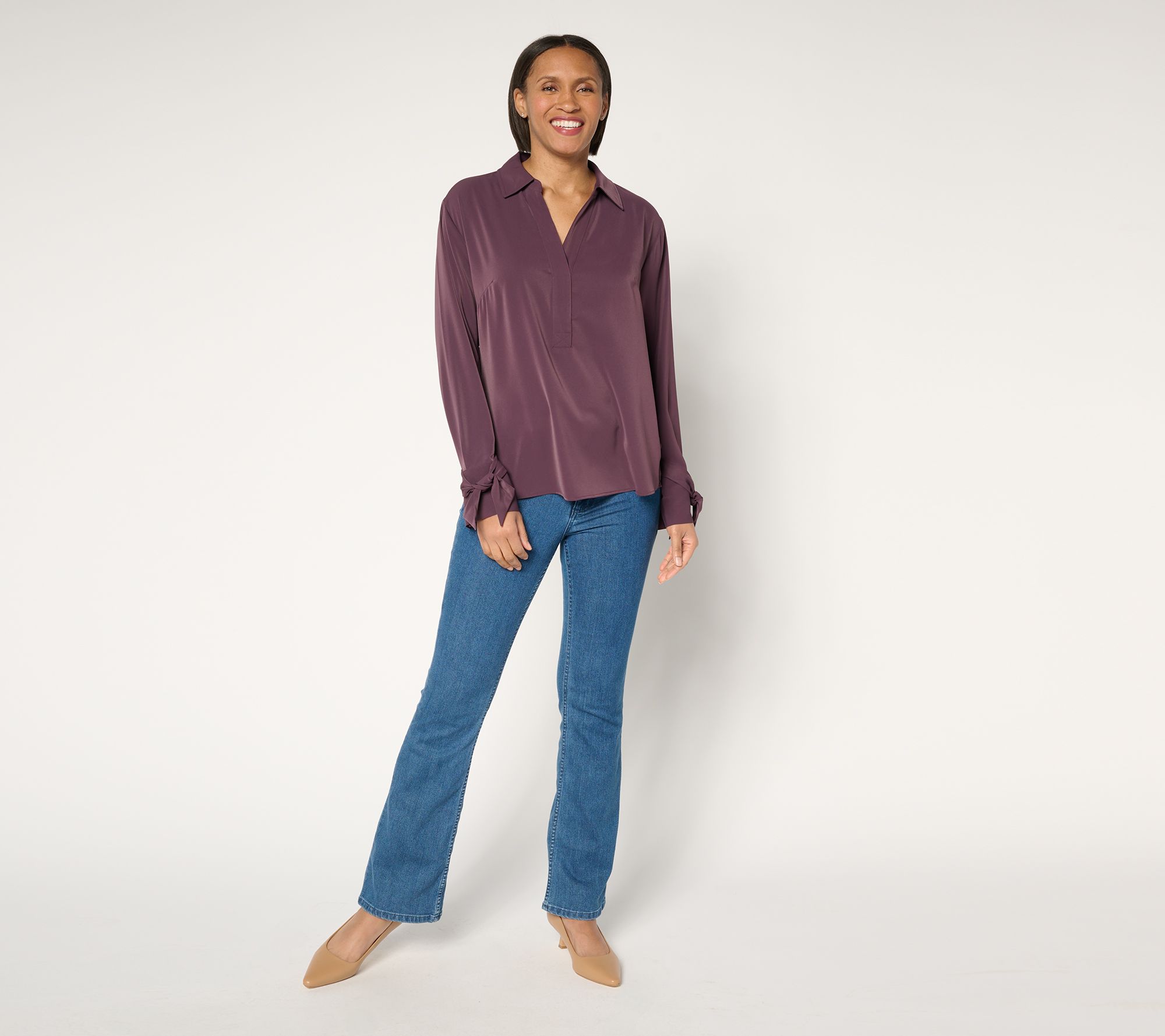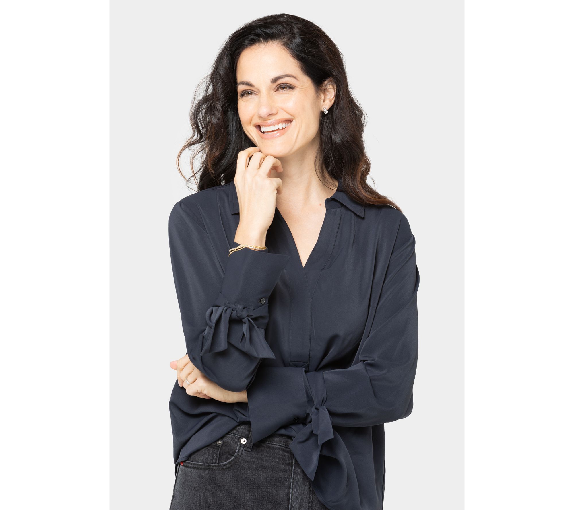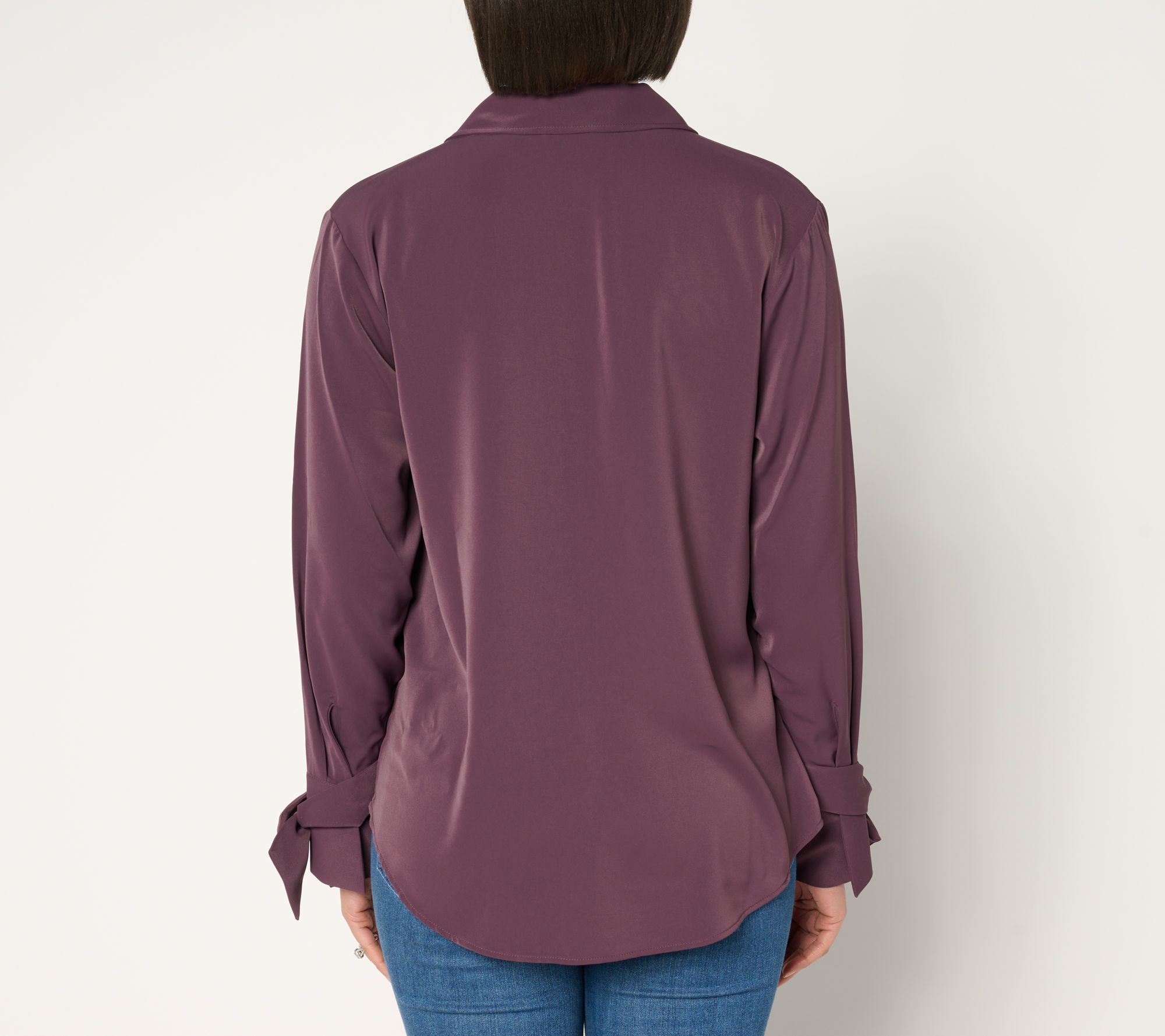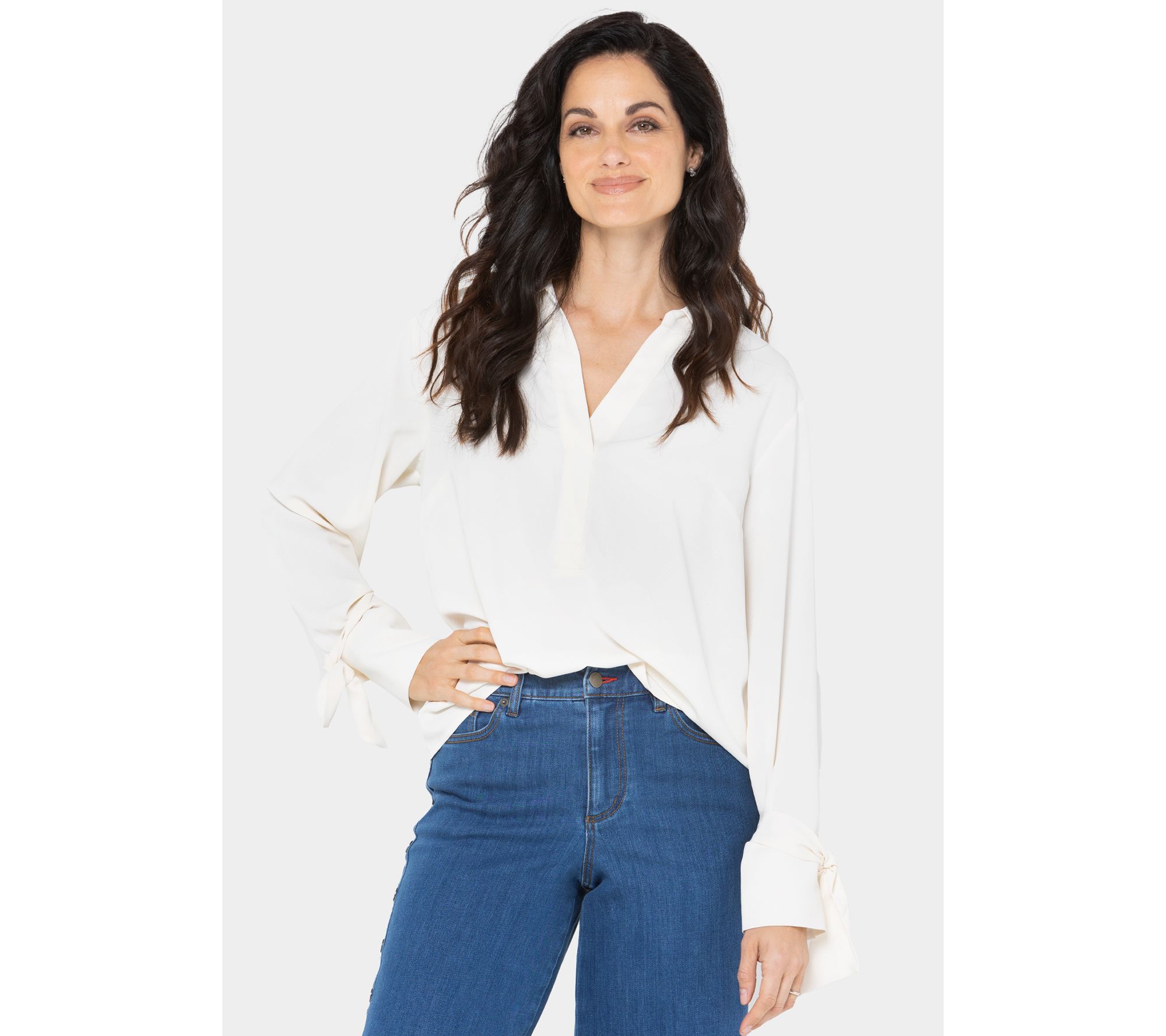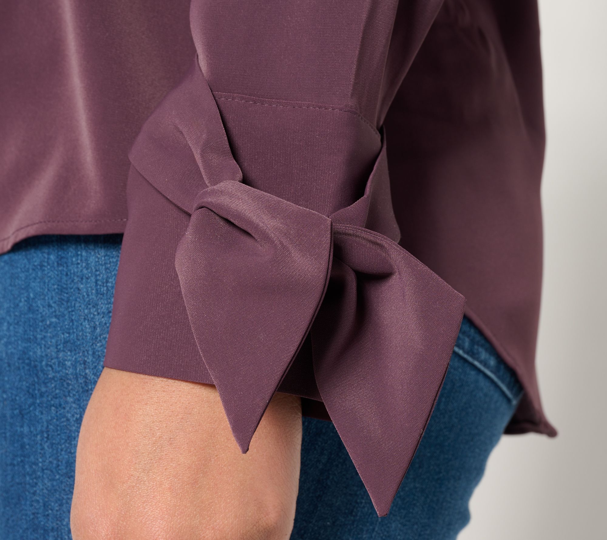 • Features: Y-neckline, bow sleeve detail, high-low curved hem, one button on cuff
