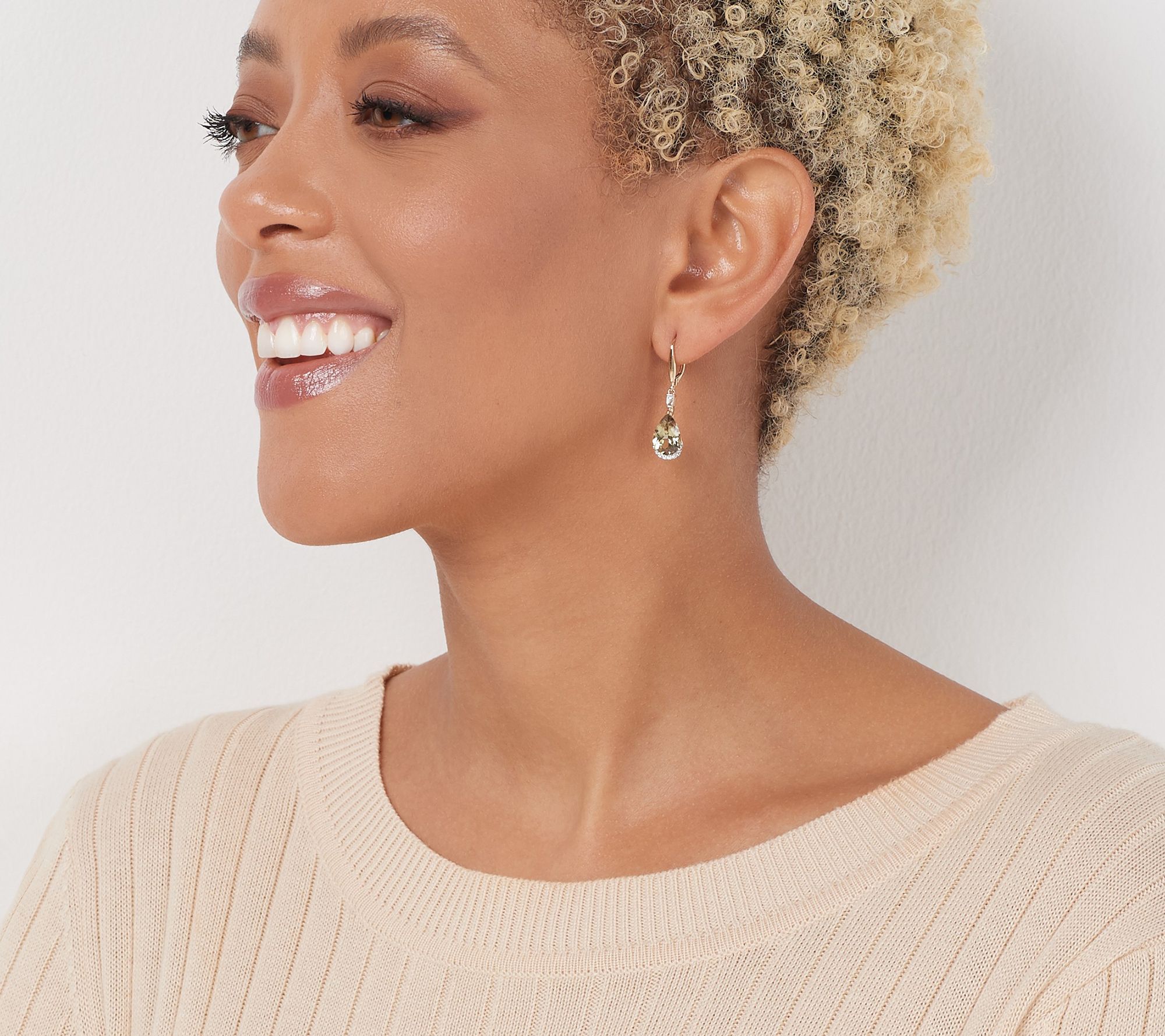 Pear-shaped csarite diaspore gemstones (accented by white diamonds on the top and bottom) steal the spotlight on these daring drop earrings.