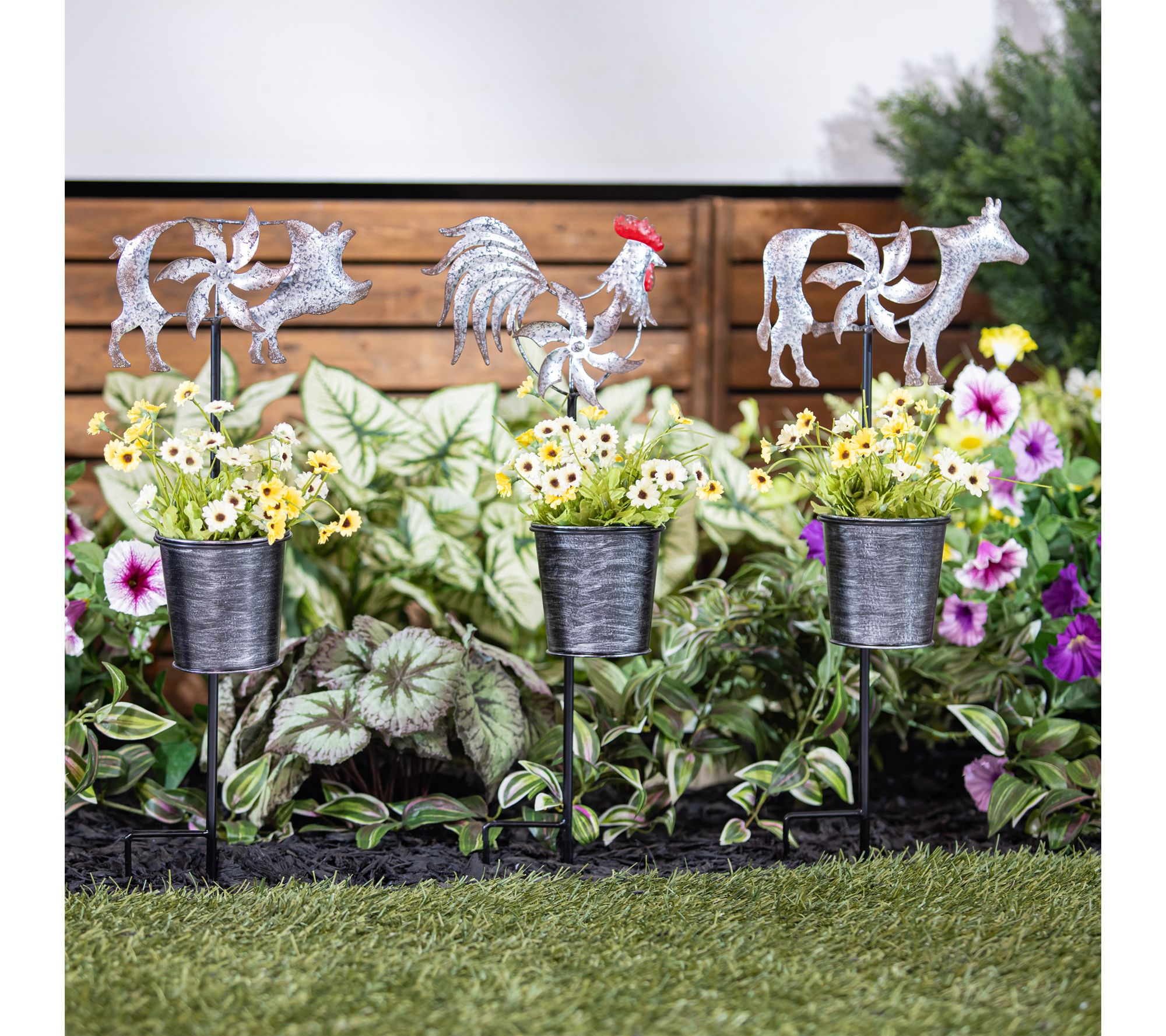 "As Is" Plow & Hearth Set of 3 Barnyard Animal Stakes w/ Mini Spinners