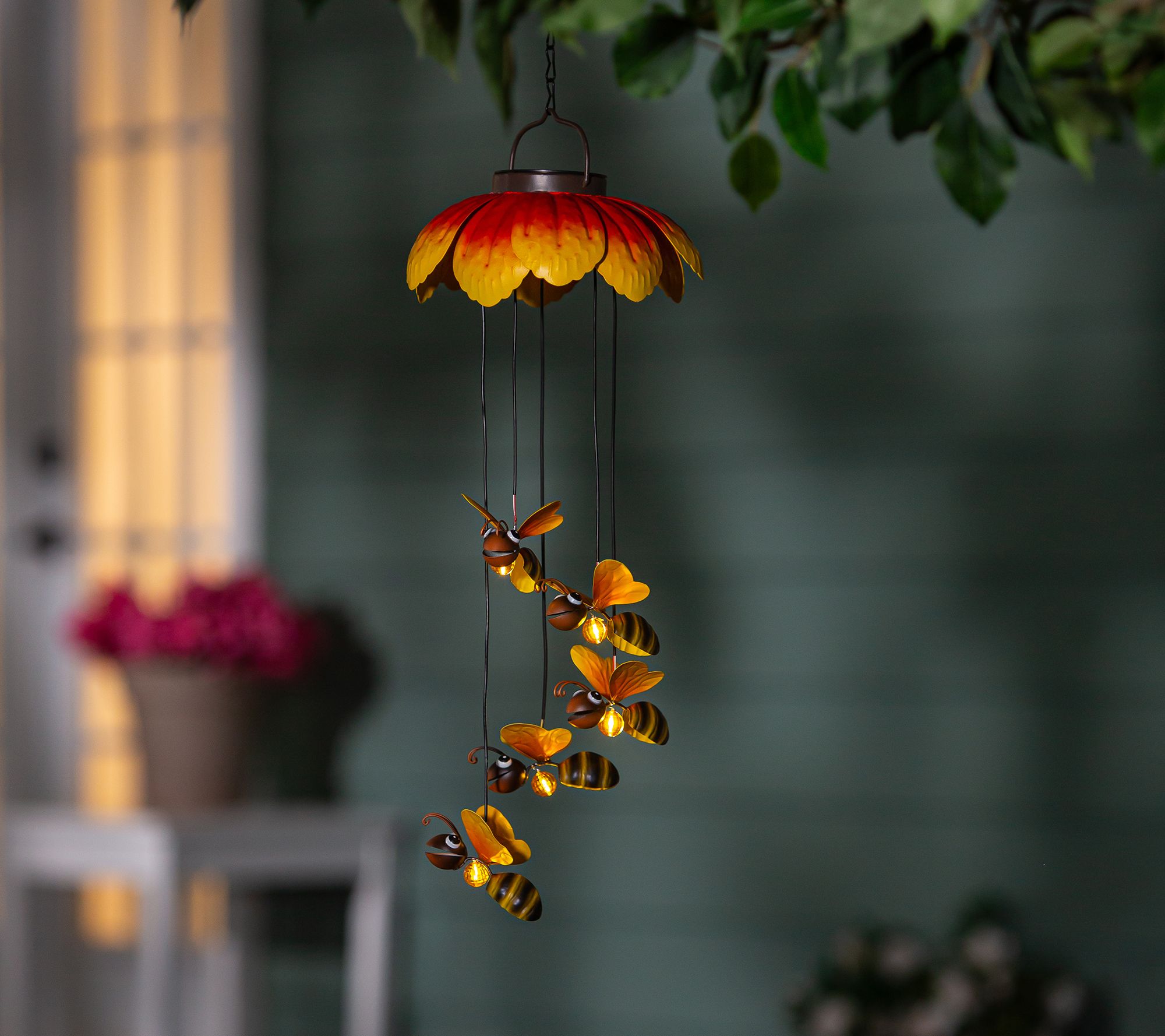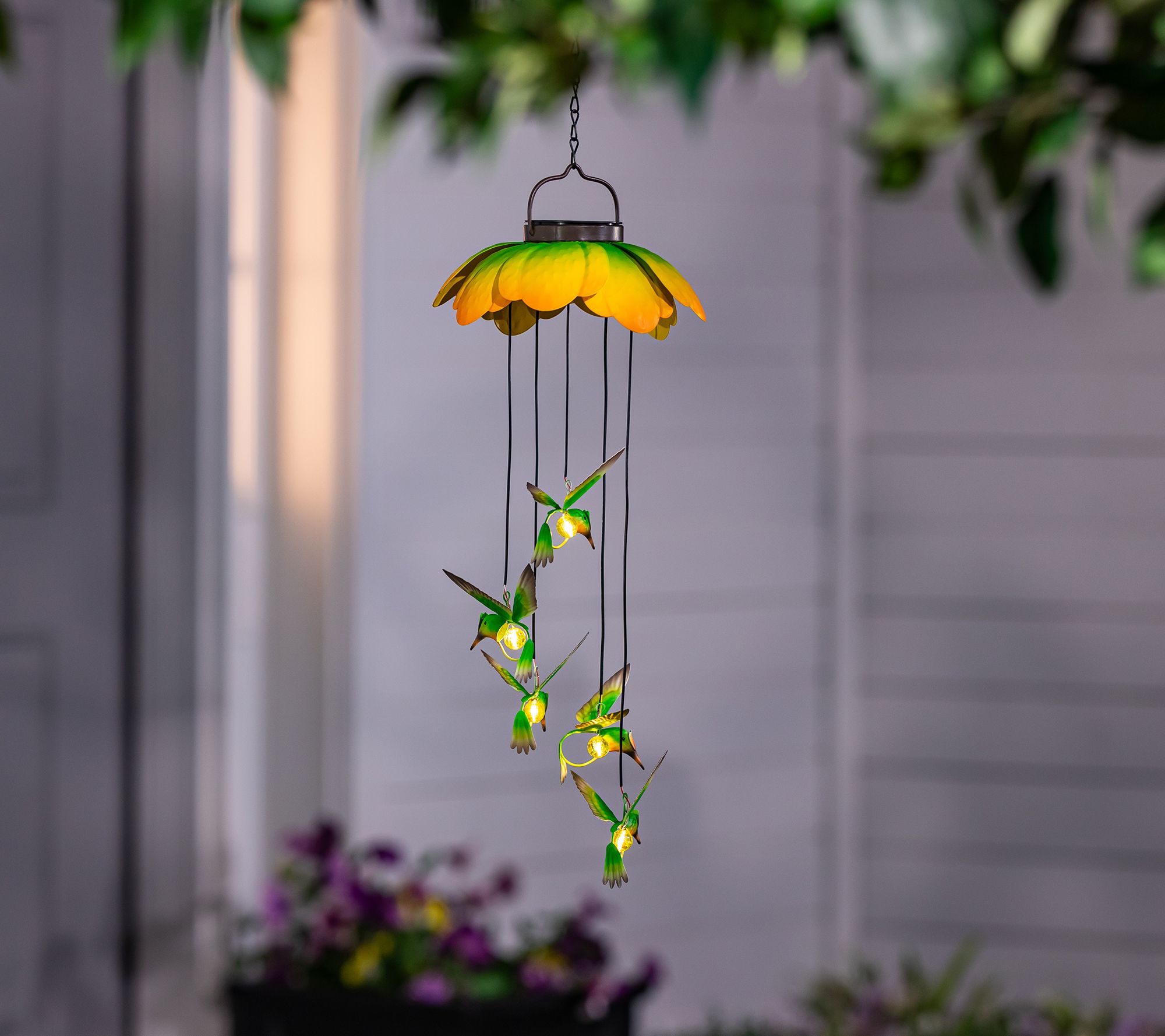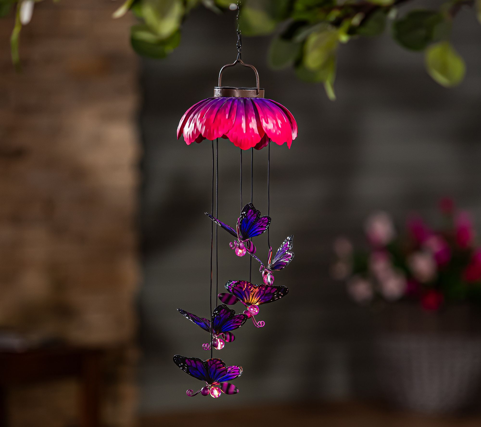 How does your garden grow? With colorful surprises -- like this vibrant garden mobile -- that draw visitors into the magic. Solar-powered LED light illuminates the dangling winged creatures, giving guests a reason to linger on the porch or patio well past sunset. From Plow & Hearth.