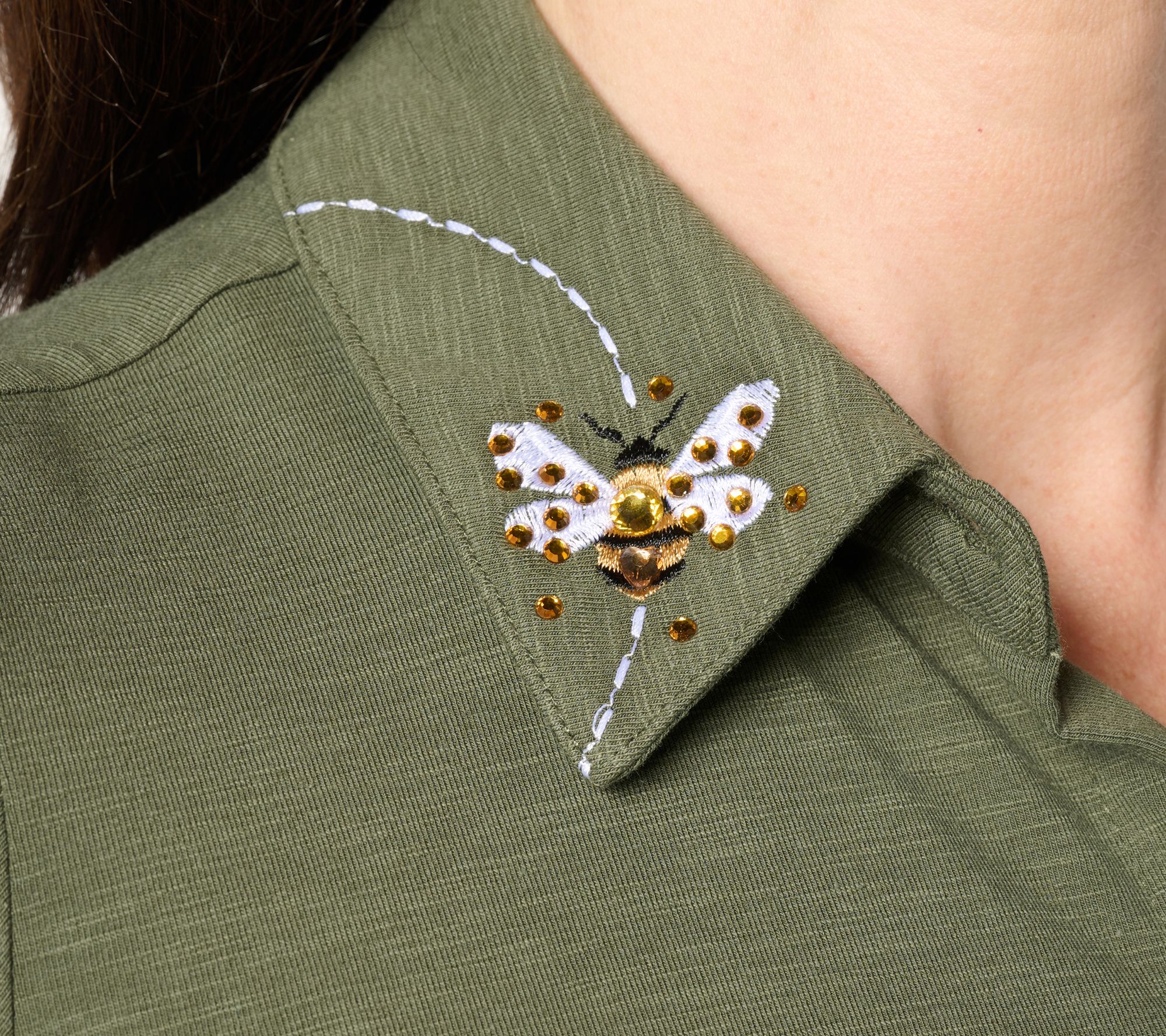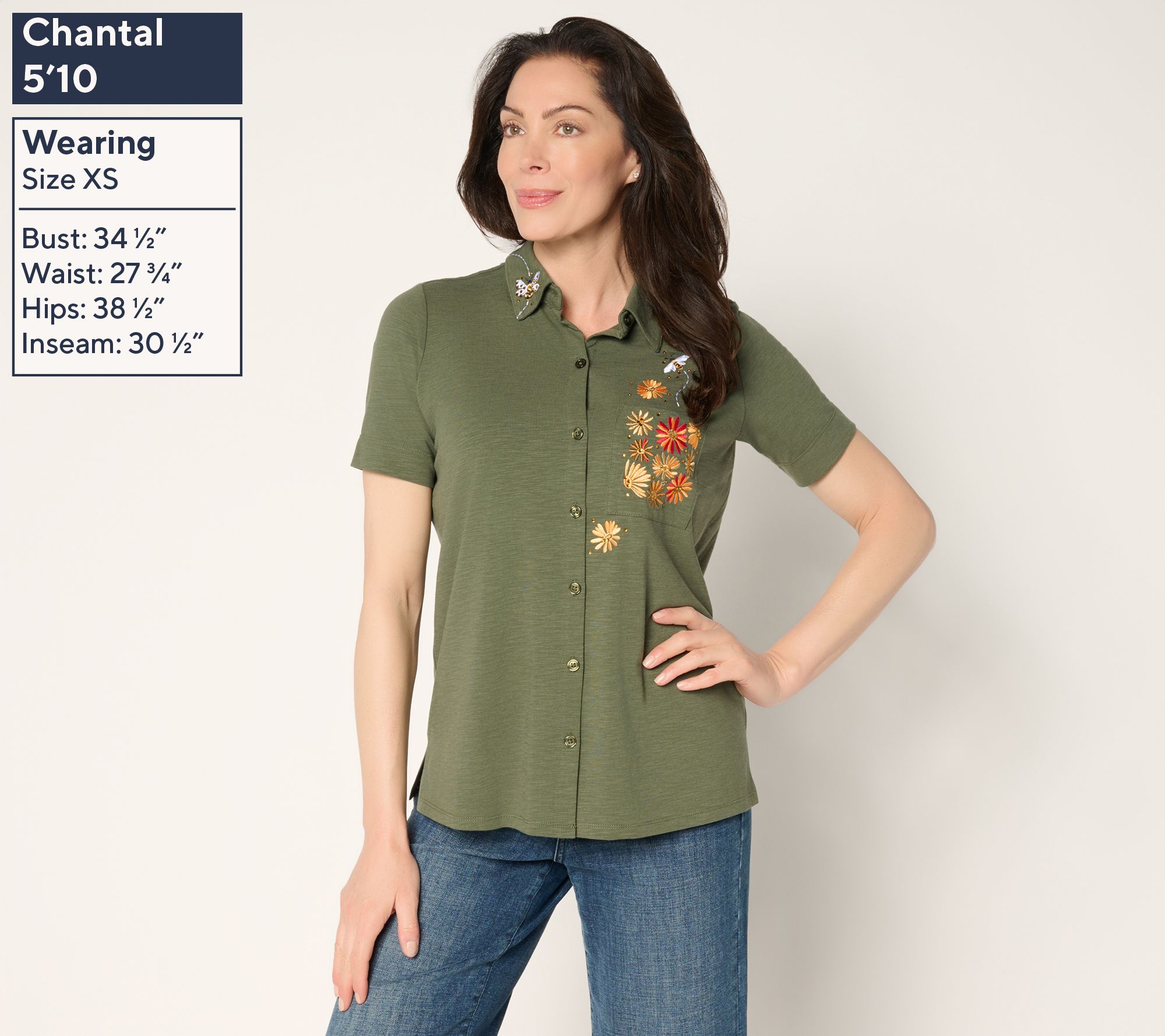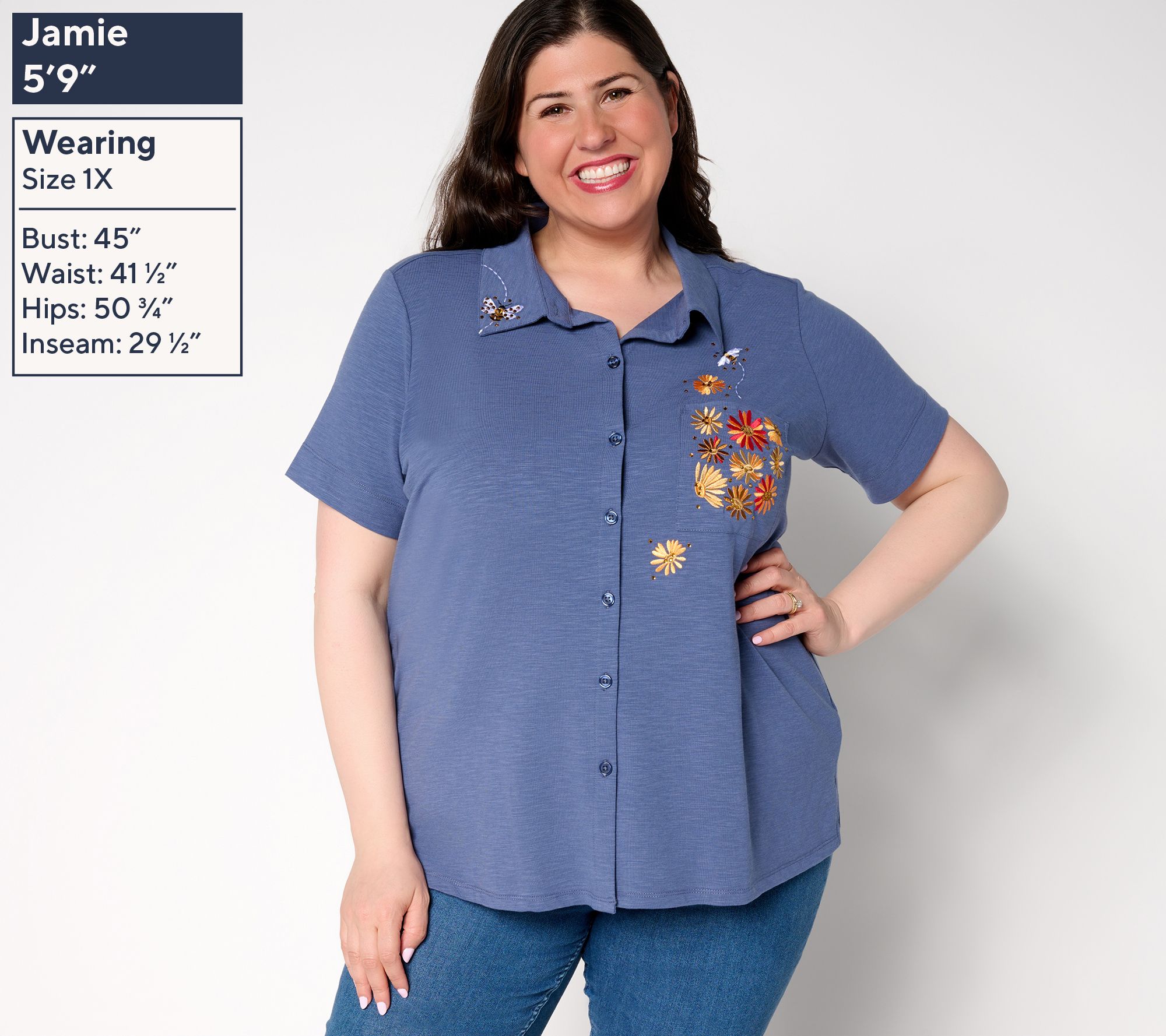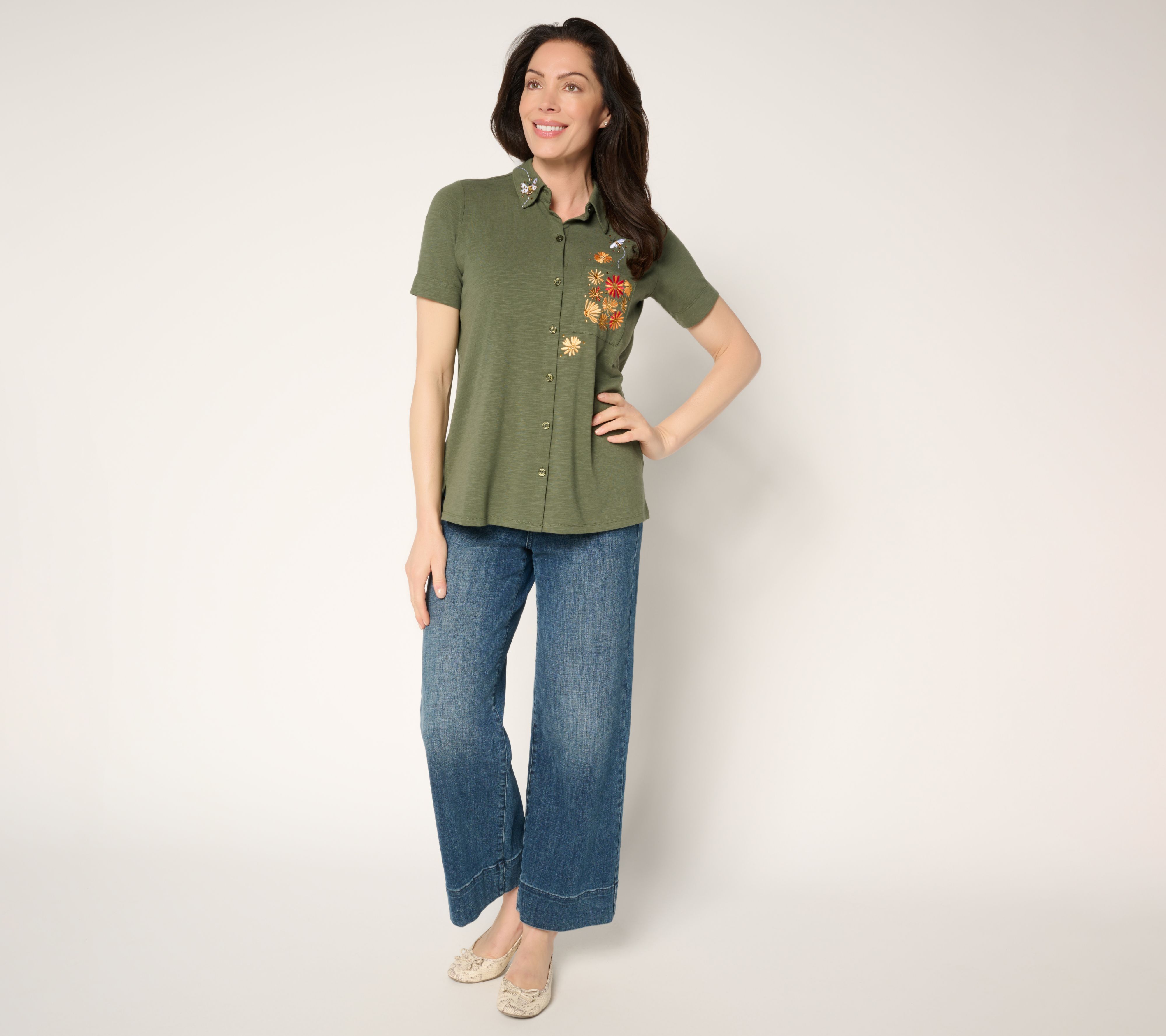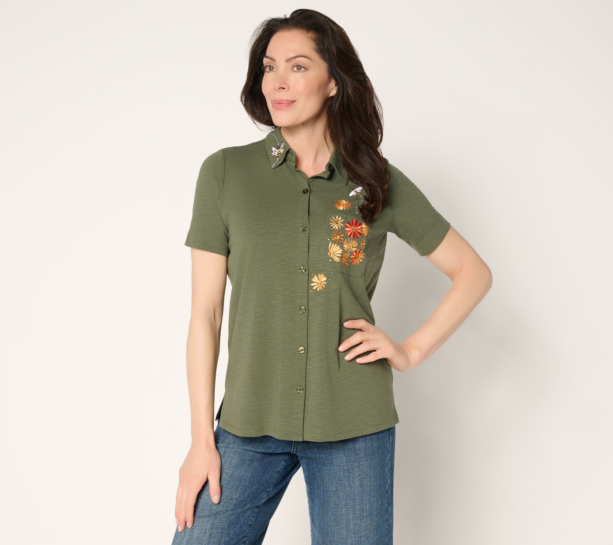 Button up a little fun as you breeze through busy days or brunch with friends in this cheerful button-front shirt. It's a happy match for jeans, shorts, or skirts -- tuck, tie, or layer as you please. From Quacker Factory®.