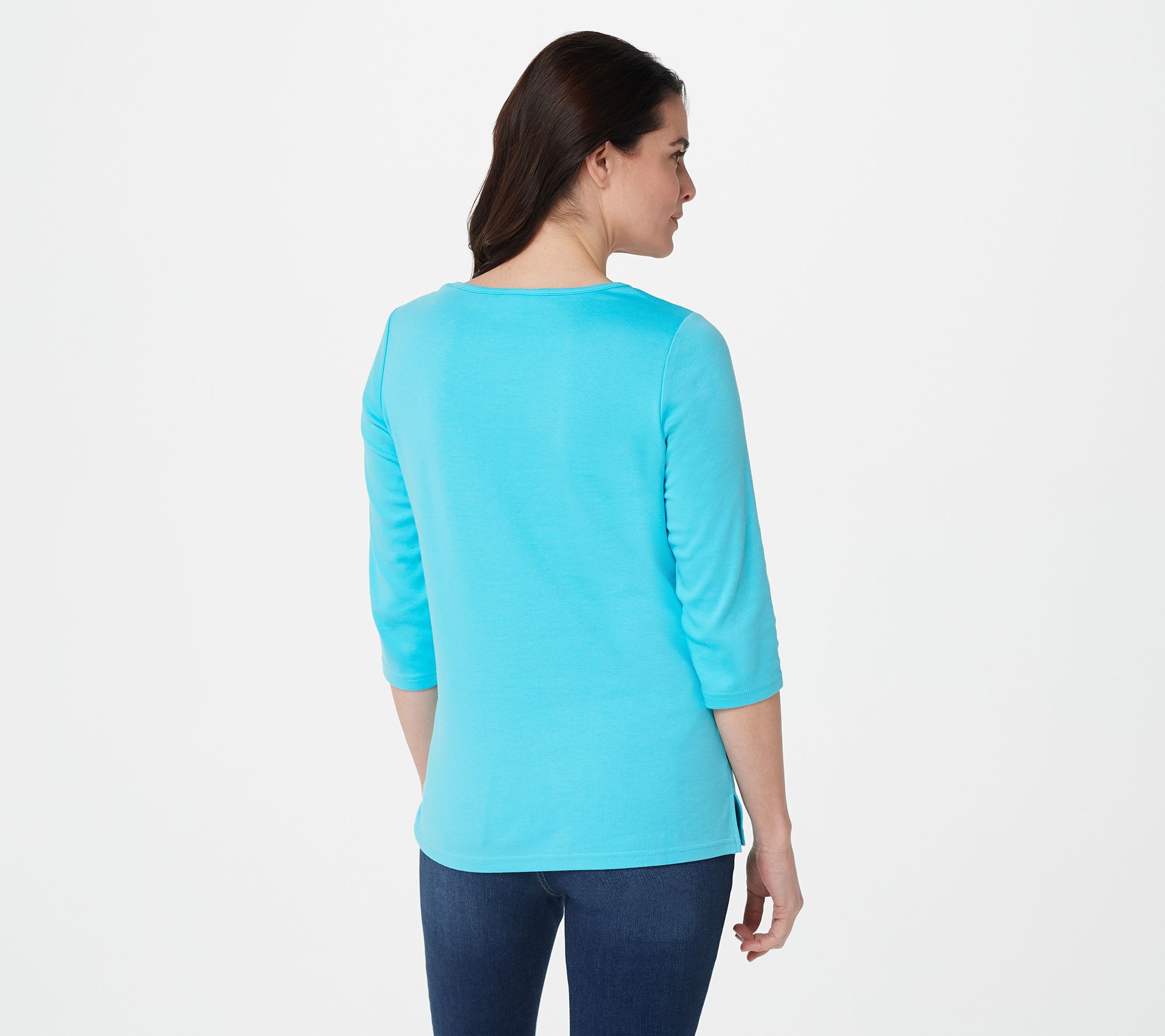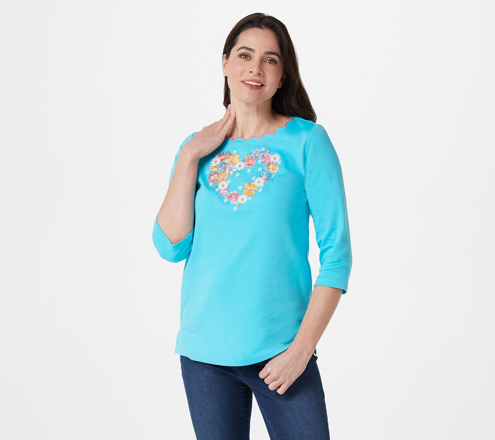 • Features: scalloped round neckline, front embroidery motif with heart-set stones, side slits, 3/4-length sleeves