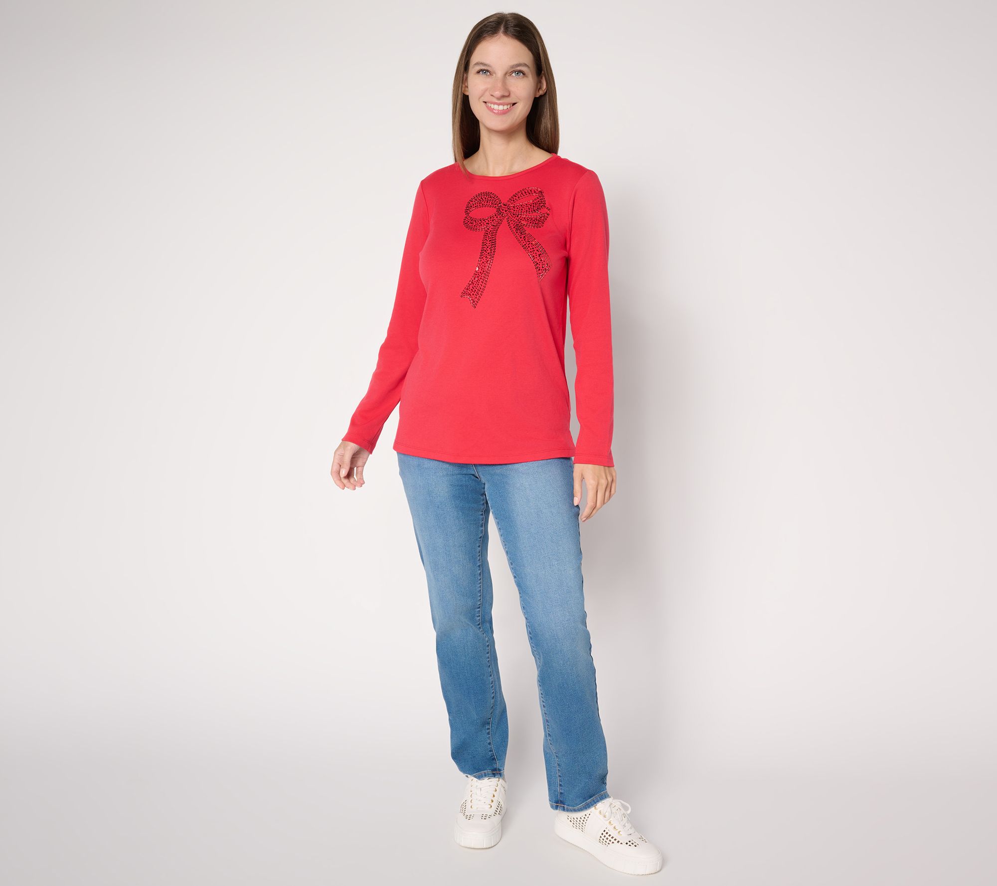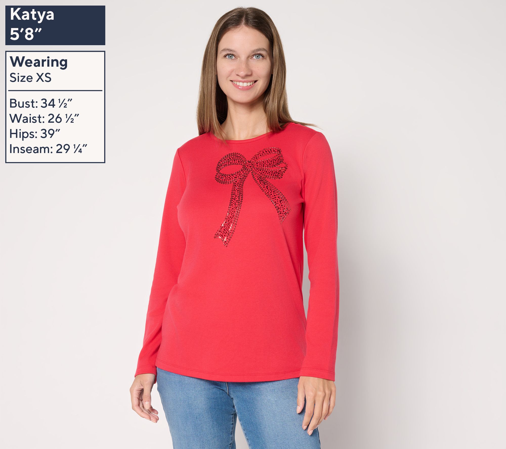 You've got your holiday look all wrapped up with this bow-licious bateau neck top. Sweetly embellished with a double-loop bow, the soft knit top speaks to just how special you are. Keep the festive feel going and wear it for birthdays, anniversaries, or any milestone moments. From Quacker Factory®.