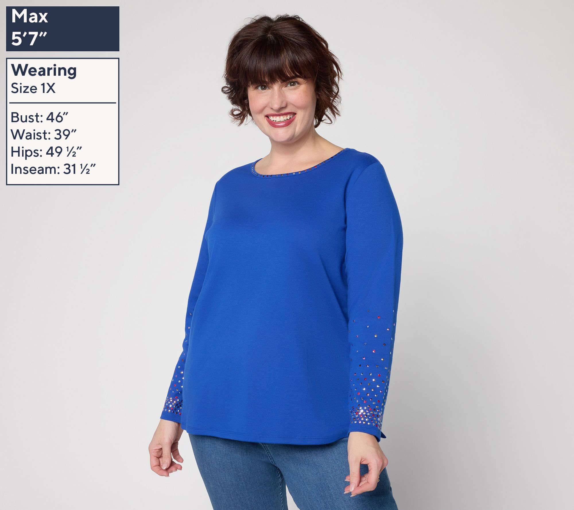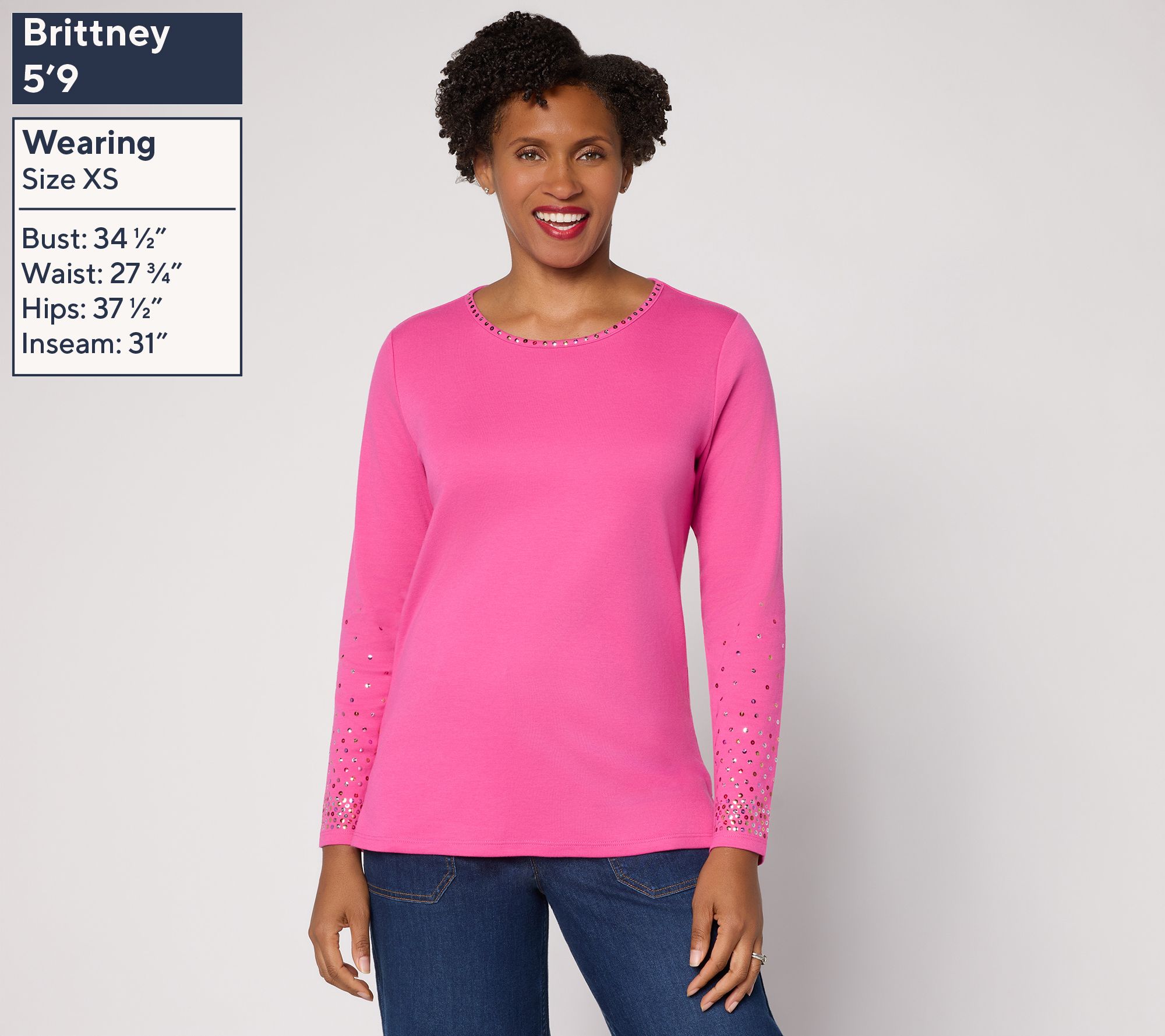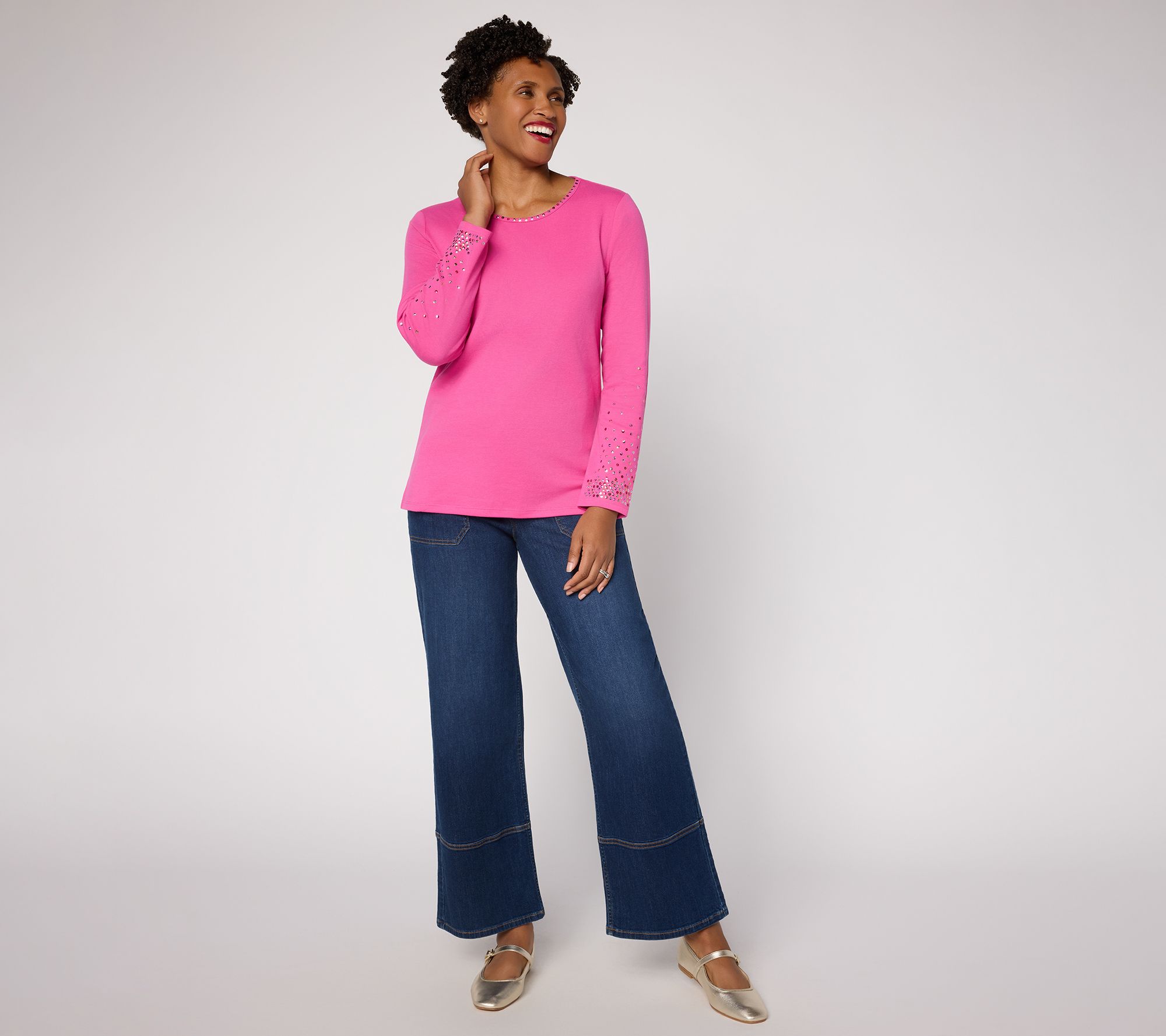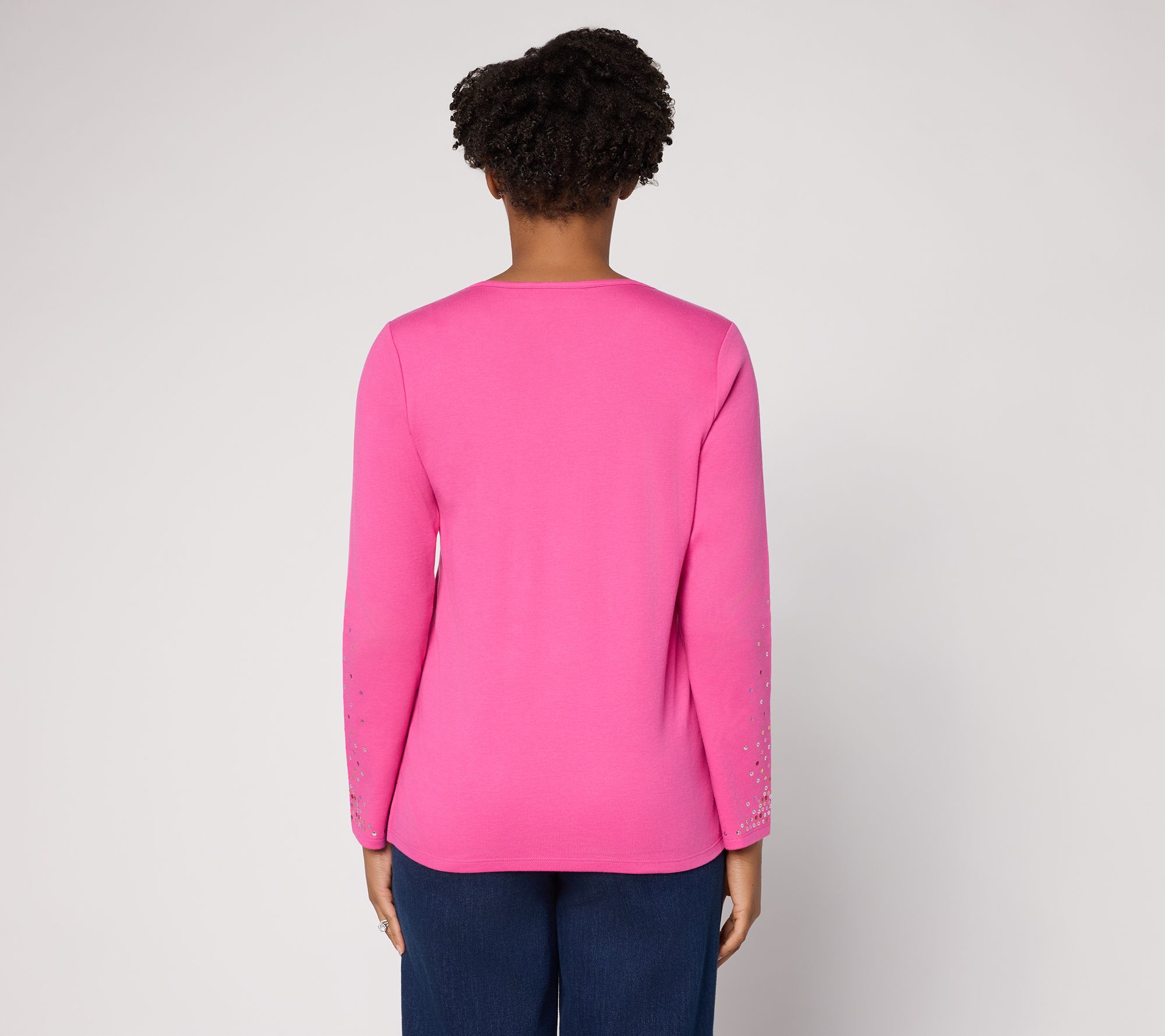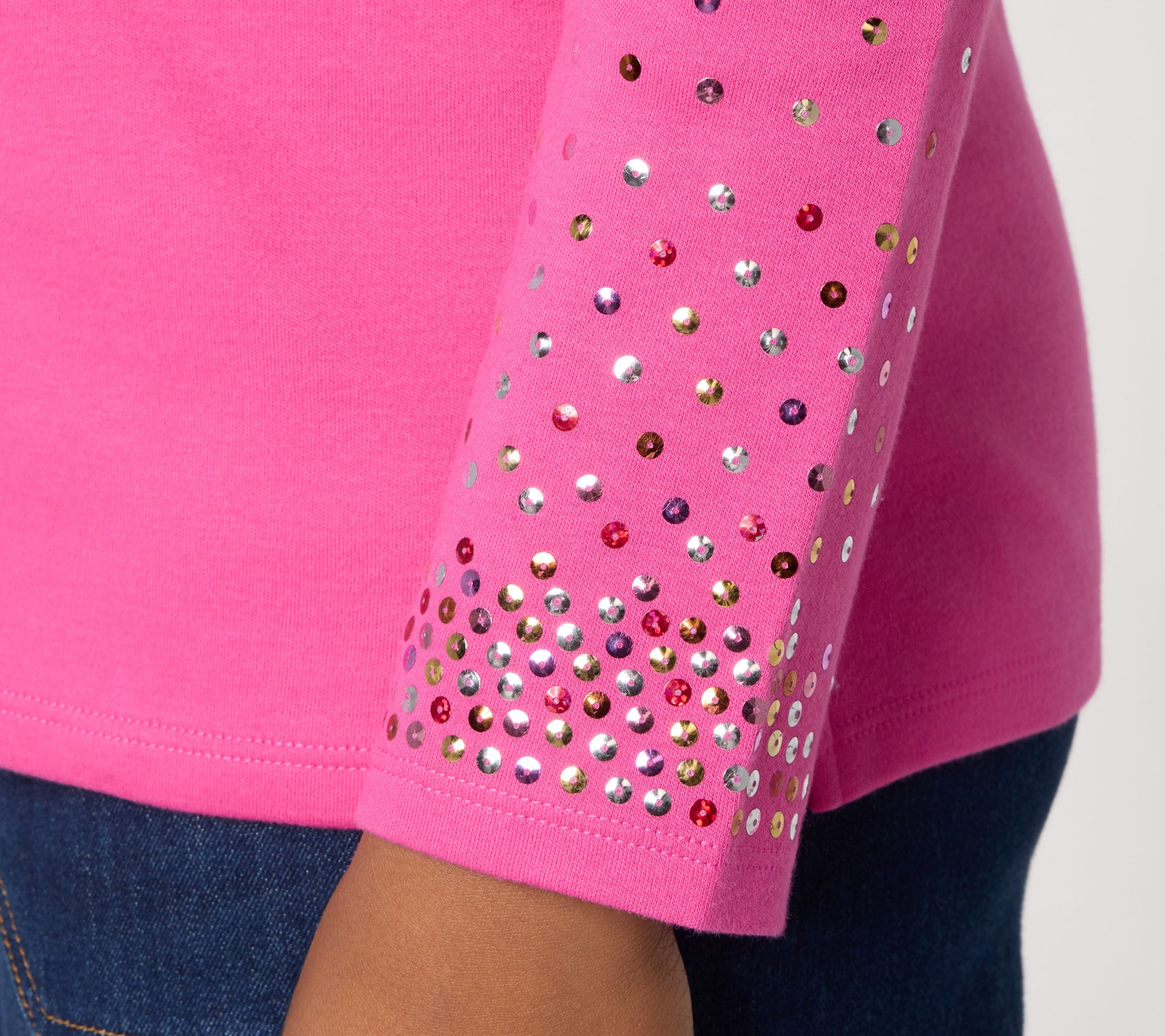 Dress up a laid-back afternoon or add some twinkle to a night out with this sequin-sleeve top. The classic round neck and straight hem keep it simple and versatile, while sparkly accents set the mood for celebration, whether you're sipping bubbly at brunch or catching up over dessert. From Quacker Factory®.