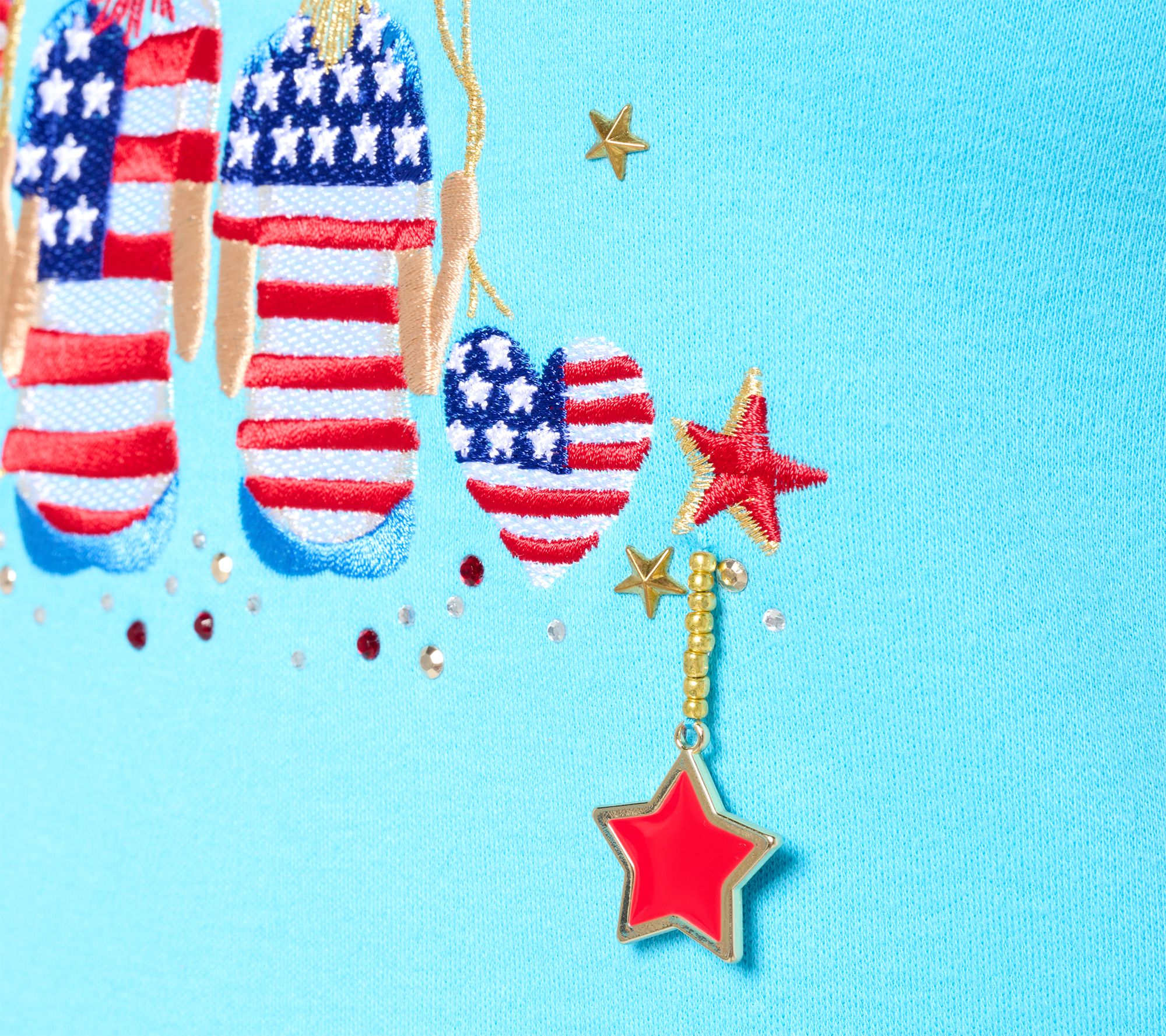 • Features: embroidered scene with dangling charm, crew neck, straight hem with side slits