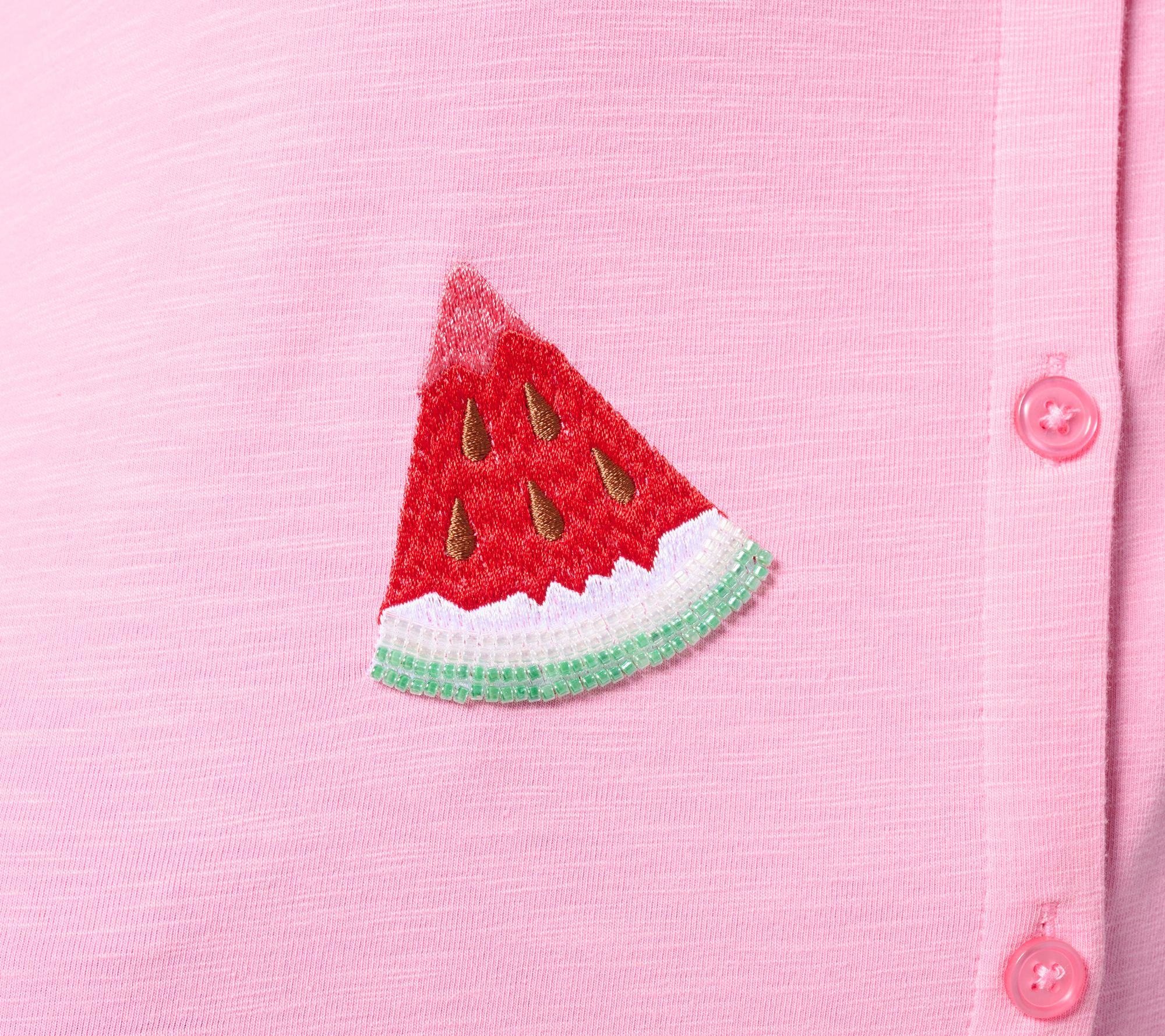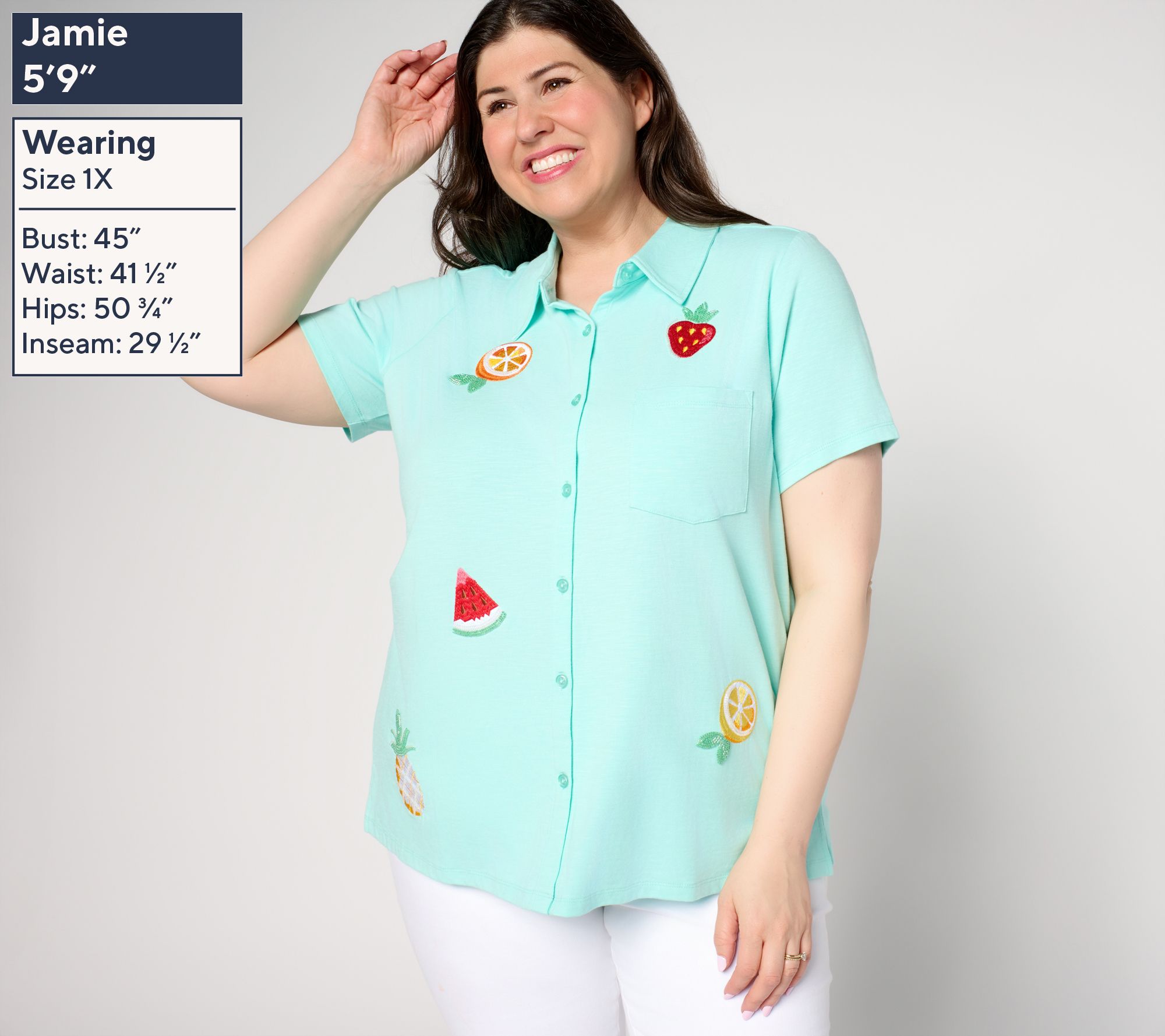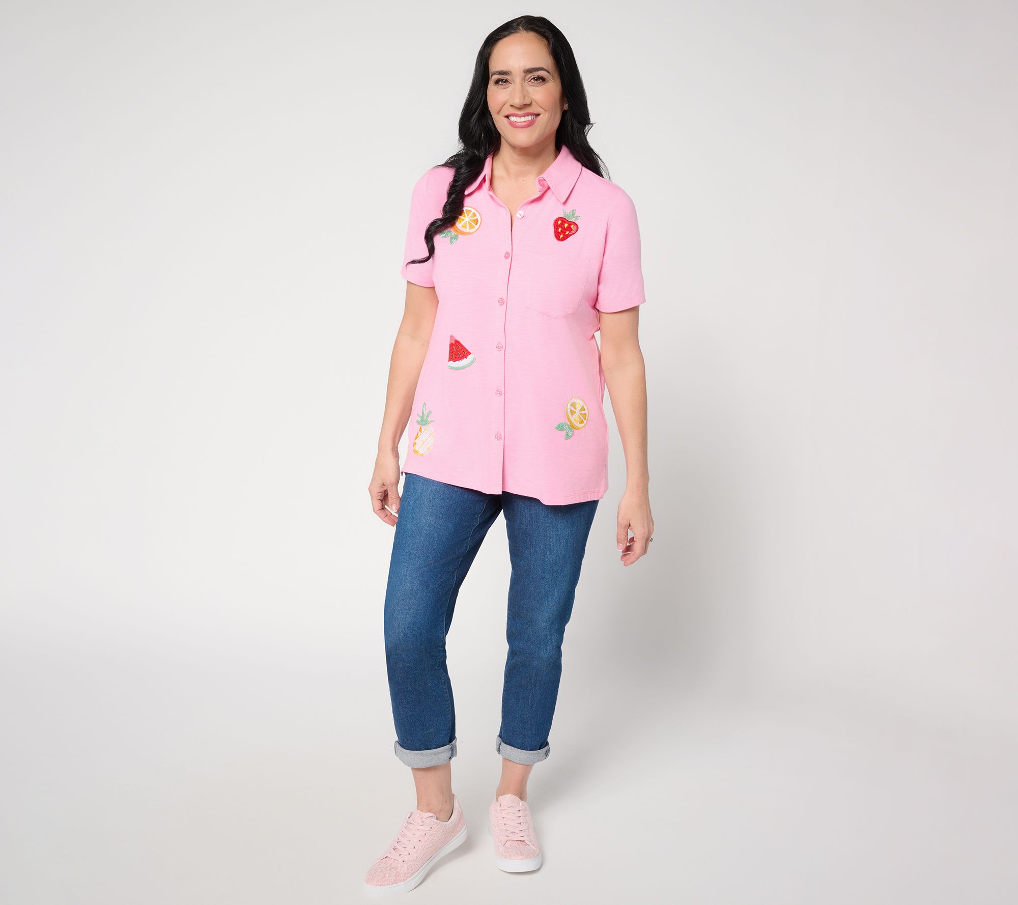 Cue the compliments when you spend the day in this tropical-themed camp shirt. The playful embroidered design and scattered embellishments invite a little sunshine wherever you go, while side slits and chest pockets keep things easy and breezy. From Quacker Factory®.