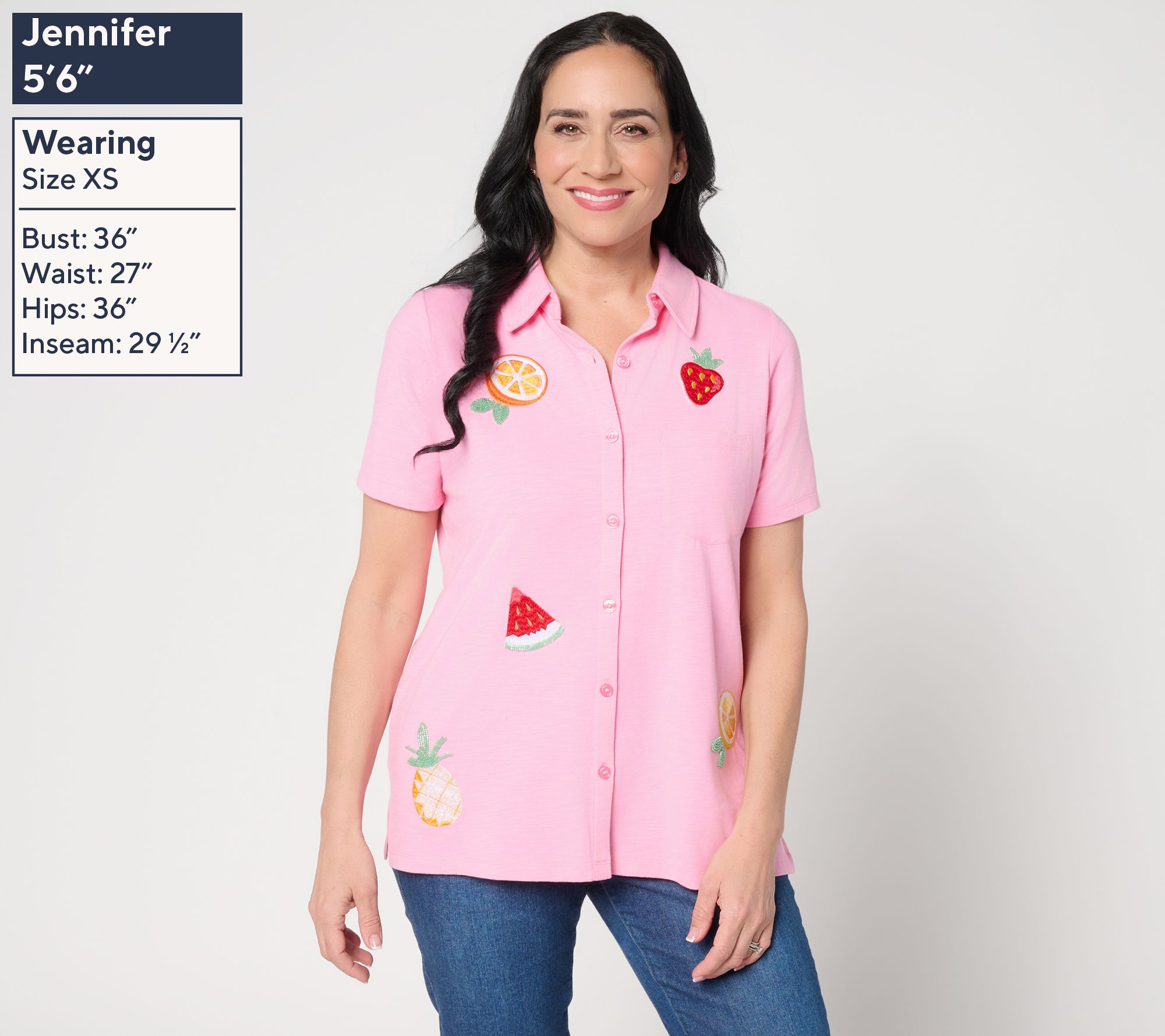 "As Is" Quacker Factory Cutie Fruity Embroid. Short Slv Camp Shirt