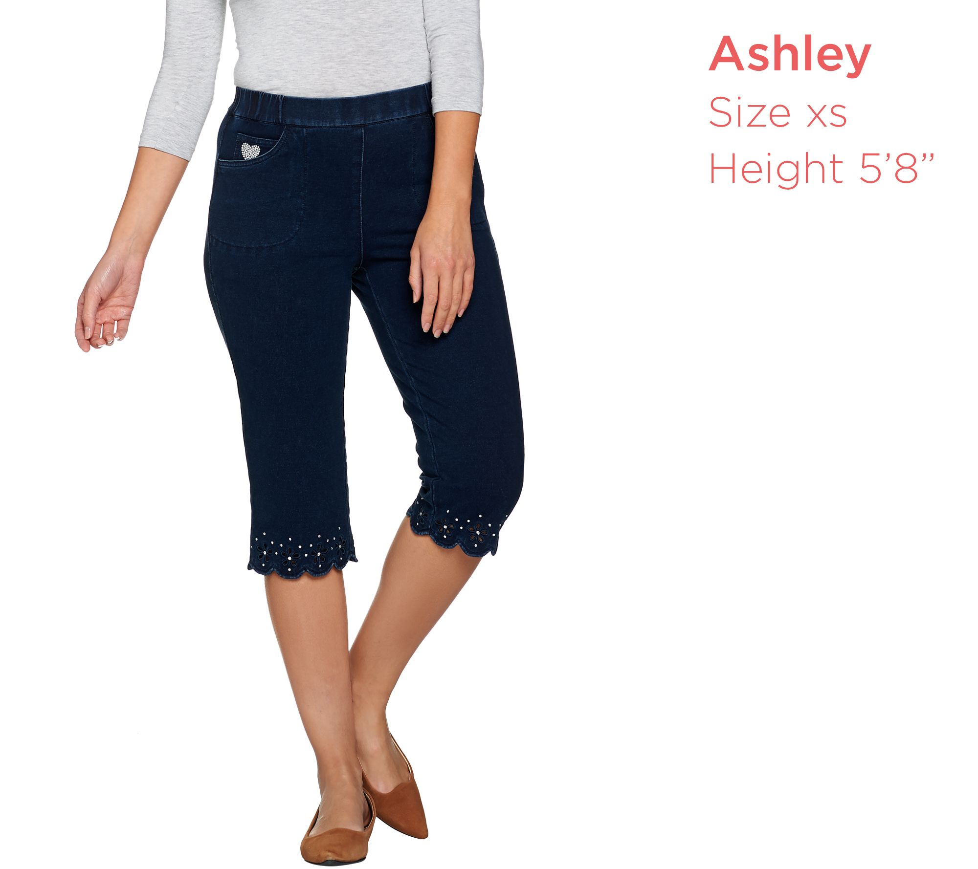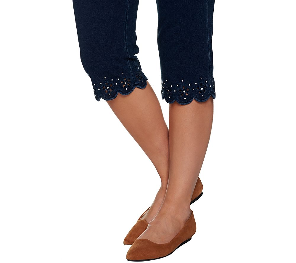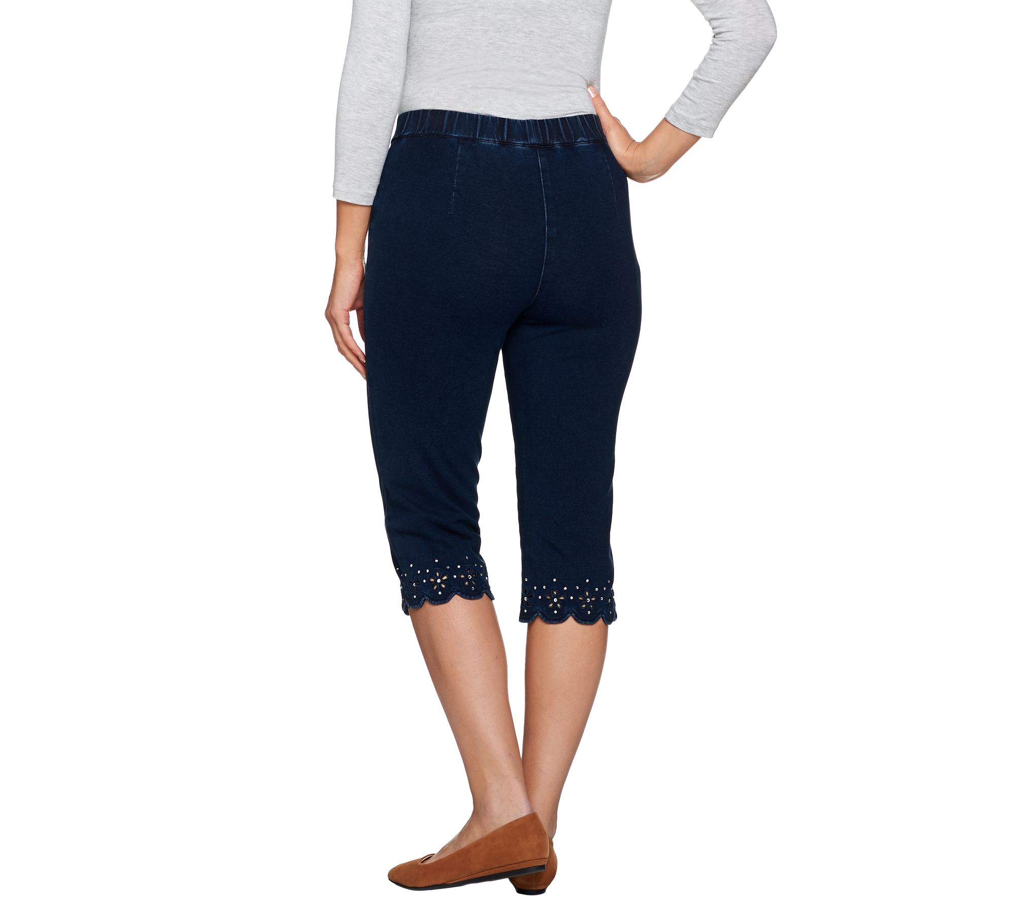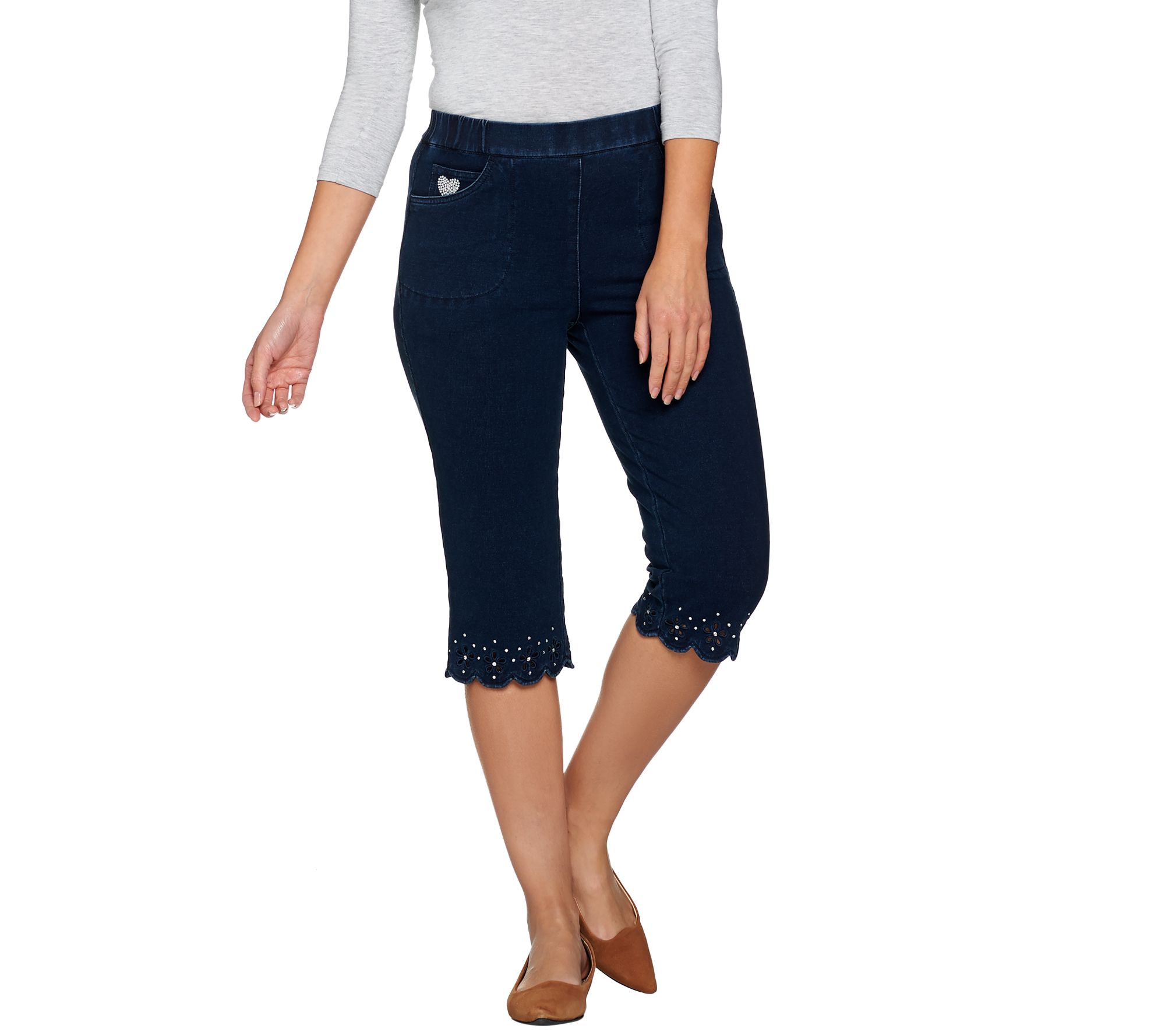 You'll also look cute and feel comfy when you wear these Quacker Factory DreamJeannes pedal pushers. The scalloped hem is decorated with eyelet and rhinestones for a darling design. From Quacker Factory(R).