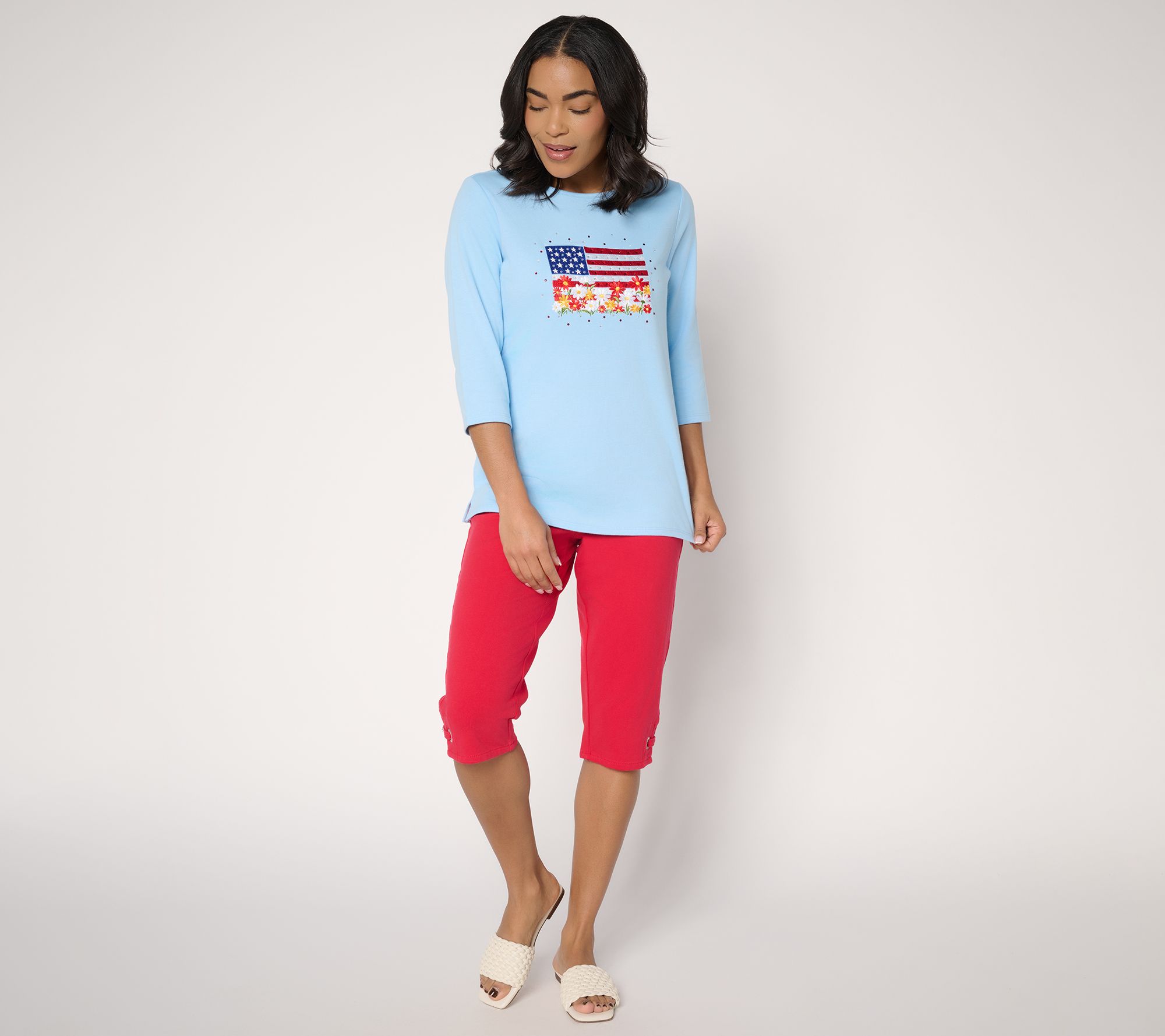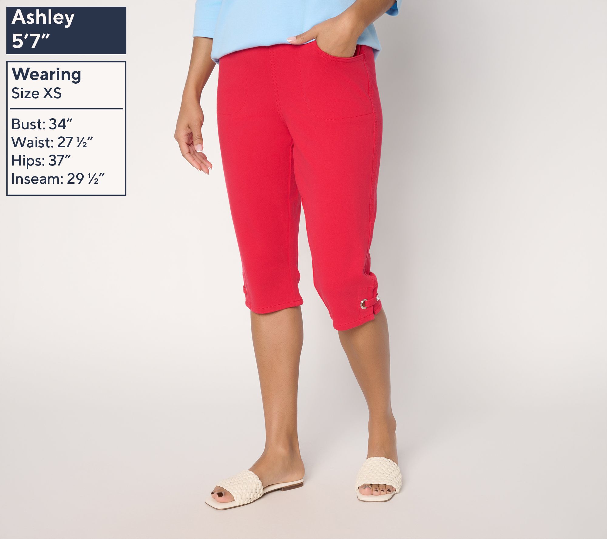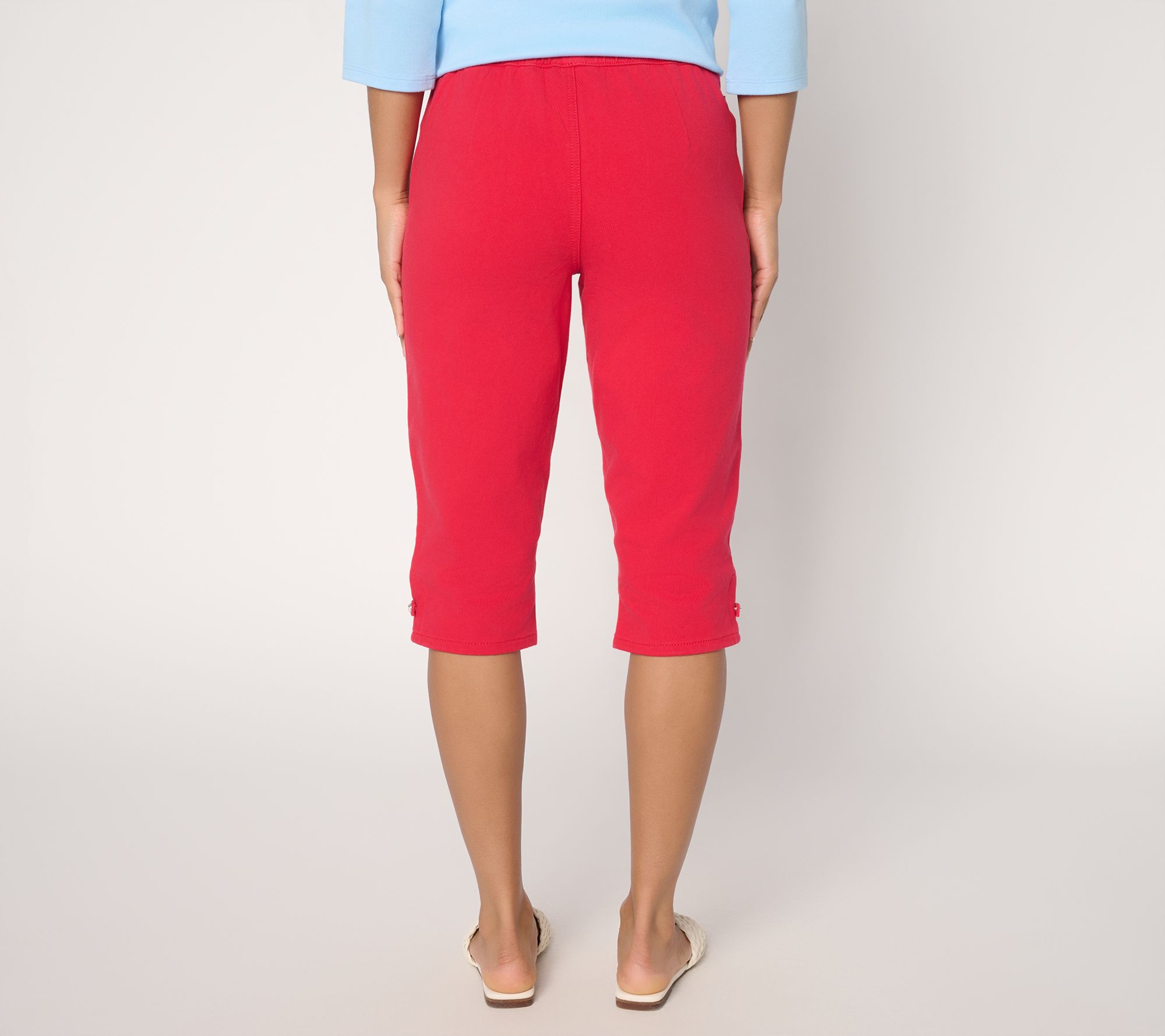 Comfy pedal pushers with side rhinestone grommet details will have everyone giving you the side eye (out of jealousy, of course). From Quacker Factory®.