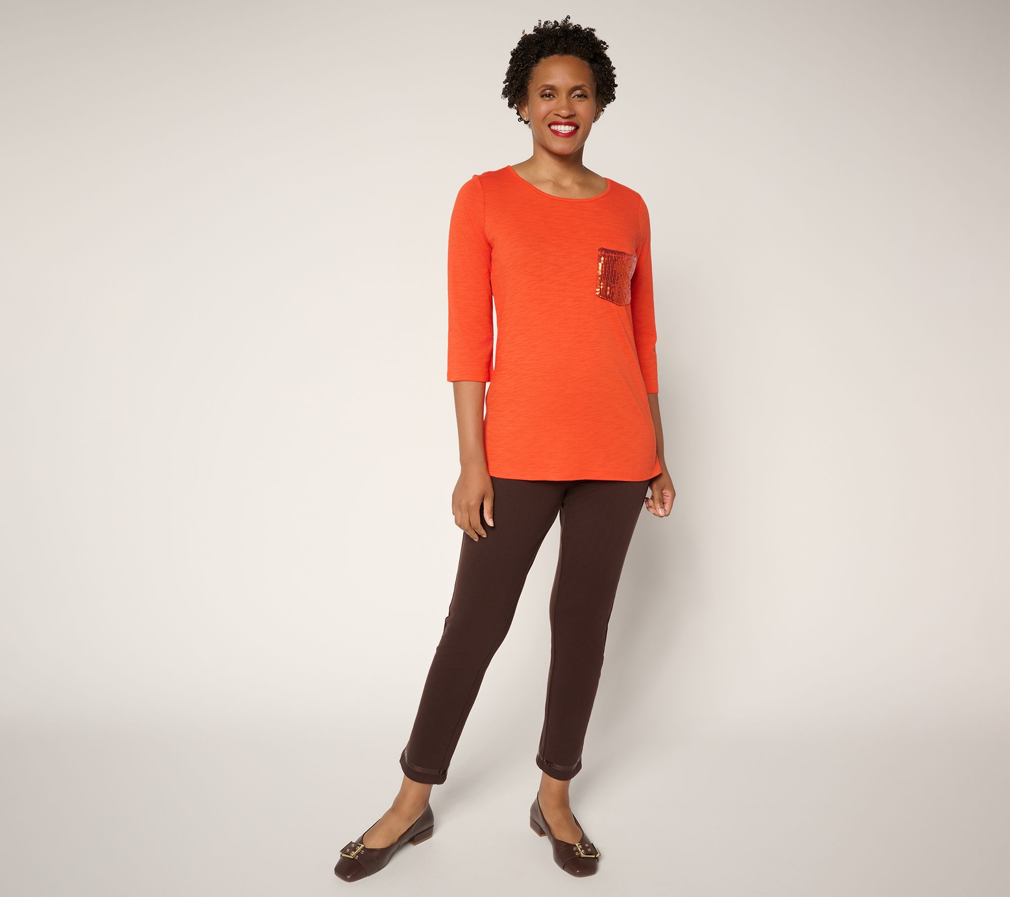 Give your casual wardrobe a cheerful lift with these sequin-trim ankle pants -- just right for coffee runs, weekend strolls, and any time you want to sparkle. The pull-on style offers fuss-free comfort, while side vents at the hem add a dash of personality to every step. Pair with your favorite tunic or a comfy tee for easygoing style. From Quacker Factory®.
