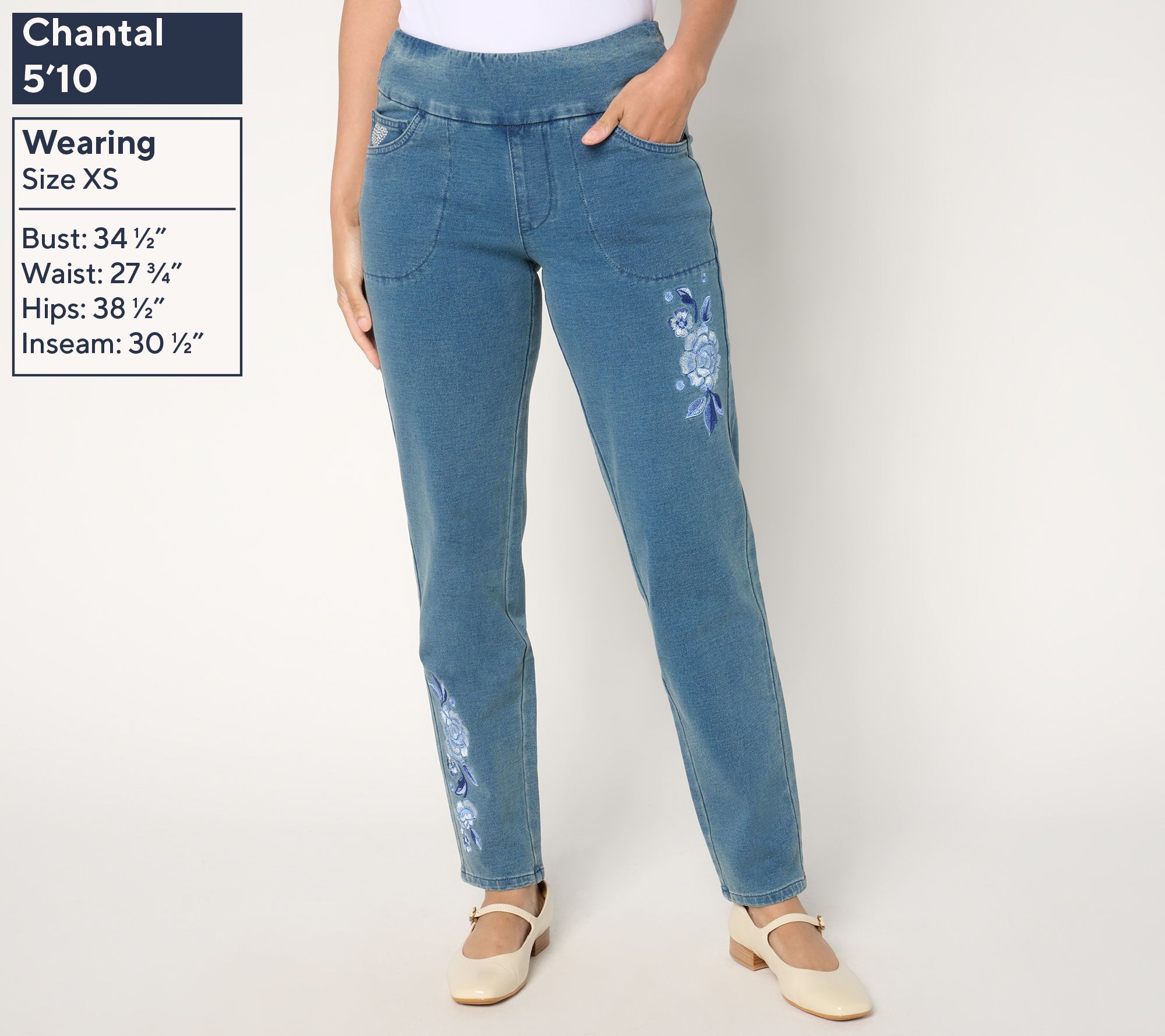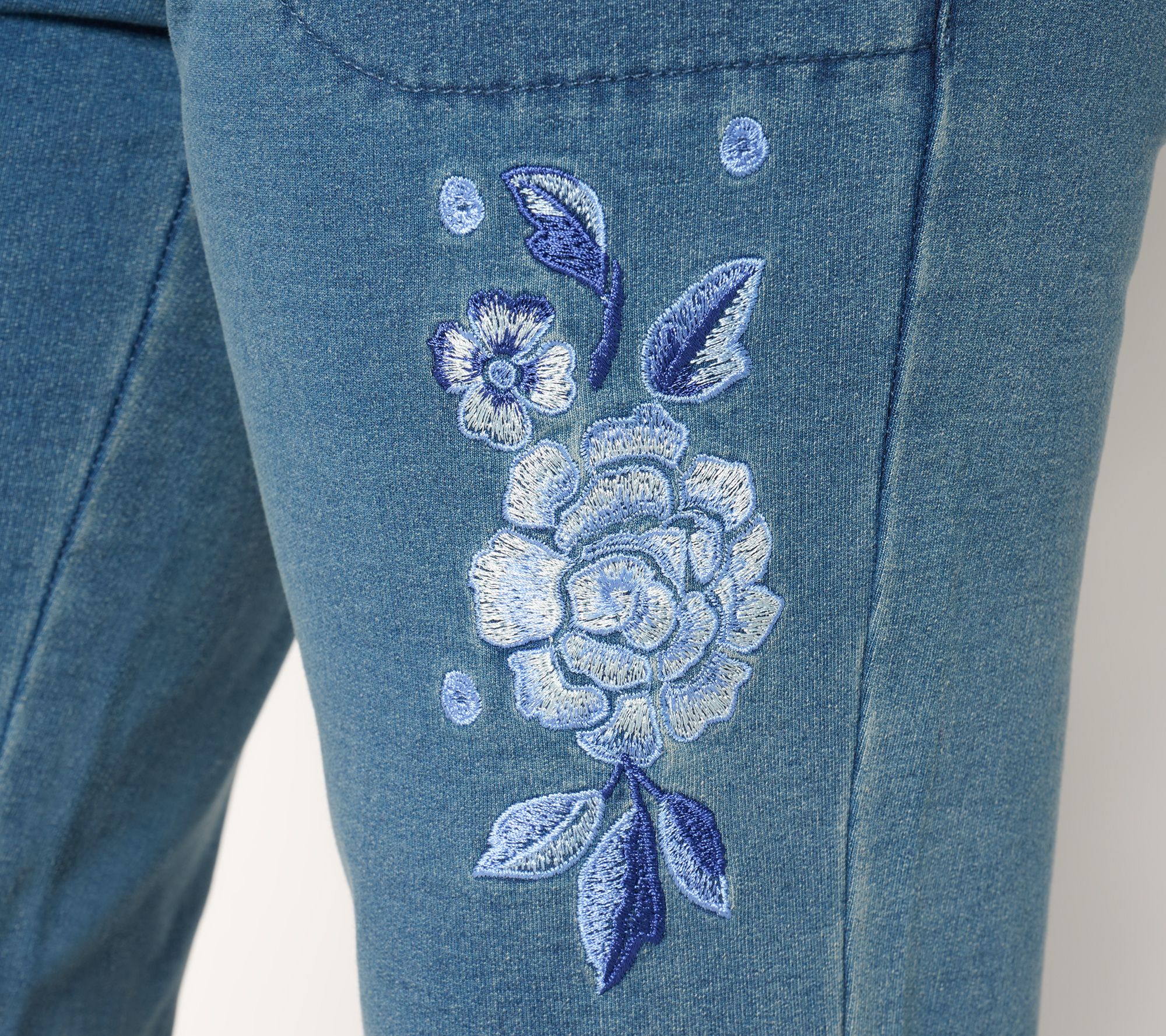 • Features: pull-on style, flat waistband, front pockets, embroidered floral design