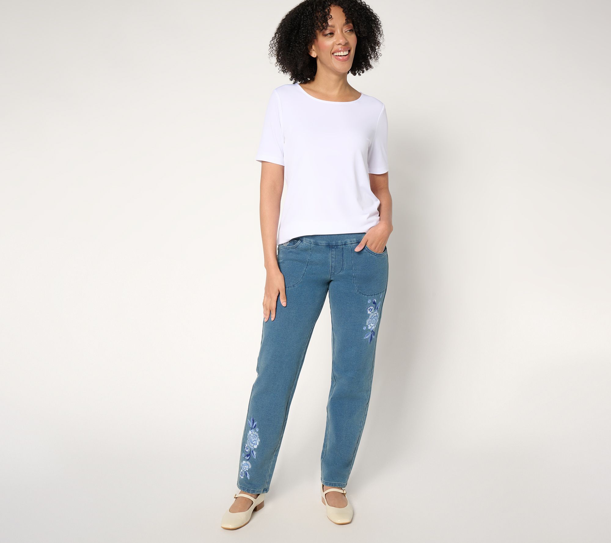 Your garden? It's in the planning stages. But your fashion? It's full-on spring forward with these floral-embroidered DreamJeannes in your wardrobe. Pair with a pretty flat for all the fresh season feels. From Quacker Factory®.