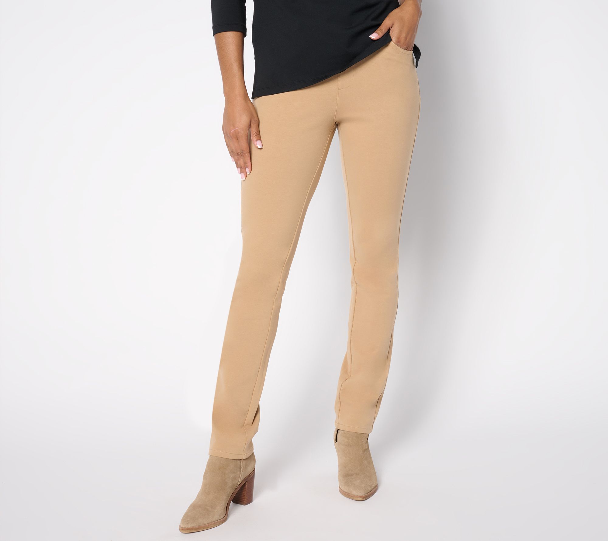 Keep on tucking! A flat elastic waistband and faux-fly detail make these DreamJeannes knit pull-on pants a fabulous pick for a front-tucked tops, cropped jean jackets, and cozy sweaters of all lengths. And that streamlined slim leg? It's a natural with trending flats, sneakers, and your fall boot haul. From Quacker Factory®.