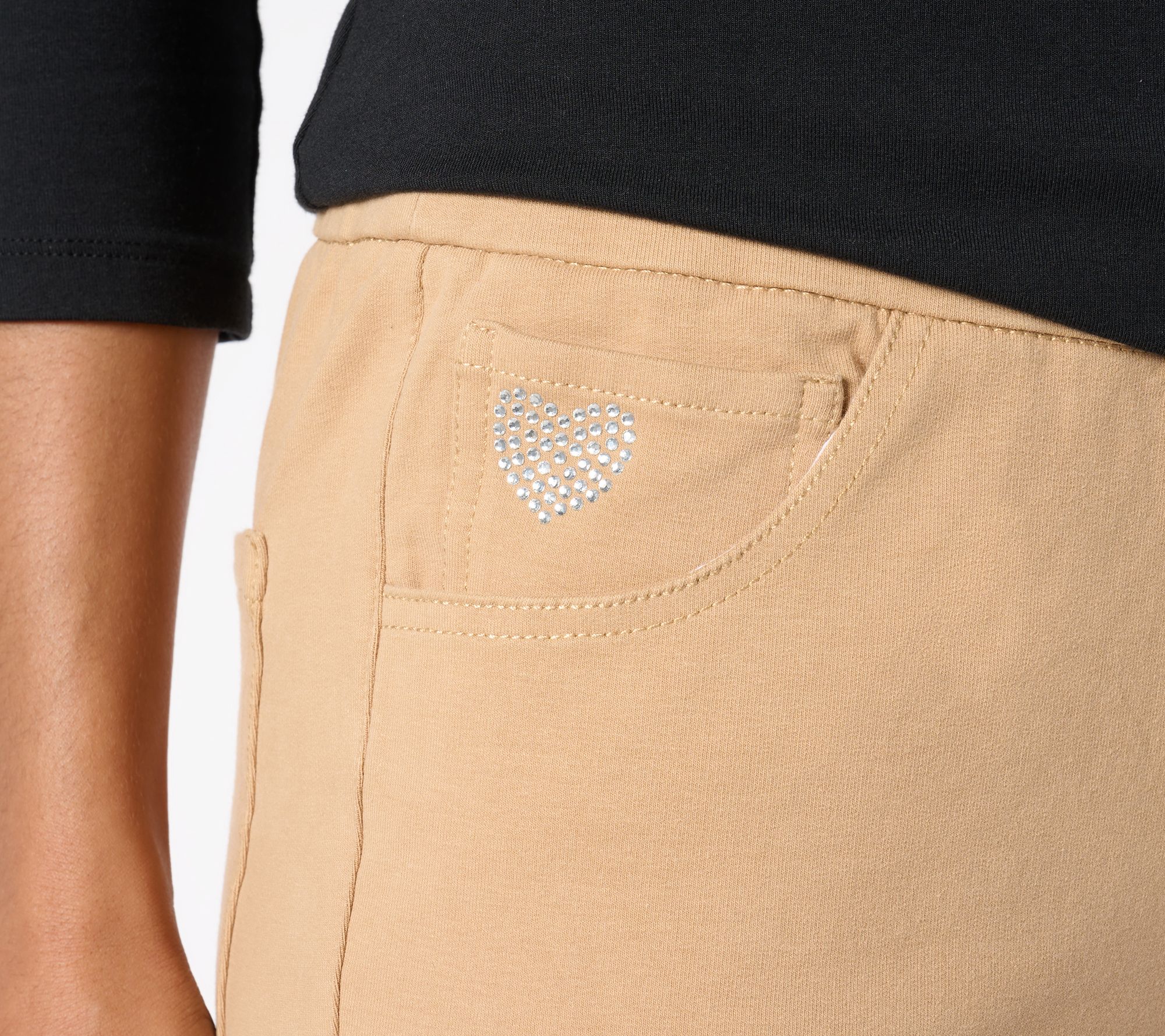 • Features: pull-on style, flat elastic waistband, faux fly detail, five-pocket styling, coin pocket with signature rhinestone heart