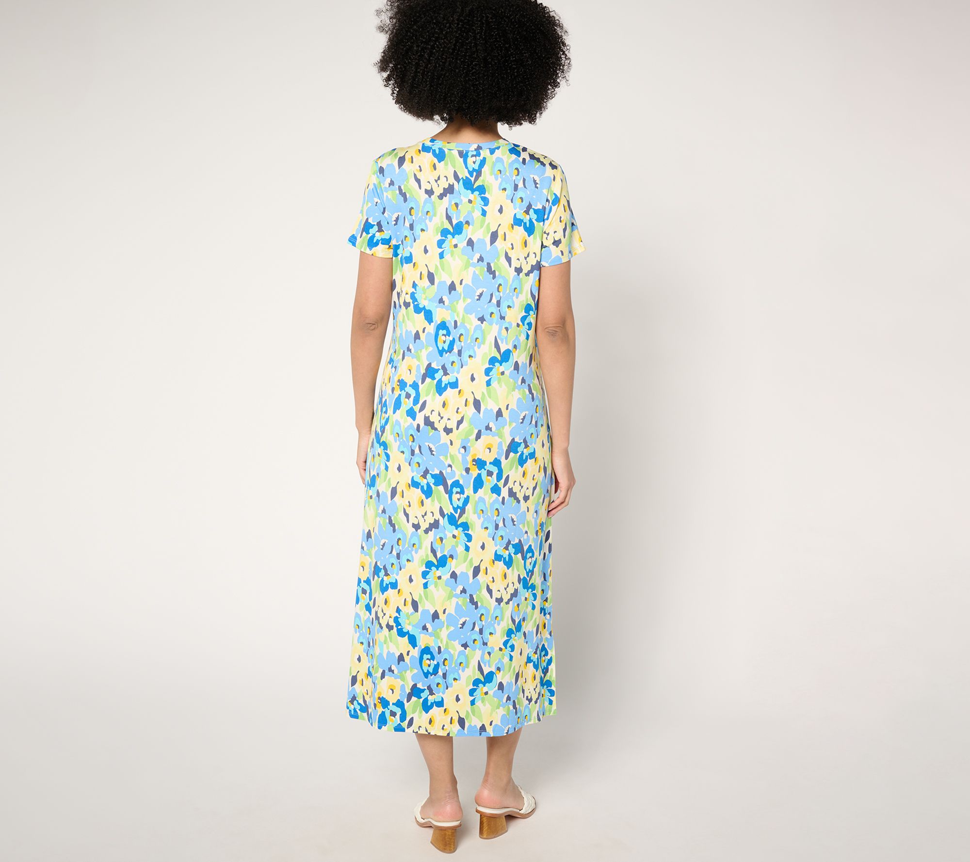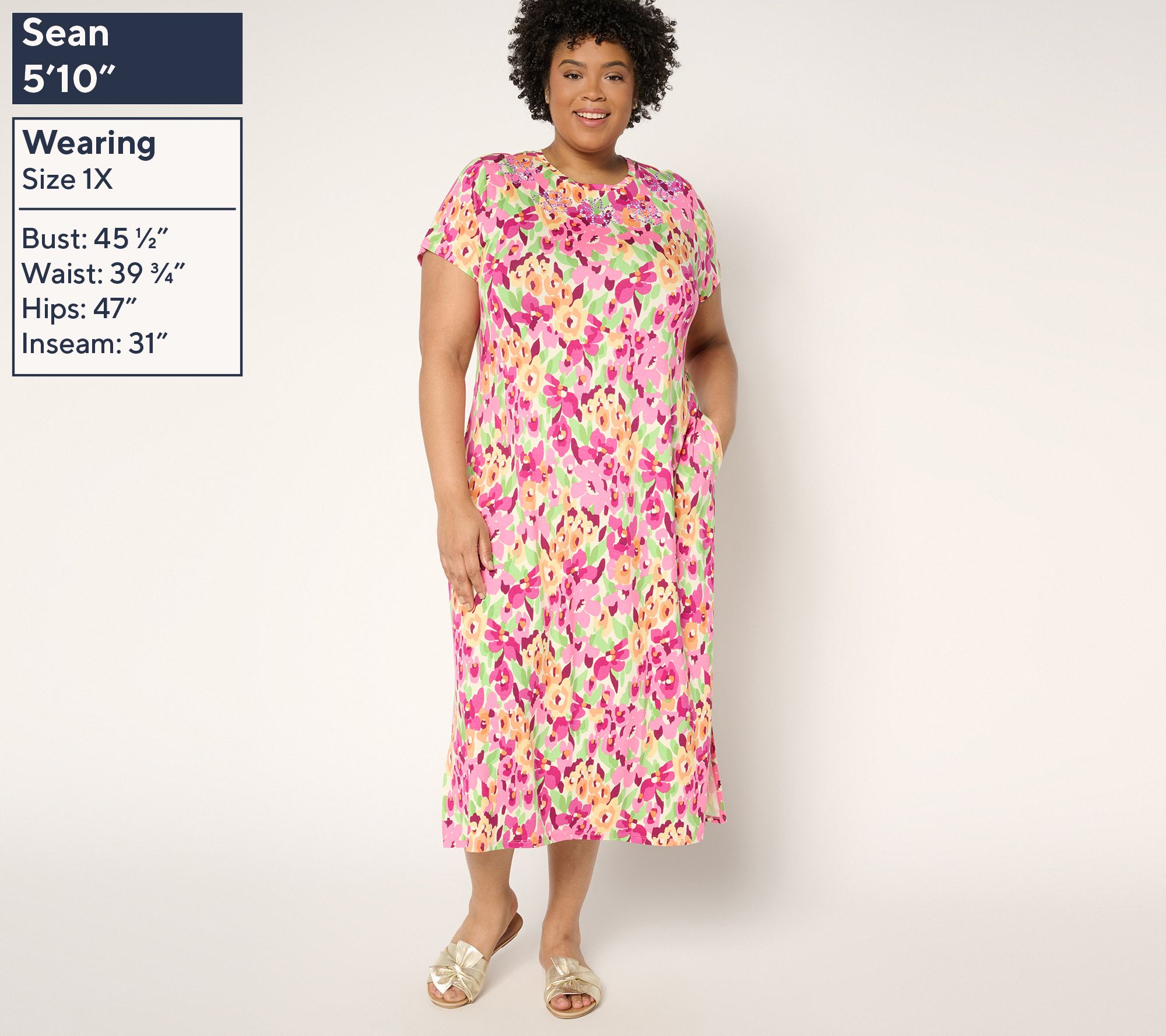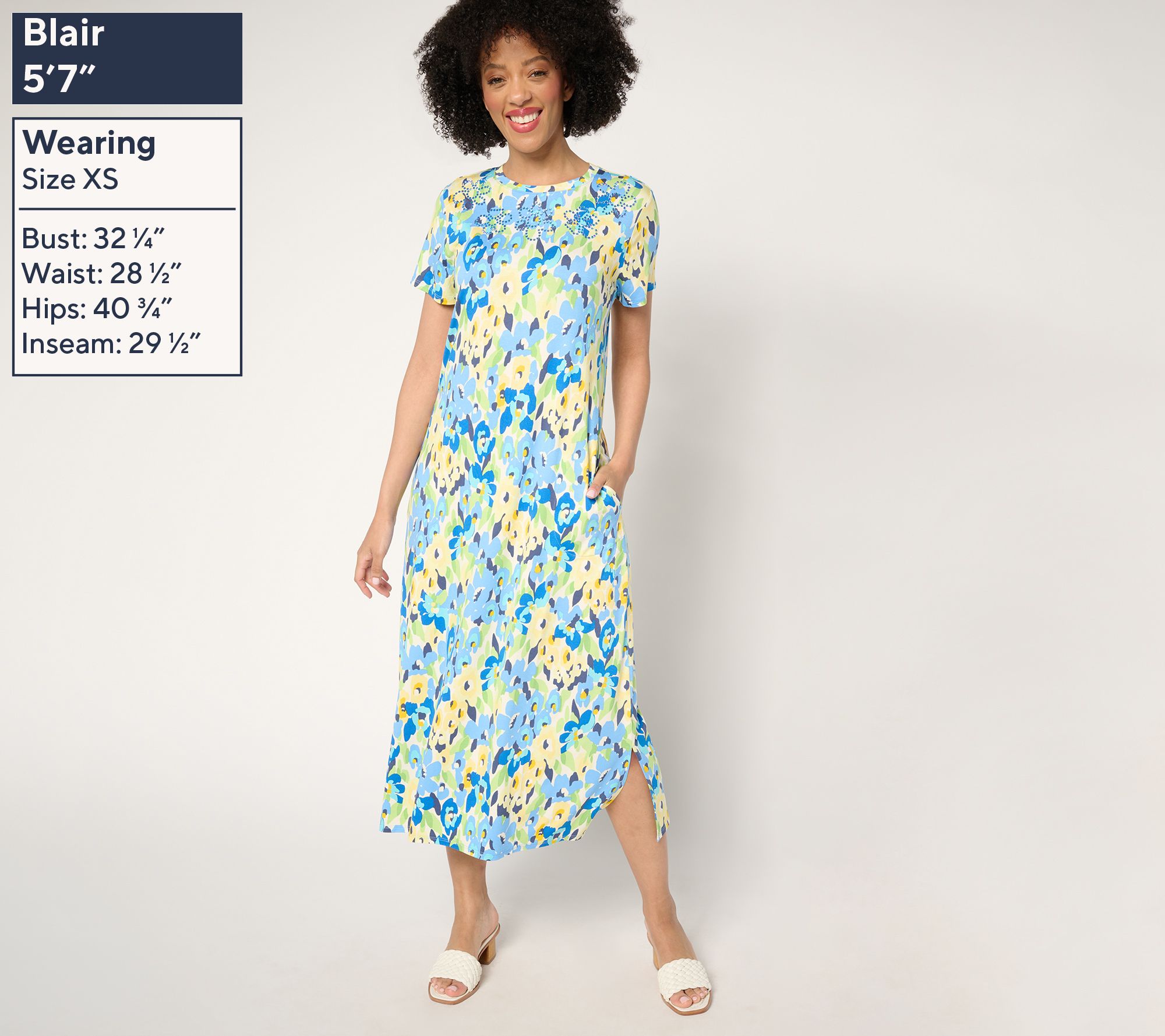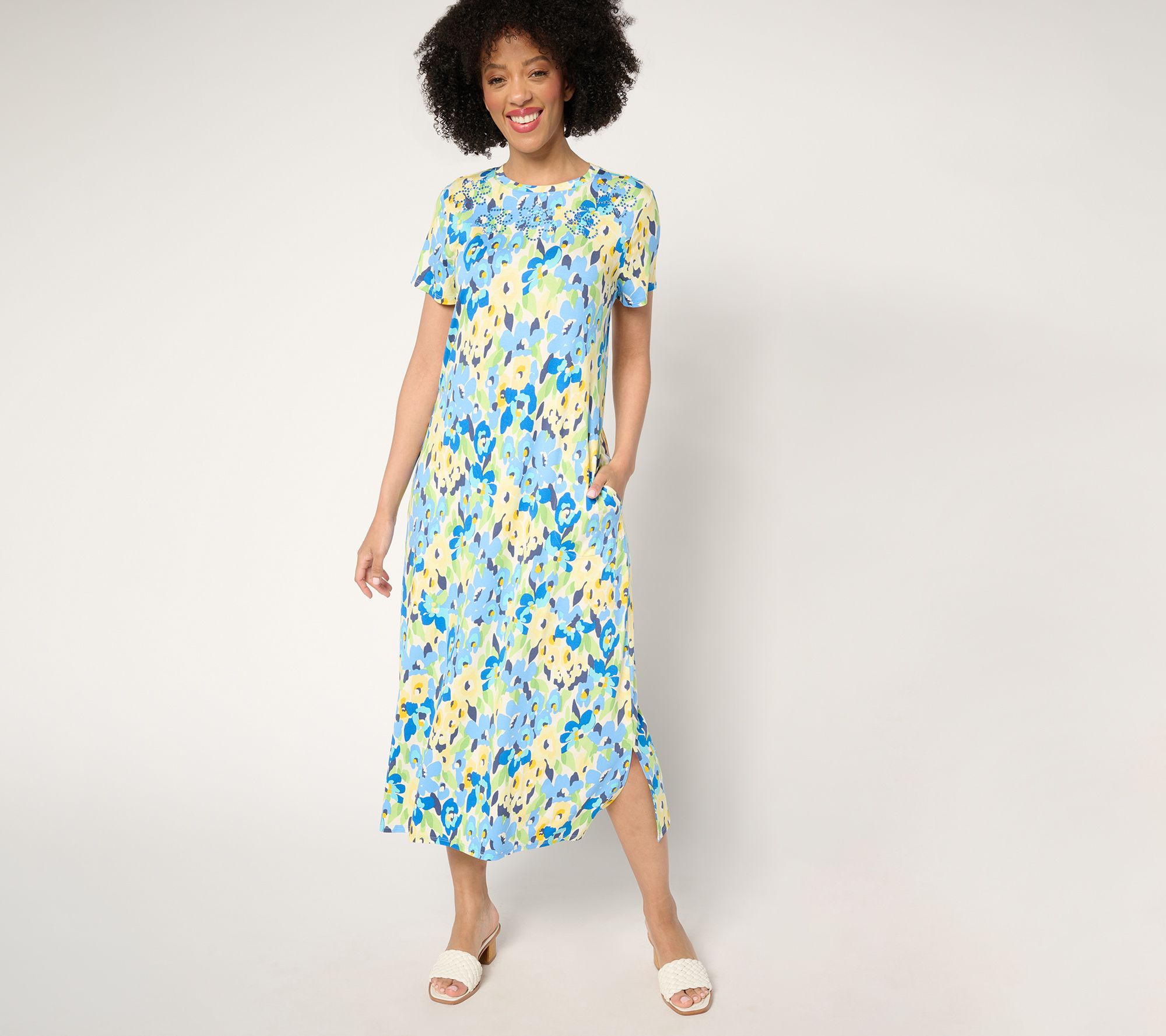 Welcome warmer weather in fantastic fashion with this Hello Spring maxi dress. The vibrant floral pattern provides the perfect palette for bling embellishments, while the classic silhouette (with pockets!) makes an easy-breezy addition to any wardrobe. From Quacker Factory®.