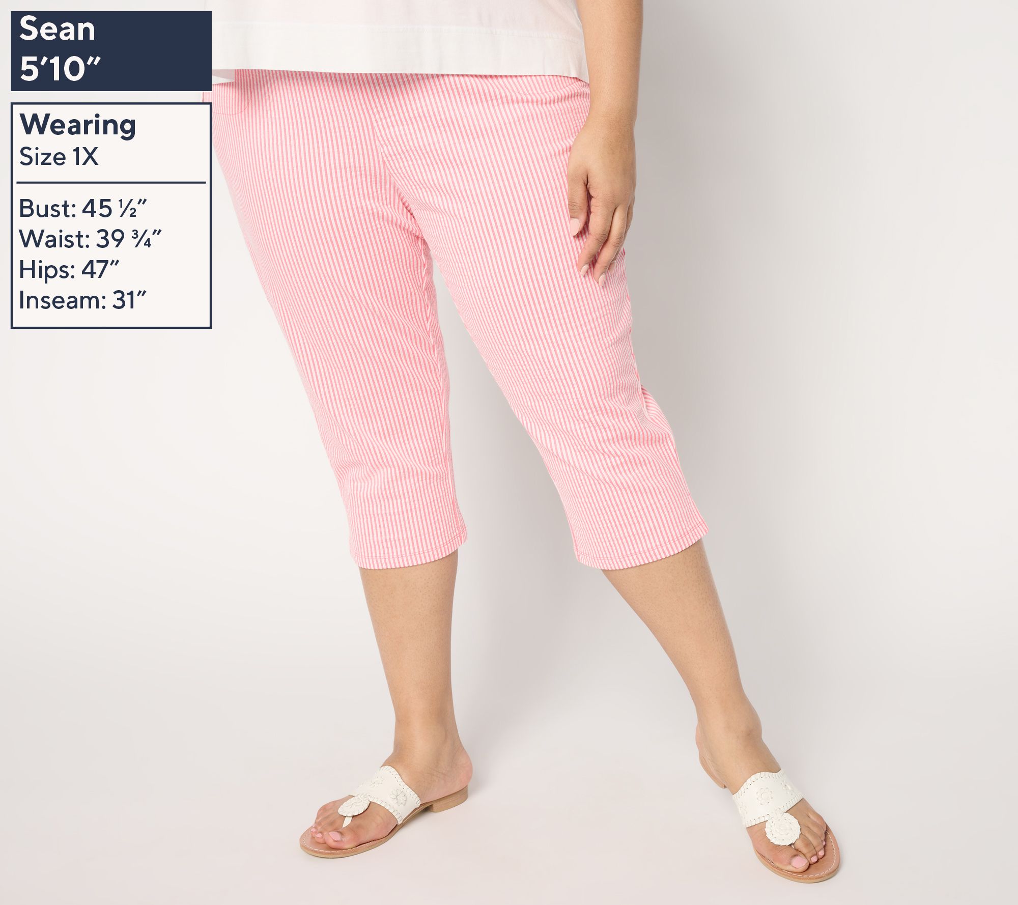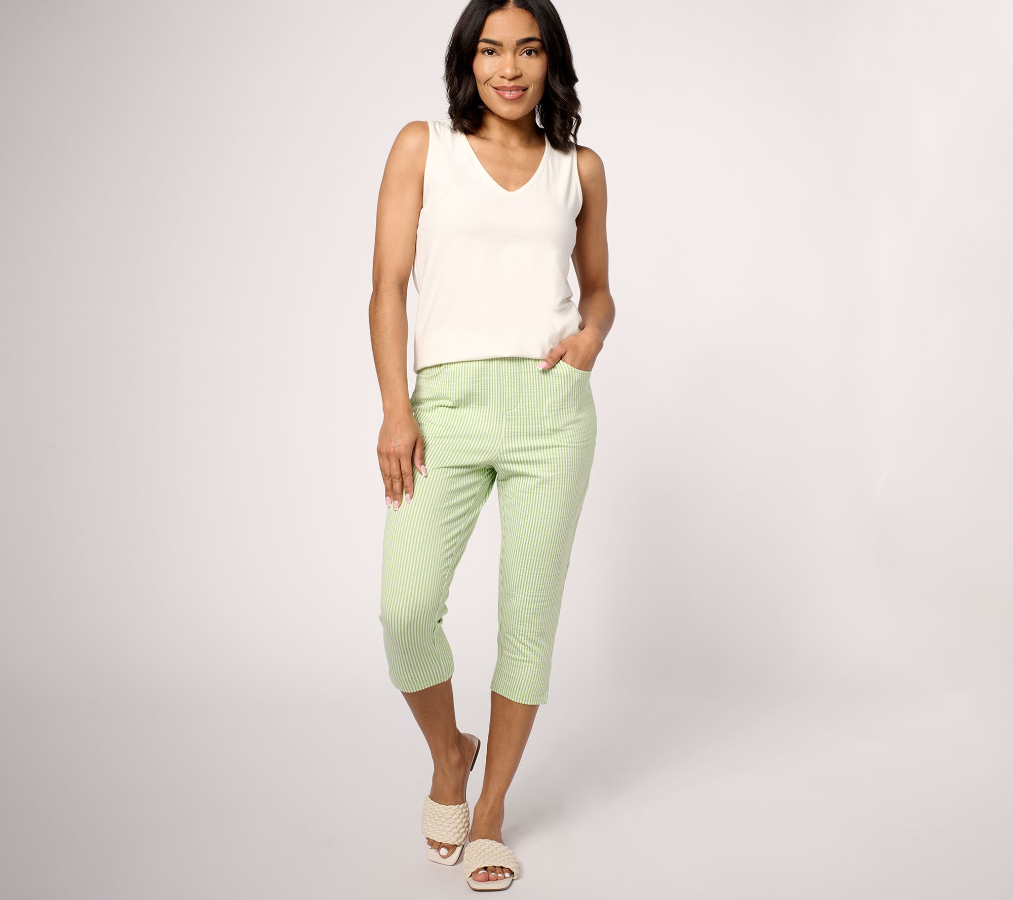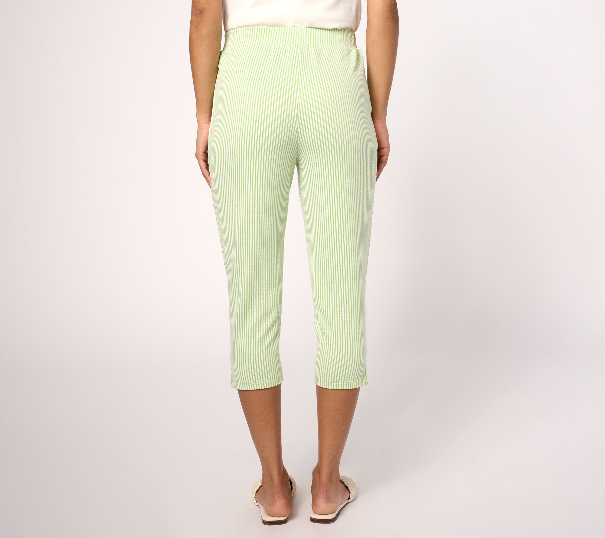 Meet your new go-to capris for the season! These knit seersucker pull-on pants provide effortless ease and stylish flair with their graceful design that comfortably follows your curves. The elastic waistband, pockets, and side vents on the bottom hem are practical additions, making these capris perfect for both daily errands and laid-back weekends. From Quacker Factory®.