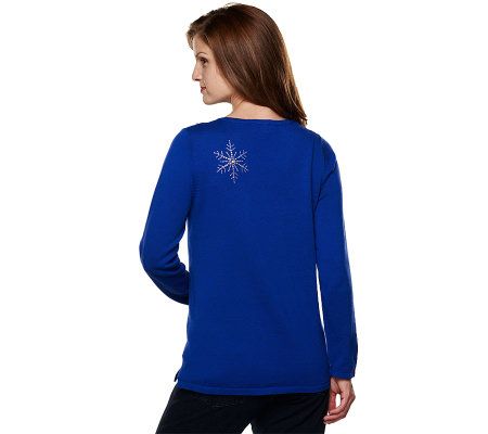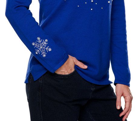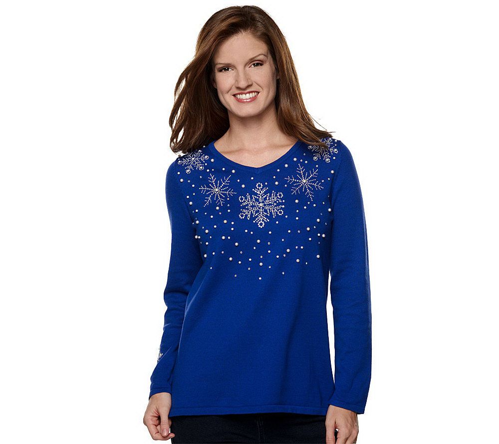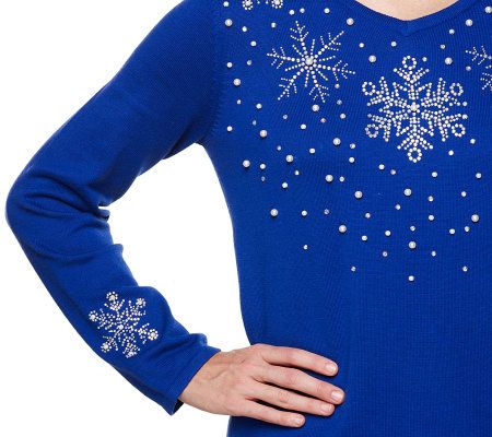 Frosty flakes. A flurry of simulated pearl and stud snowflakes give this sweater serious seasonal sparkle. From Quacker Factory.