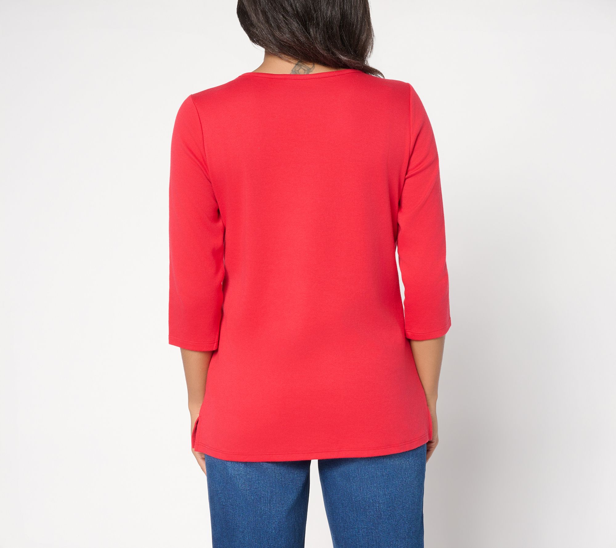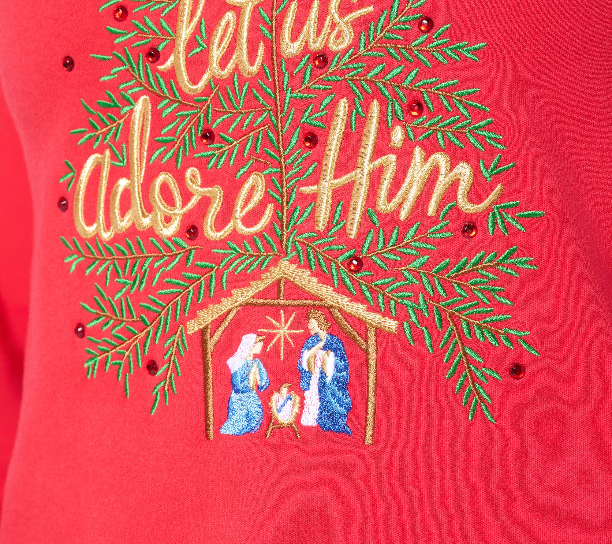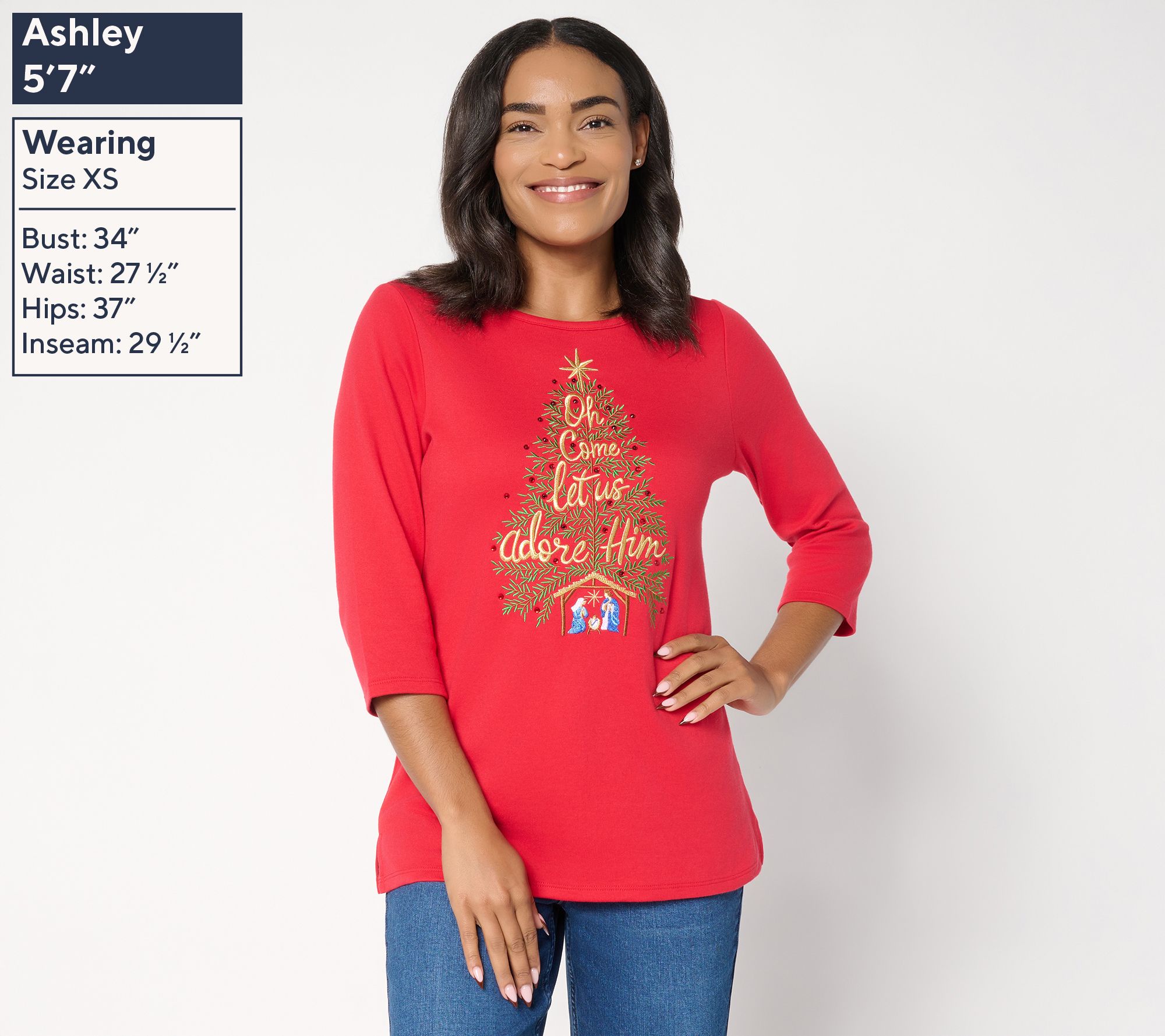 • Features: embellished "Oh Come Let Us Adore Him" motif, round neck, 3/4-length sleeves, straight hem, side slits