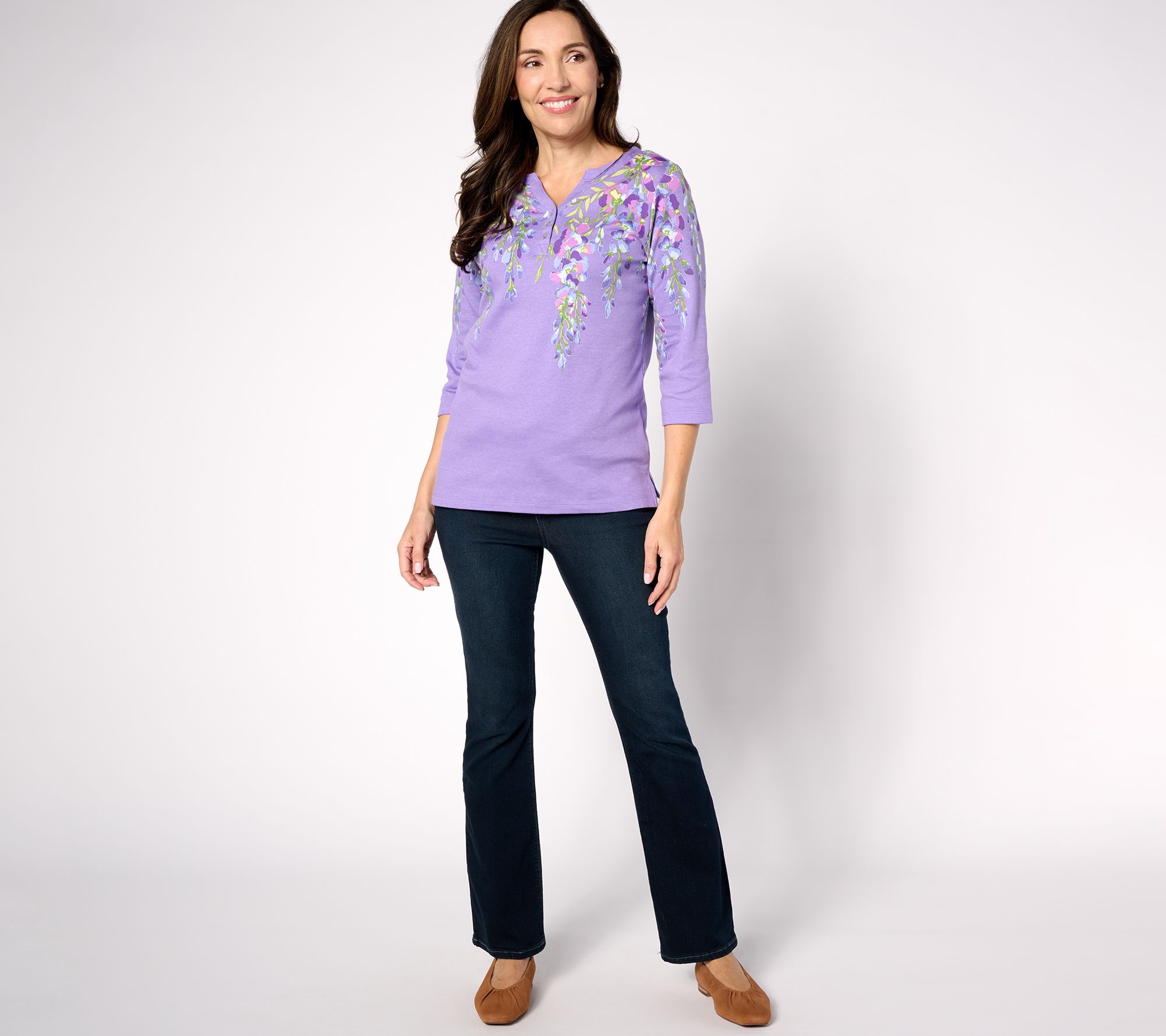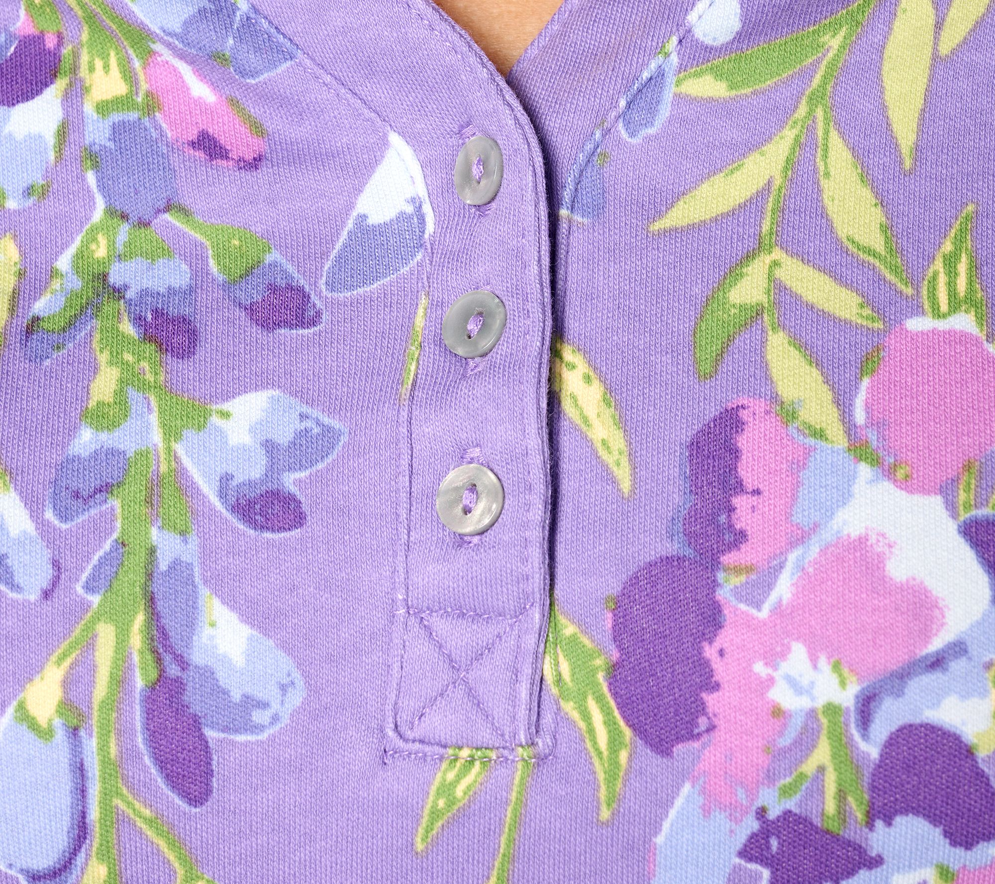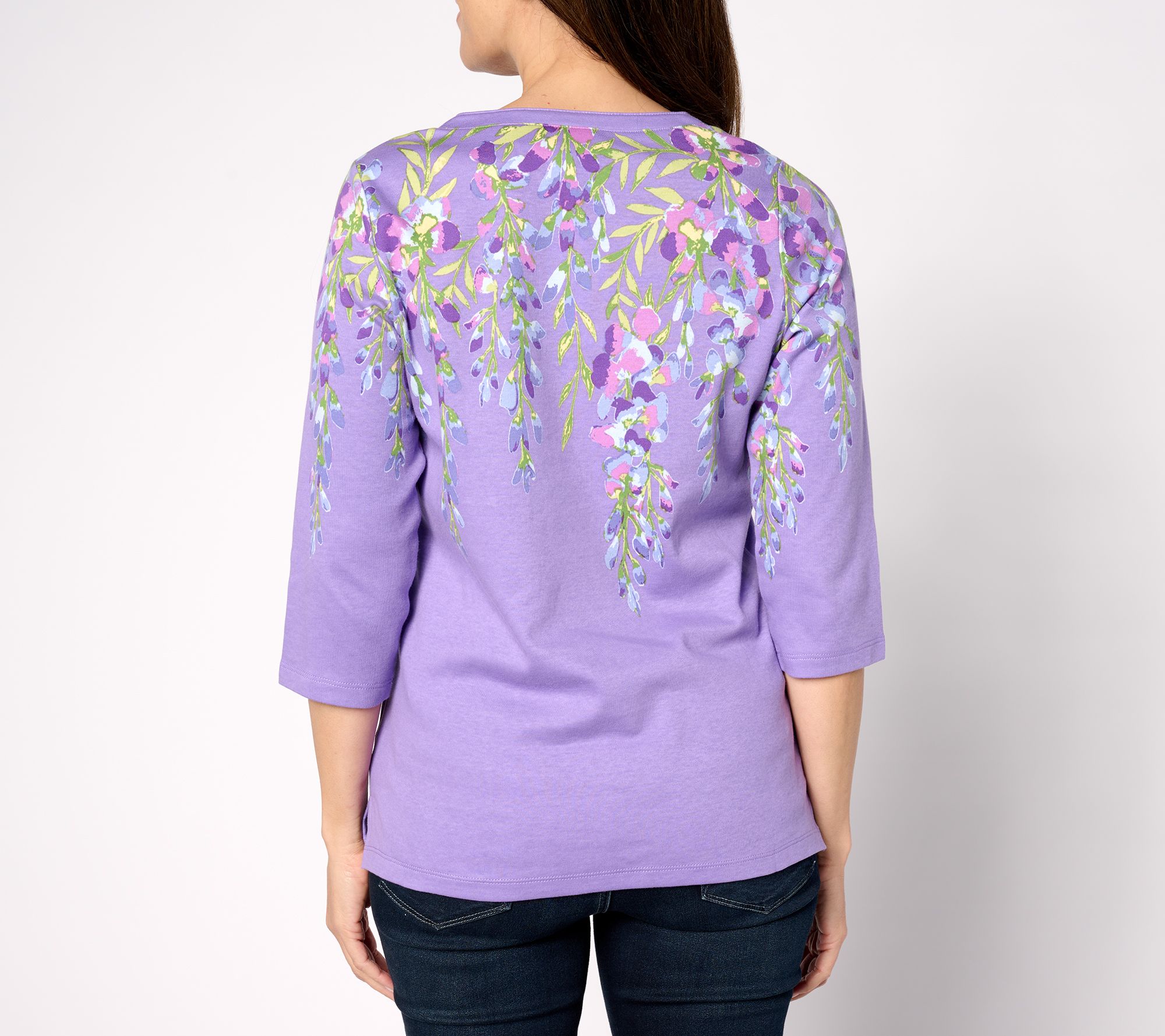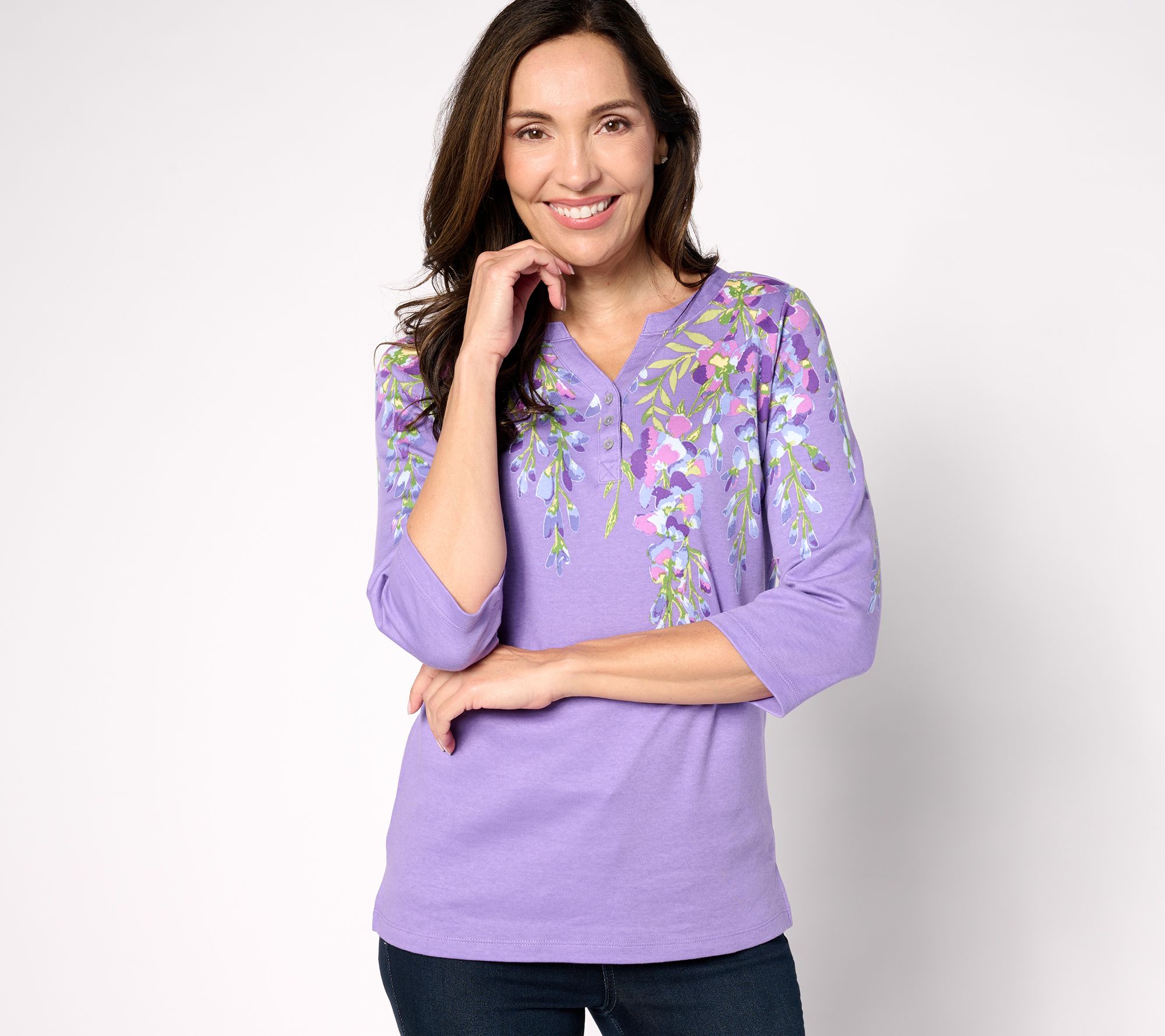 "As Is" Quacker Factory Printed Wisteria 3/4 Sleeve Split Neck Top