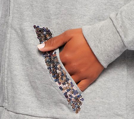 Kick back and relax, but don't become a style slouch. This tee and hooded jacket combo ensures you look sensational while you take it easy thanks to dazzling sequin embellishments. From Quacker Factory.
