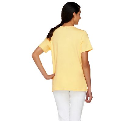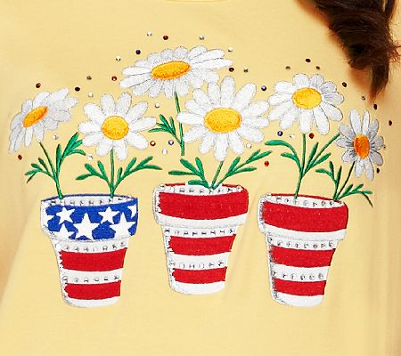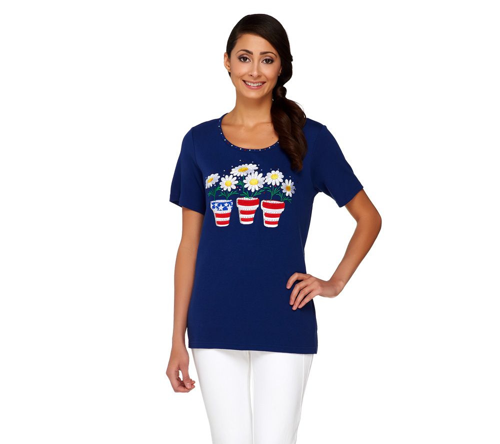Let your American colors bloom with this cheerful floral shirt. Embroidery and rhinestone details make it a special piece to add to your wardrobe. From Quacker Factory.