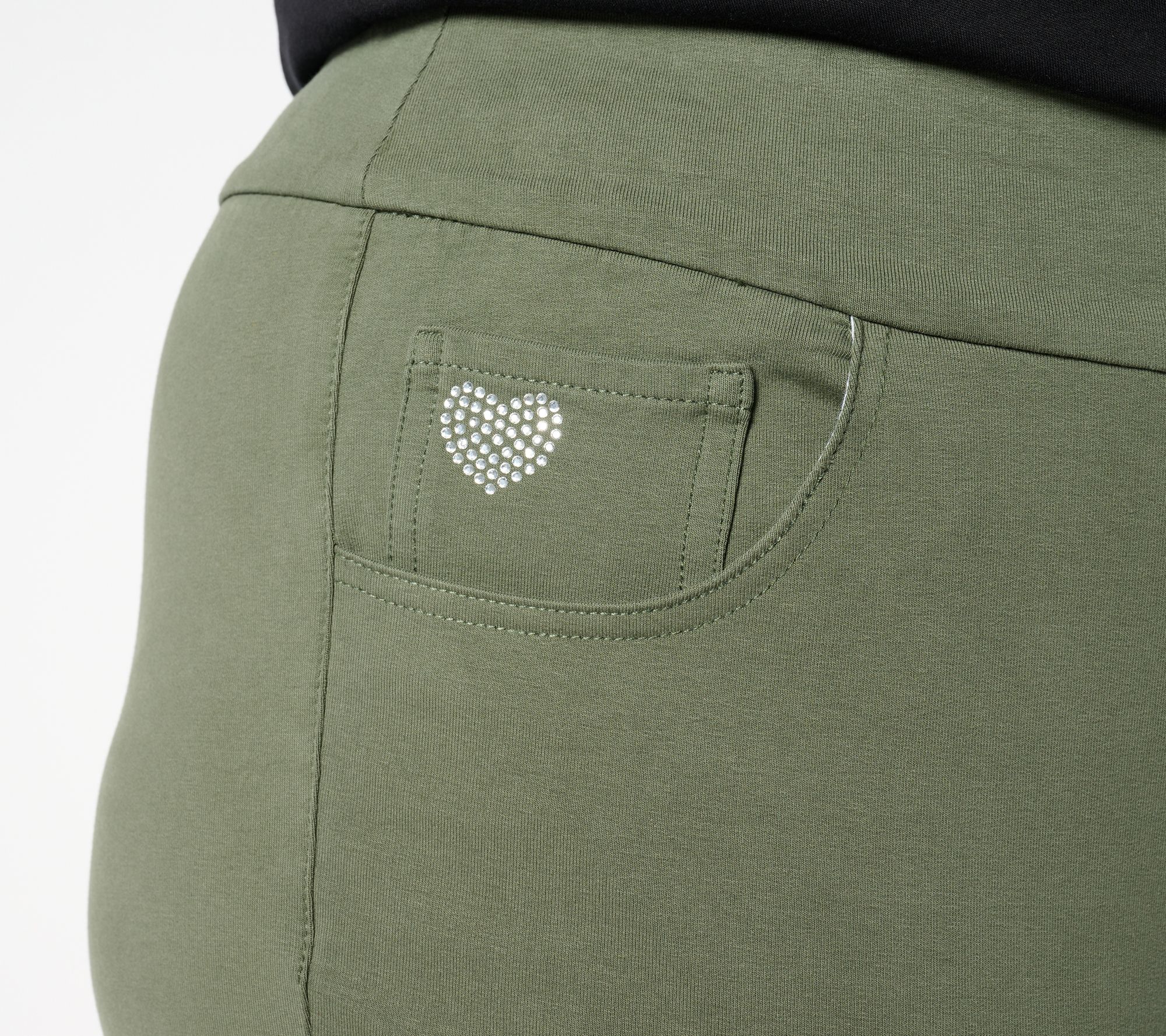 Features: flat waistband, pull-on style, two front pockets, coin pocket, elastic leg openings