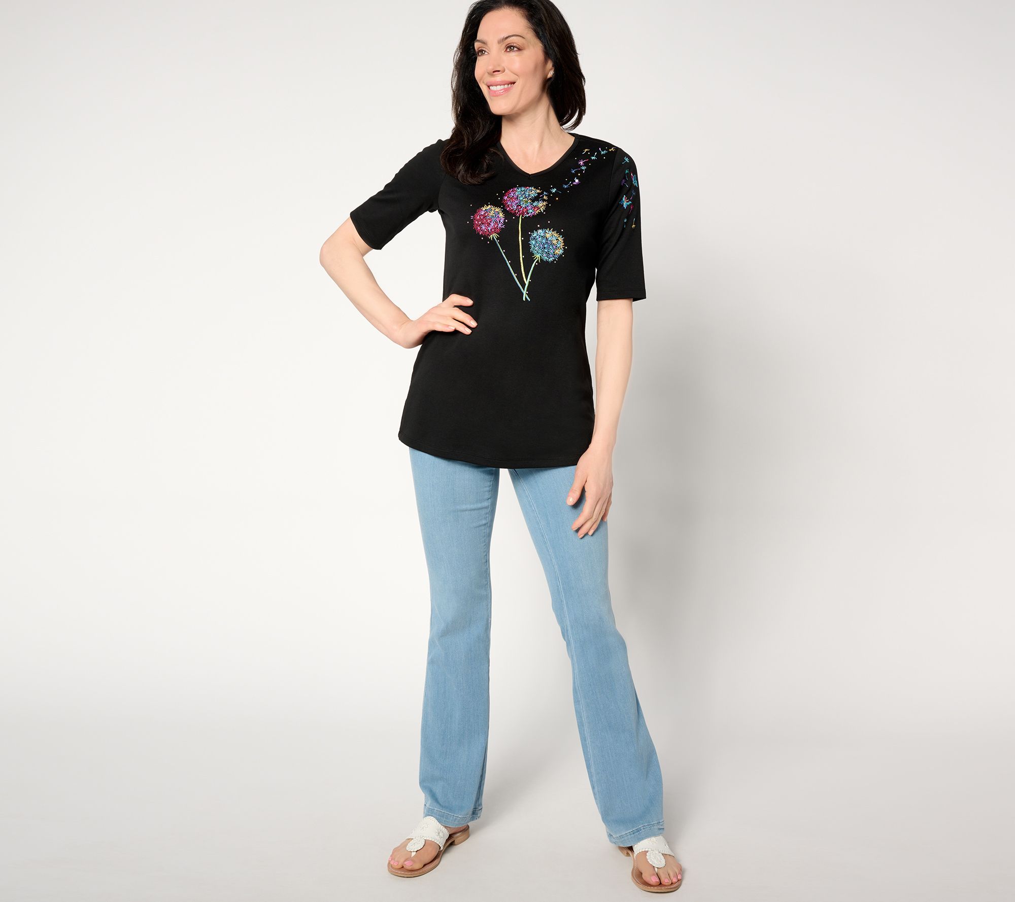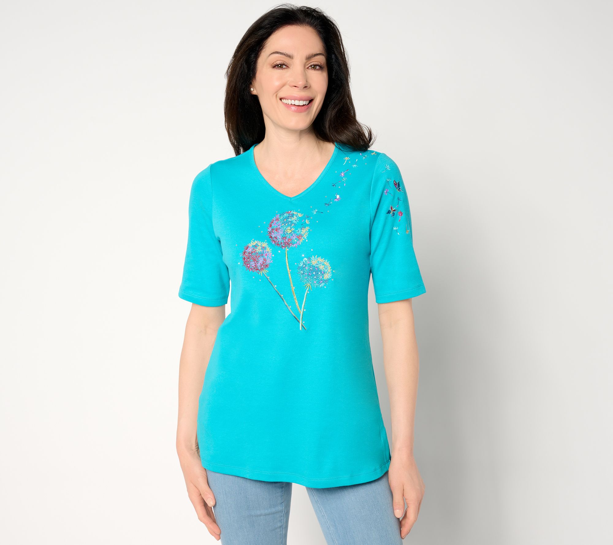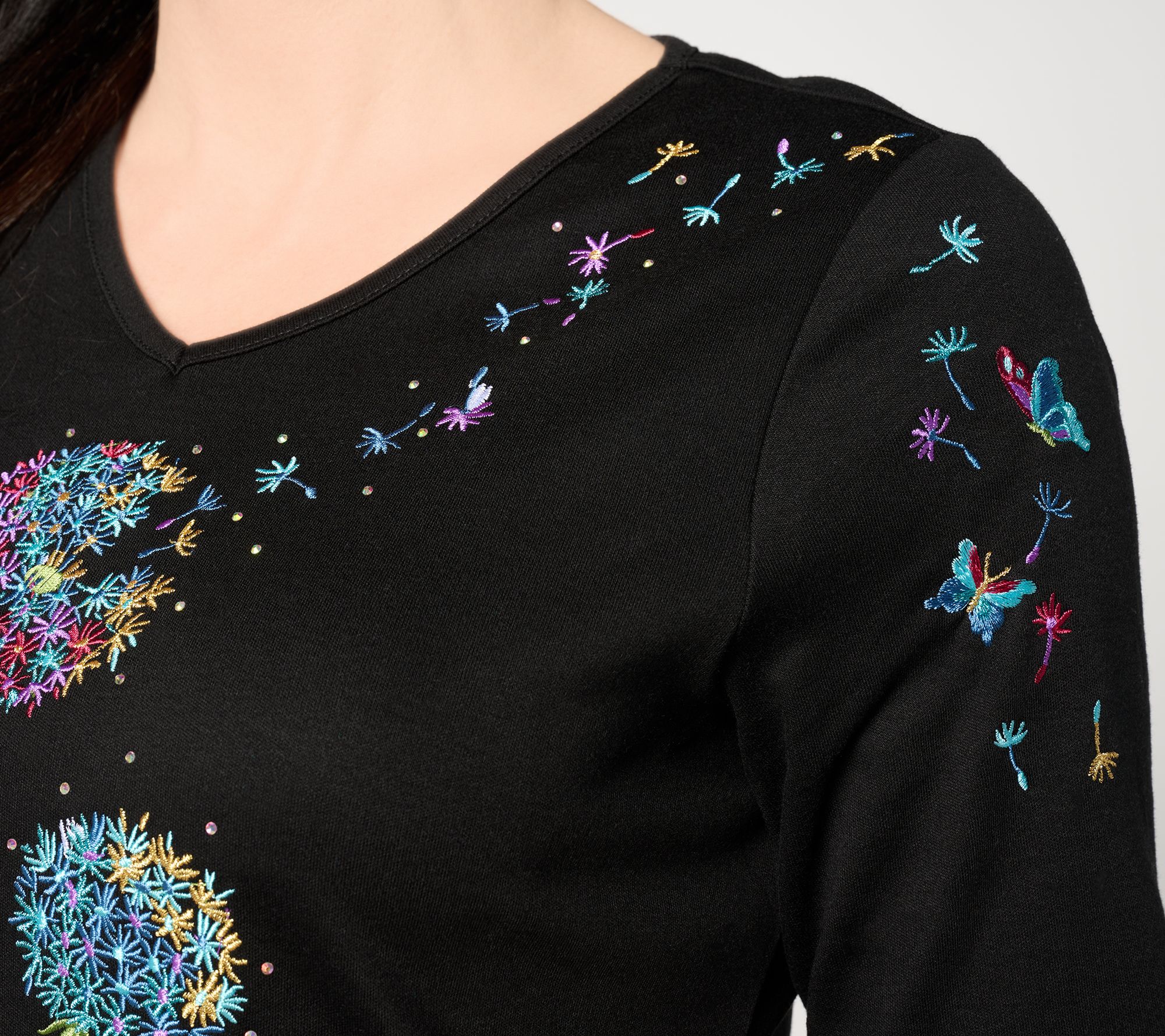Close your eyes and make a wish. Remember that feeling as you watched that flower's soft fuzz fly into the air? You'll be blown away by the level of embellished detail on this breezy dandelion-inspired tunic top design that captures the feeling of being a kid all over again. From Quacker Factory®.