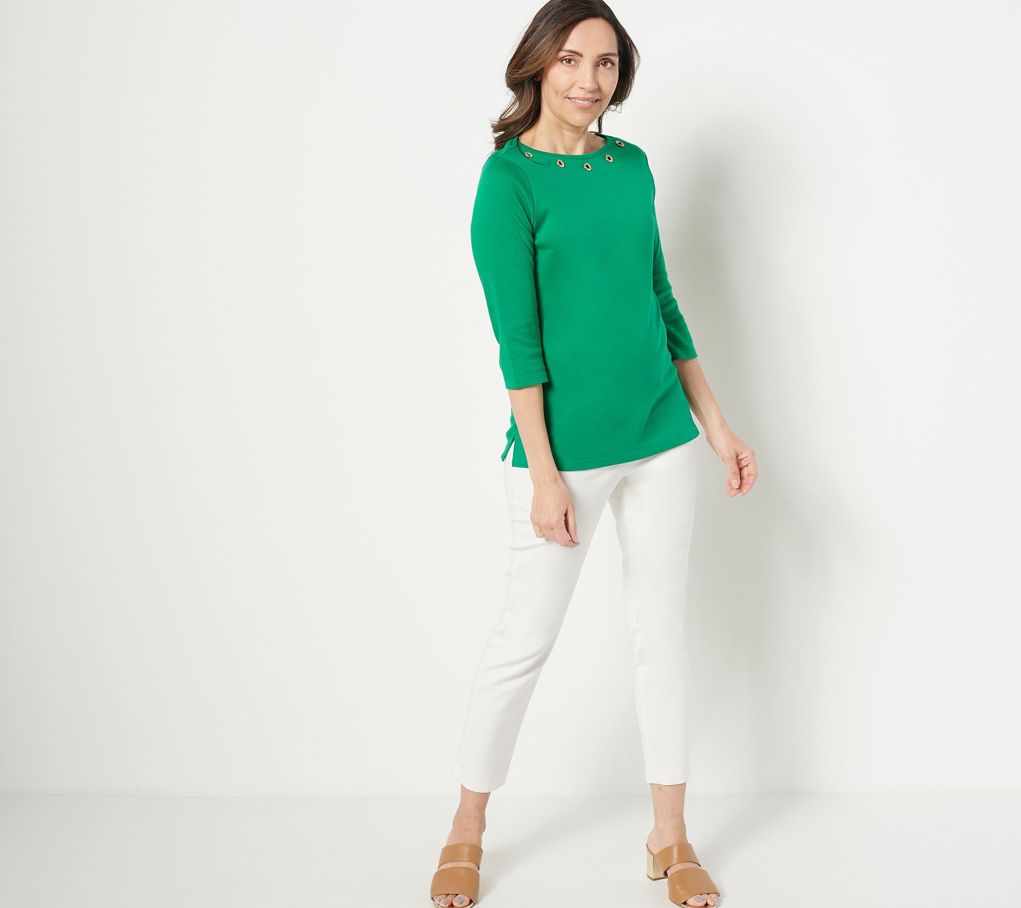 • Features: boat neckline, 3/4-length sleeves, side vents