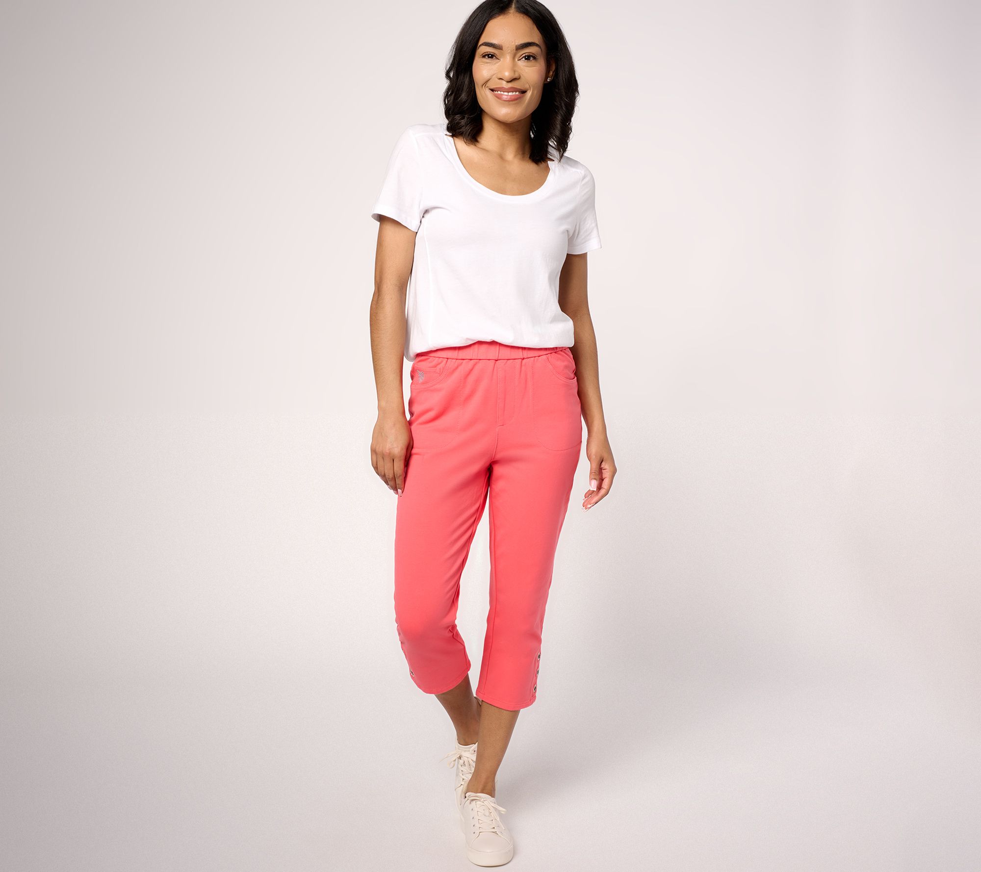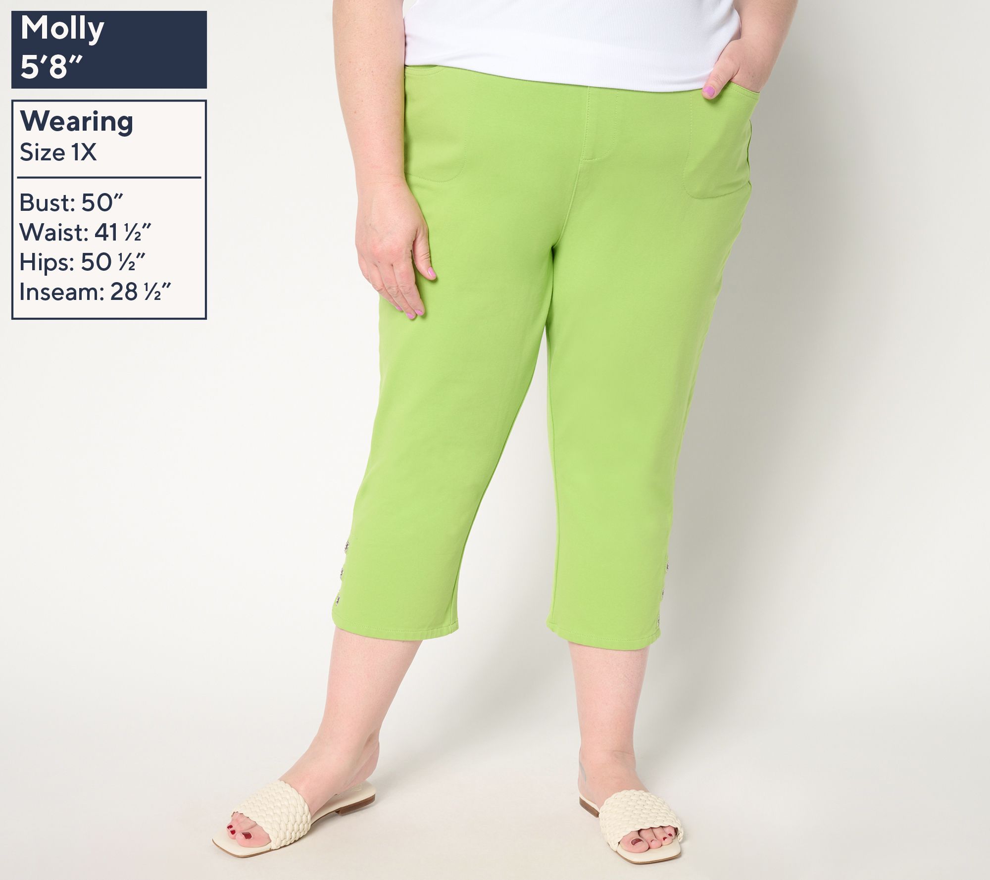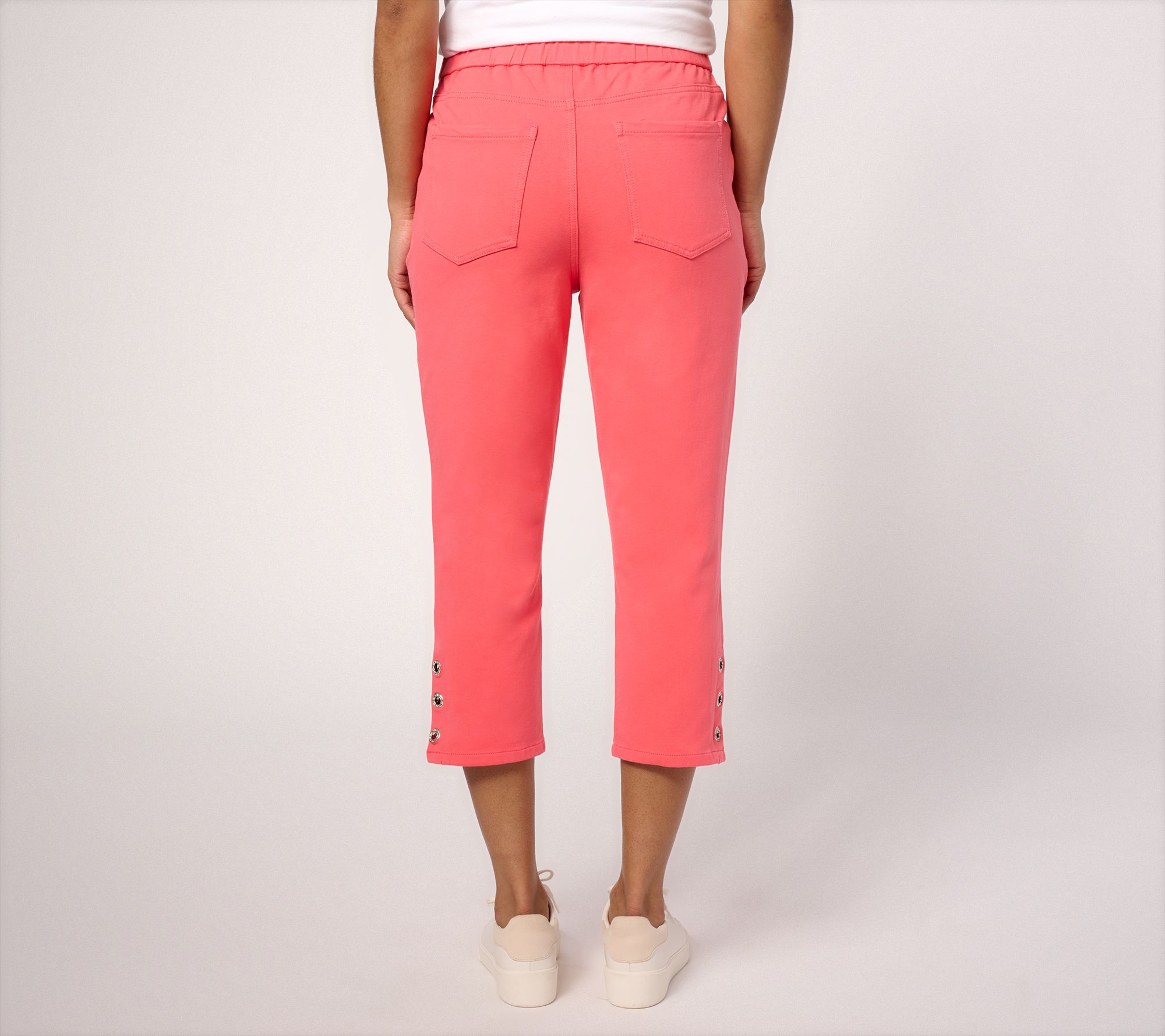Slip into these DreamJeannes capri pants and feel the comfort! Designed with an encased elastic waistband and fun grommets on the side vents, they offer a stylish and easy option for your casual days. From Quacker Factory®.