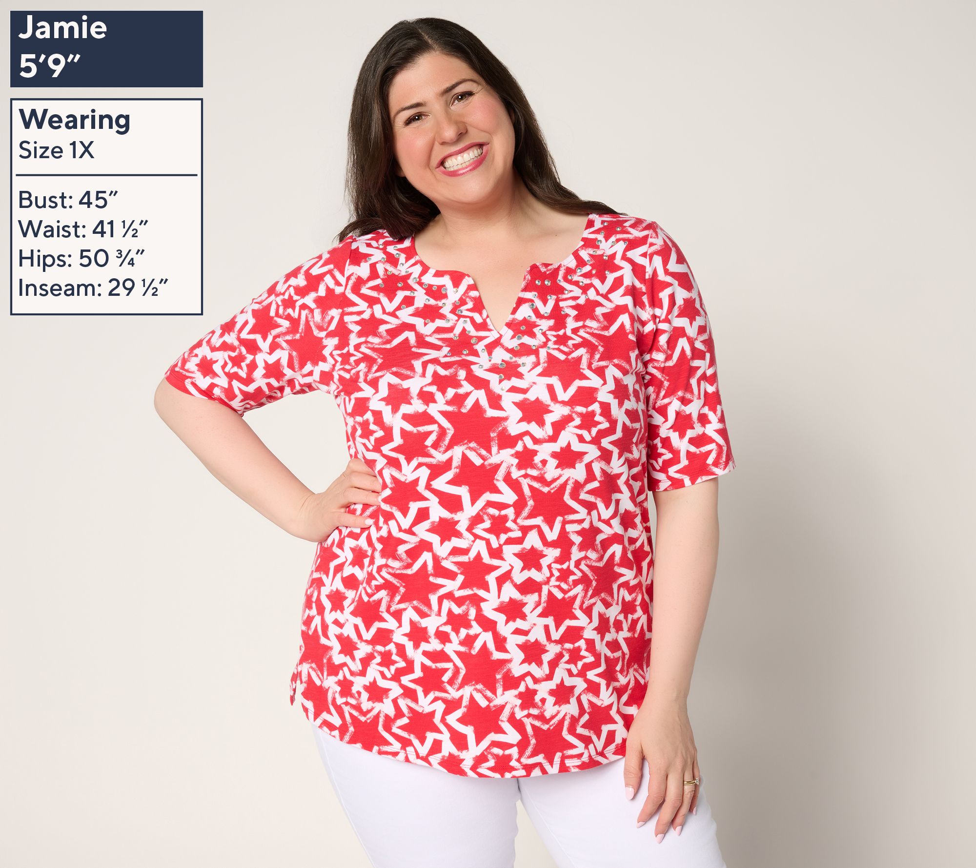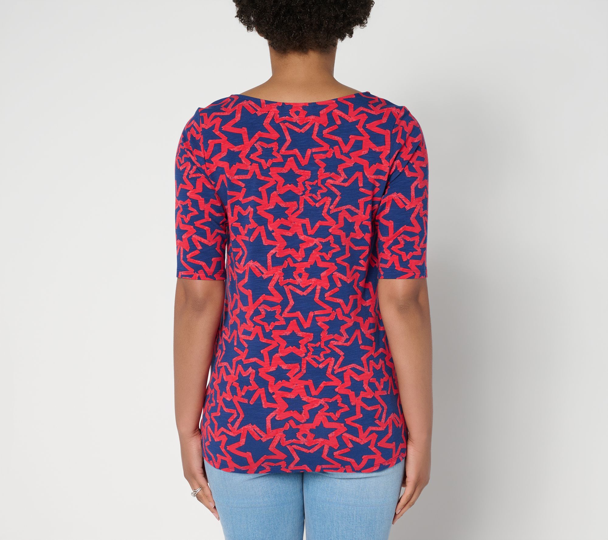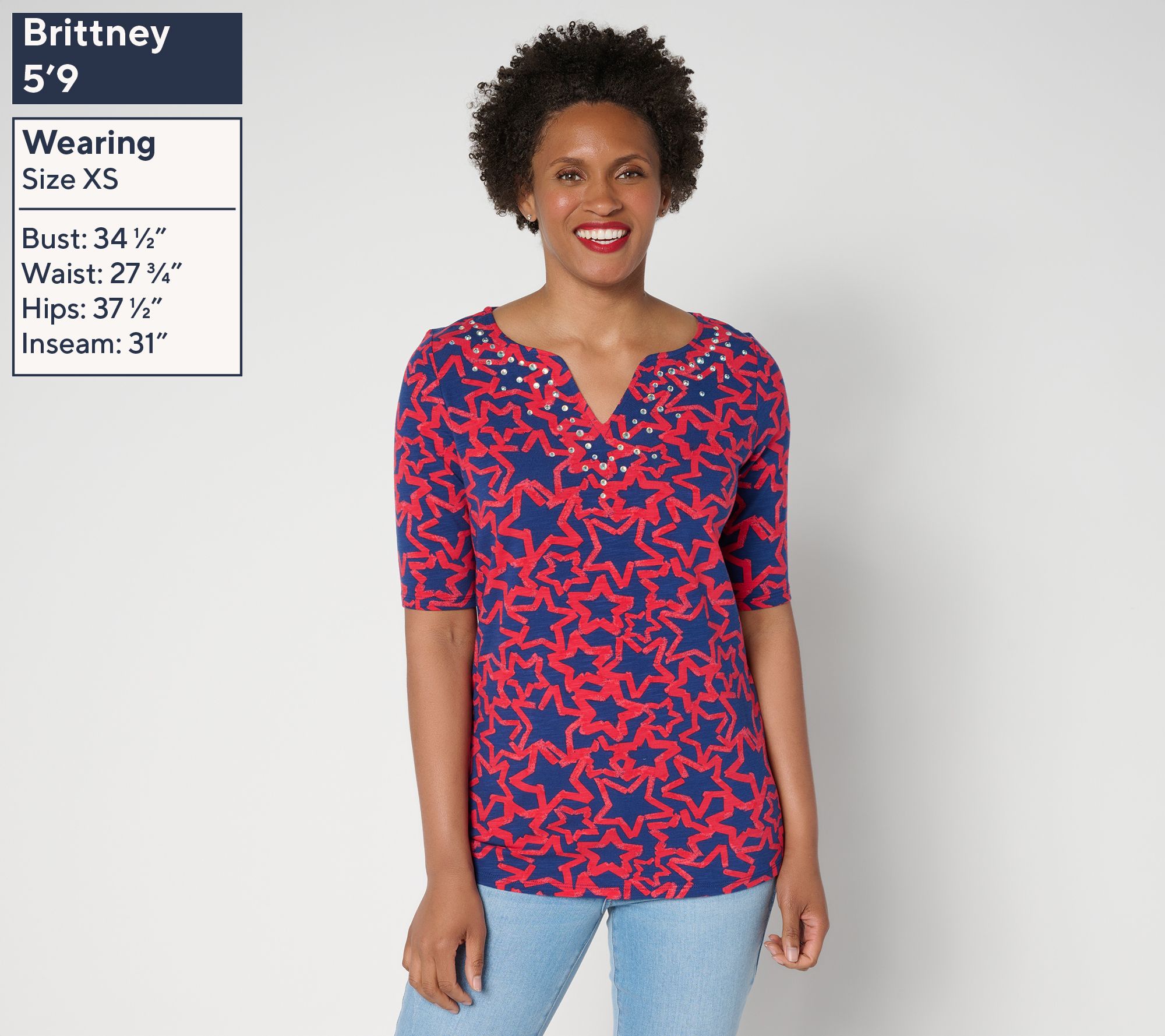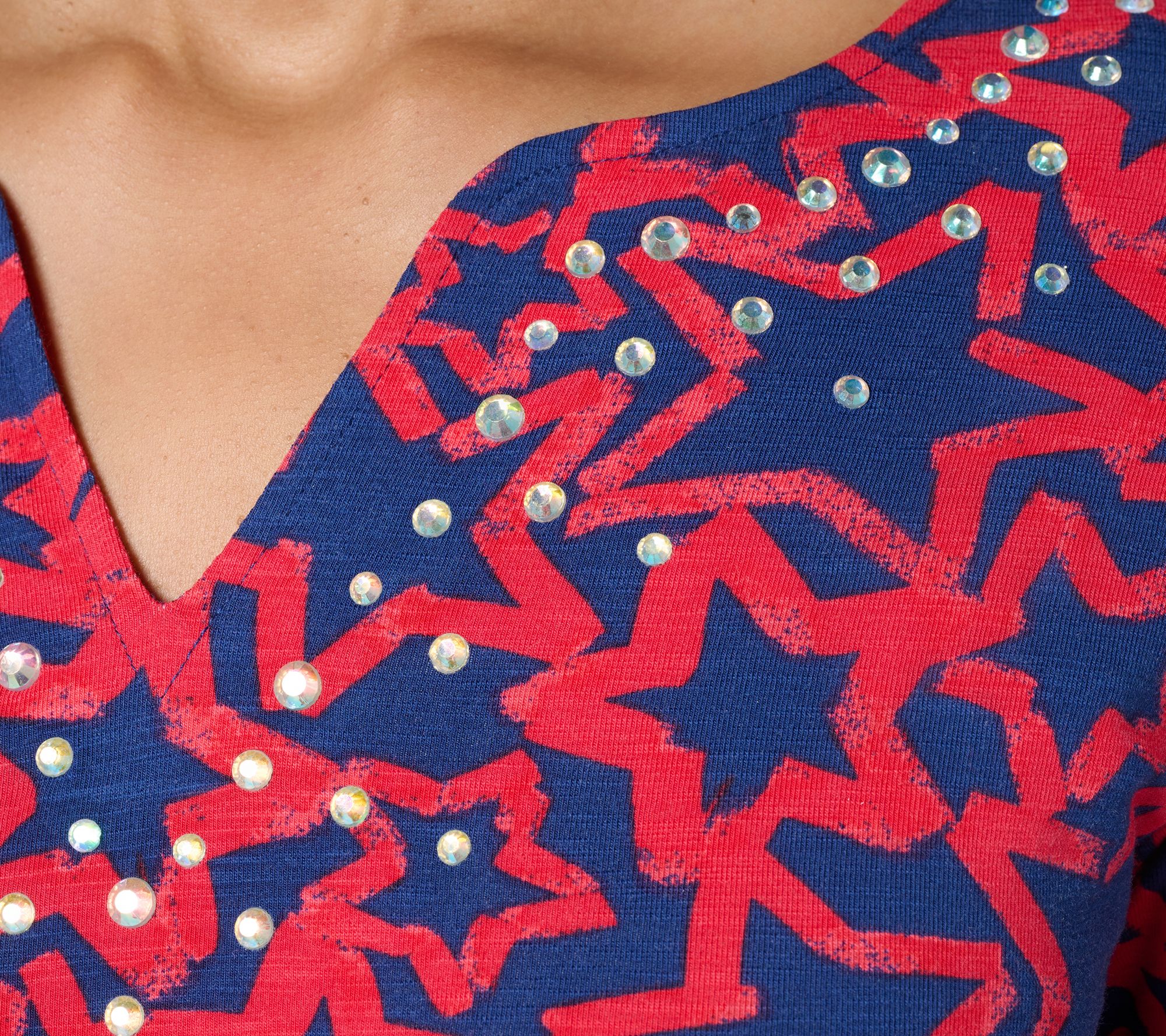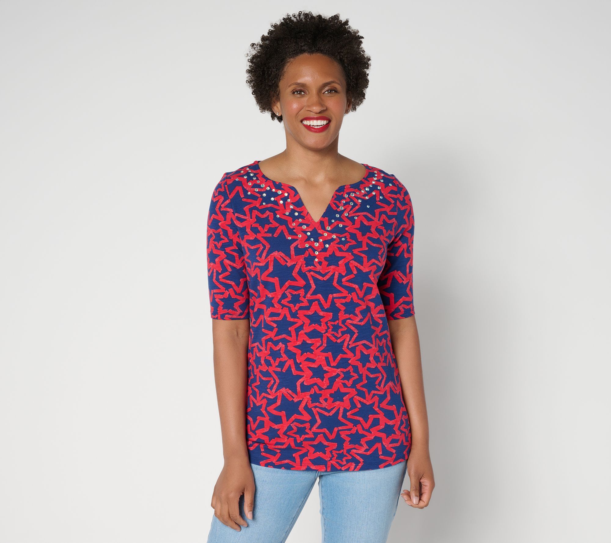 When your casual look calls for a dash of fun, this split-neck top brings it with a pop of printed stars and sparkling embellishment at the neckline. Elbow sleeves and side-slit hems keep things easy and comfortable, while the soft knit blend is ready for your daily adventures or weekend strolls. Pair with denim or shorts for instant outfit inspiration. From Quacker Factory®.