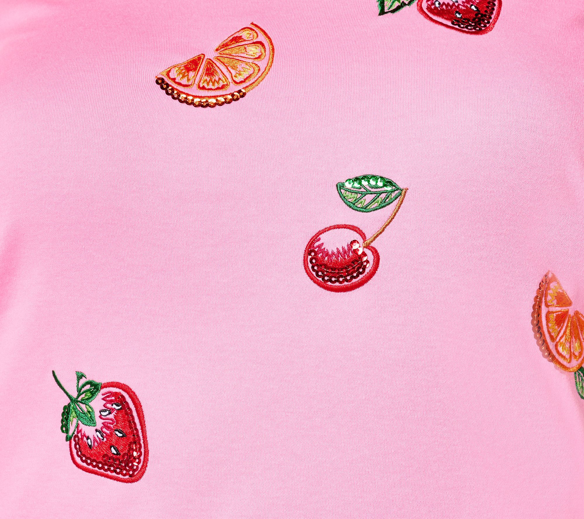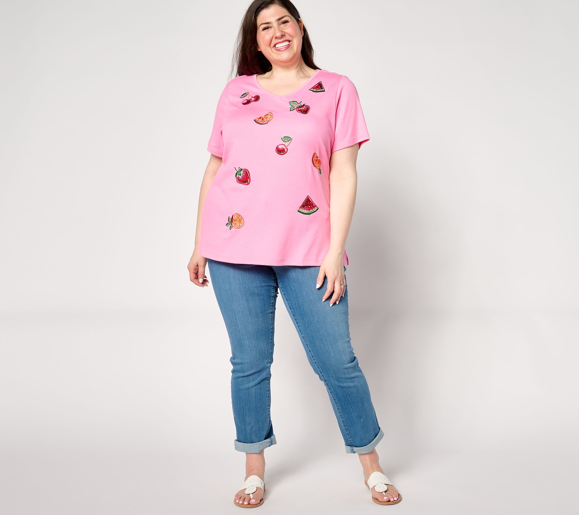 Sequin and embroidery details give this V-neck top a splash of personality and style. From Quacker Factory®.