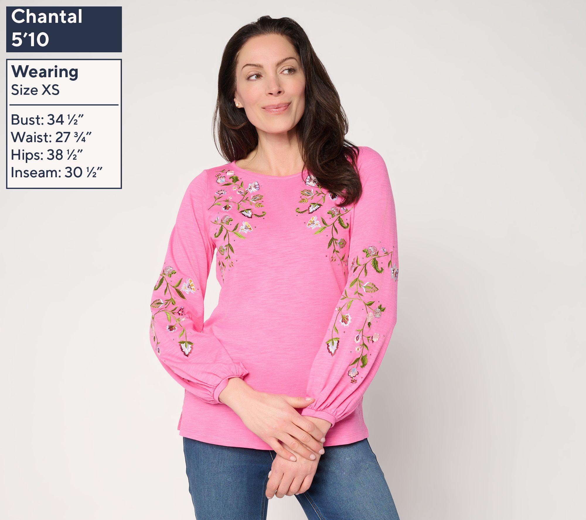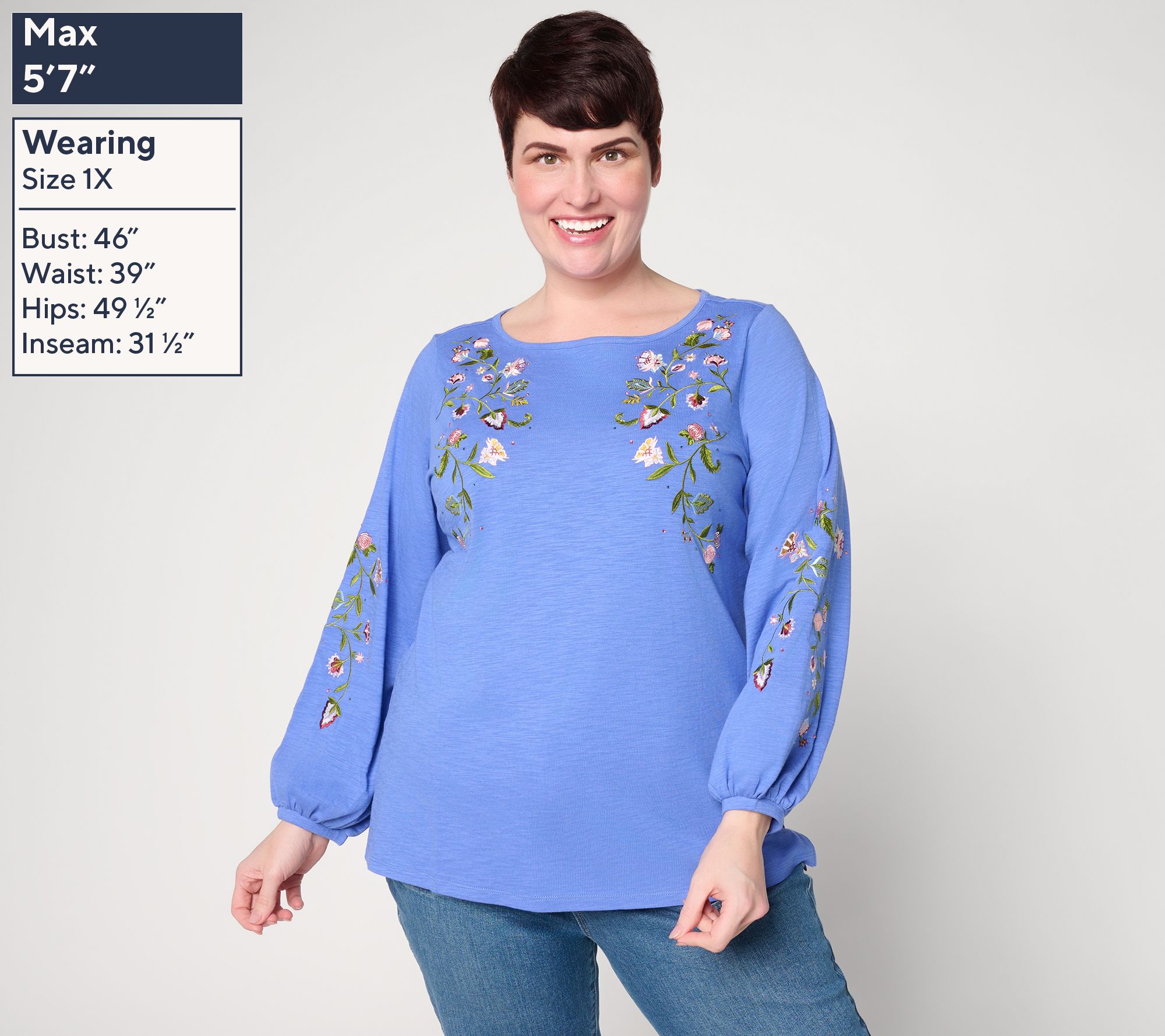 • Features: bateau neck, blouson sleeves, straight hem with side slits