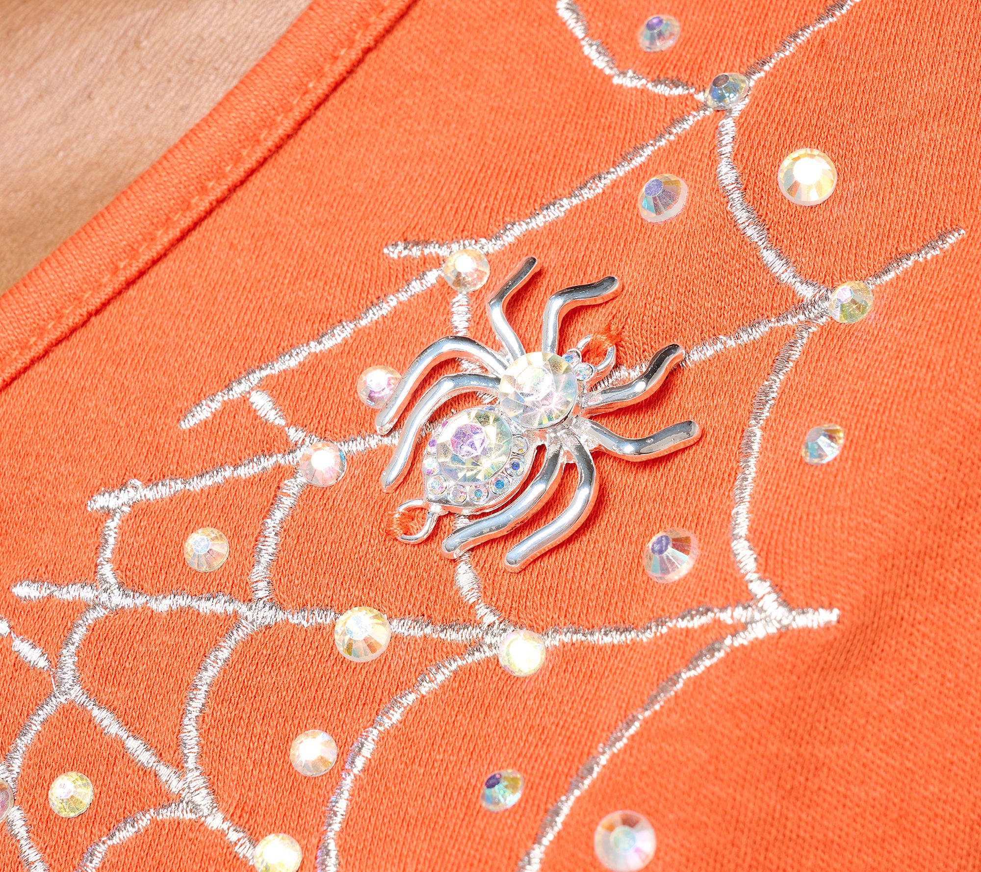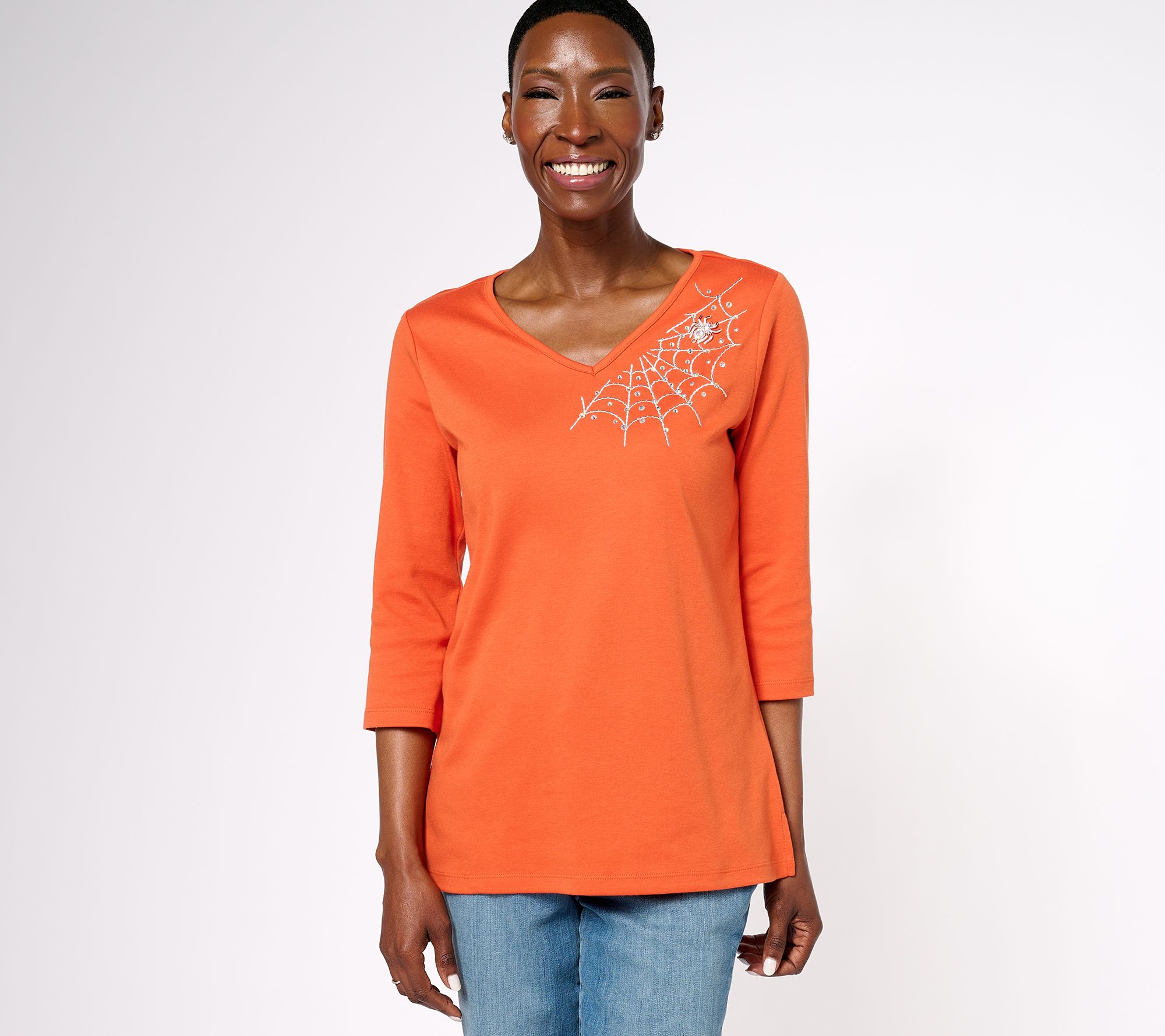 For those who wish it could be Halloween every day, welcome this cozy web-embroidered top into your wardrobe and consider yourself in costume all season long. The comfy knit design is infused with Halloween spirit -- complete with its own cute little spider. From Quacker Factory®.
