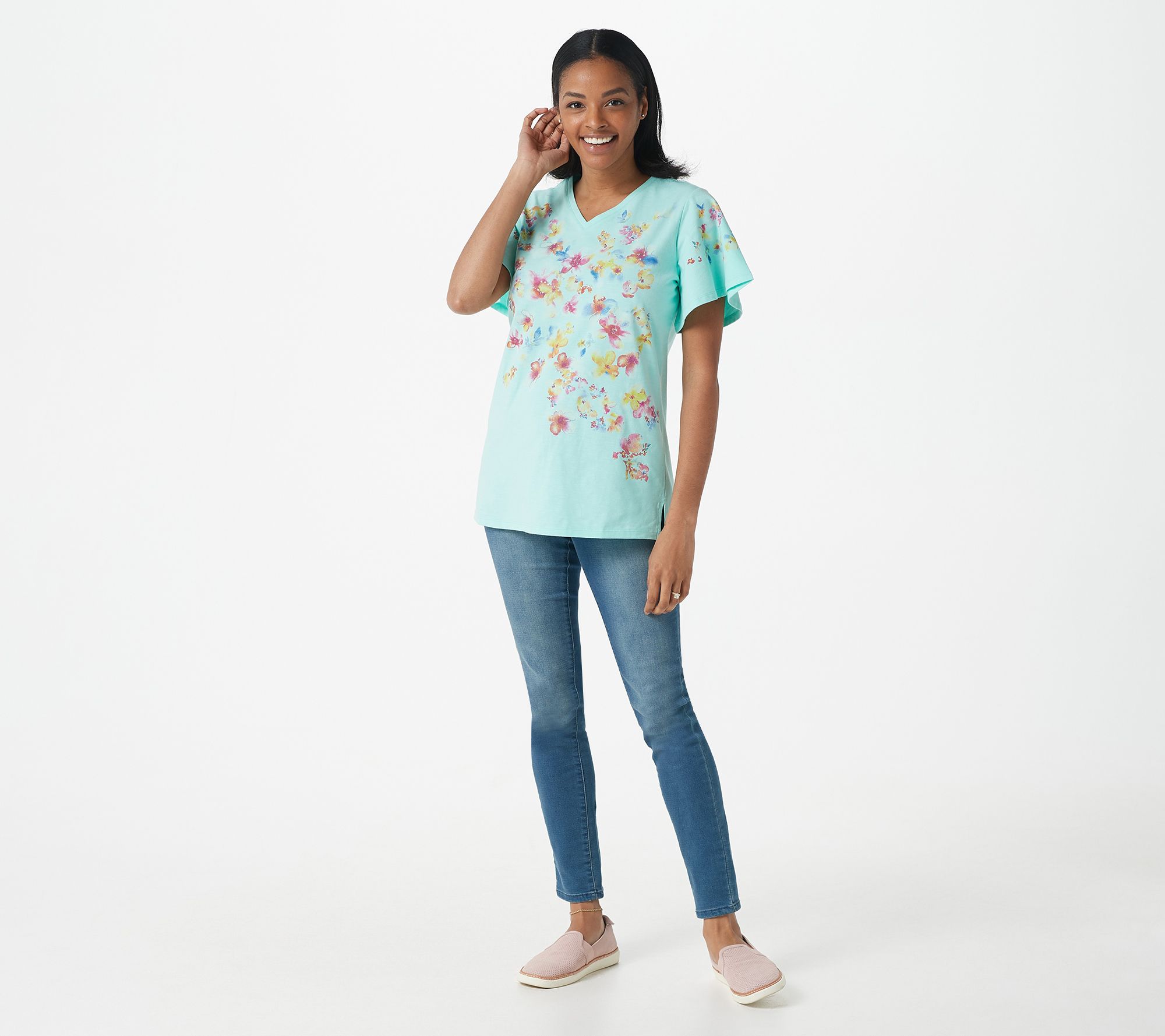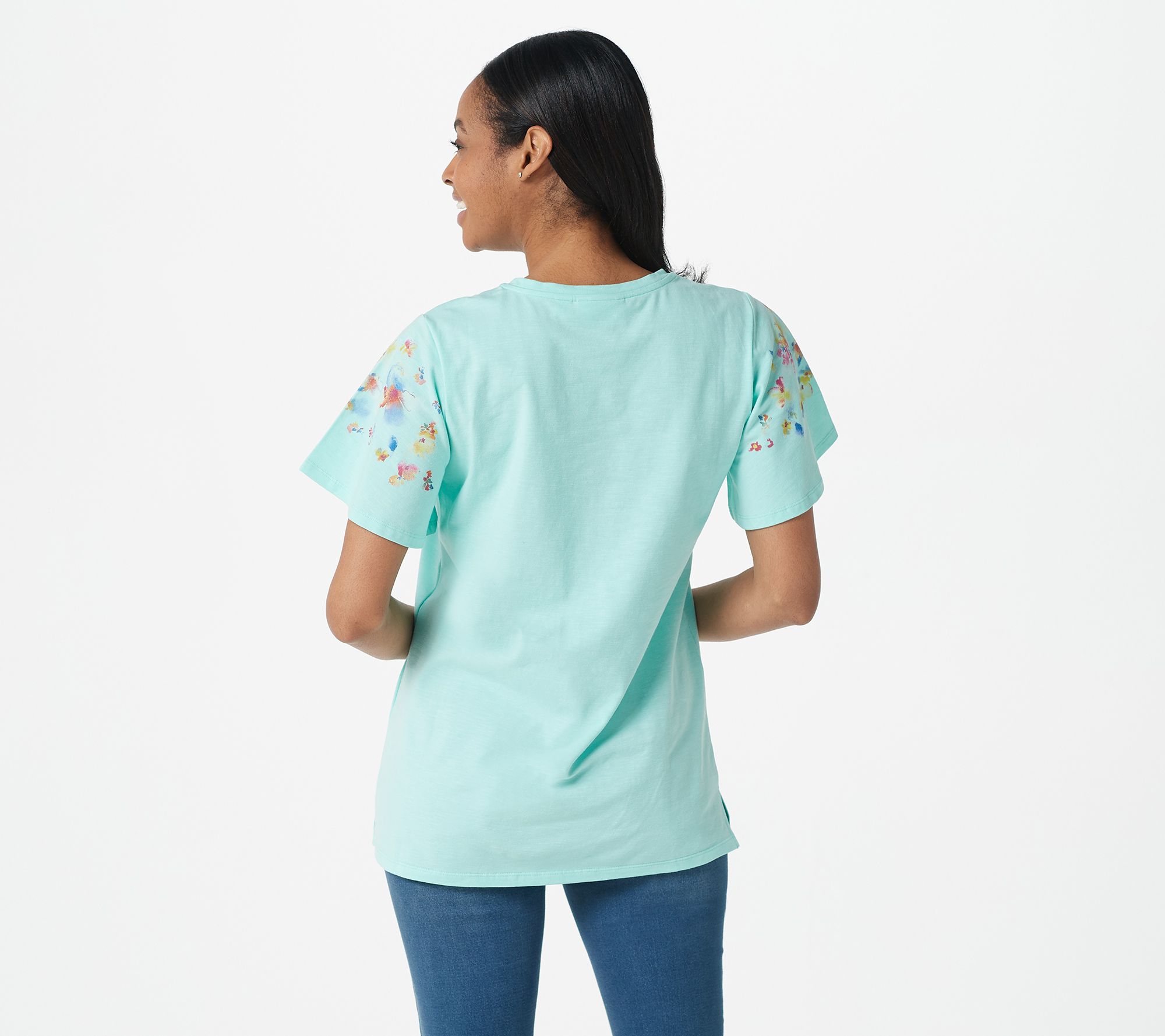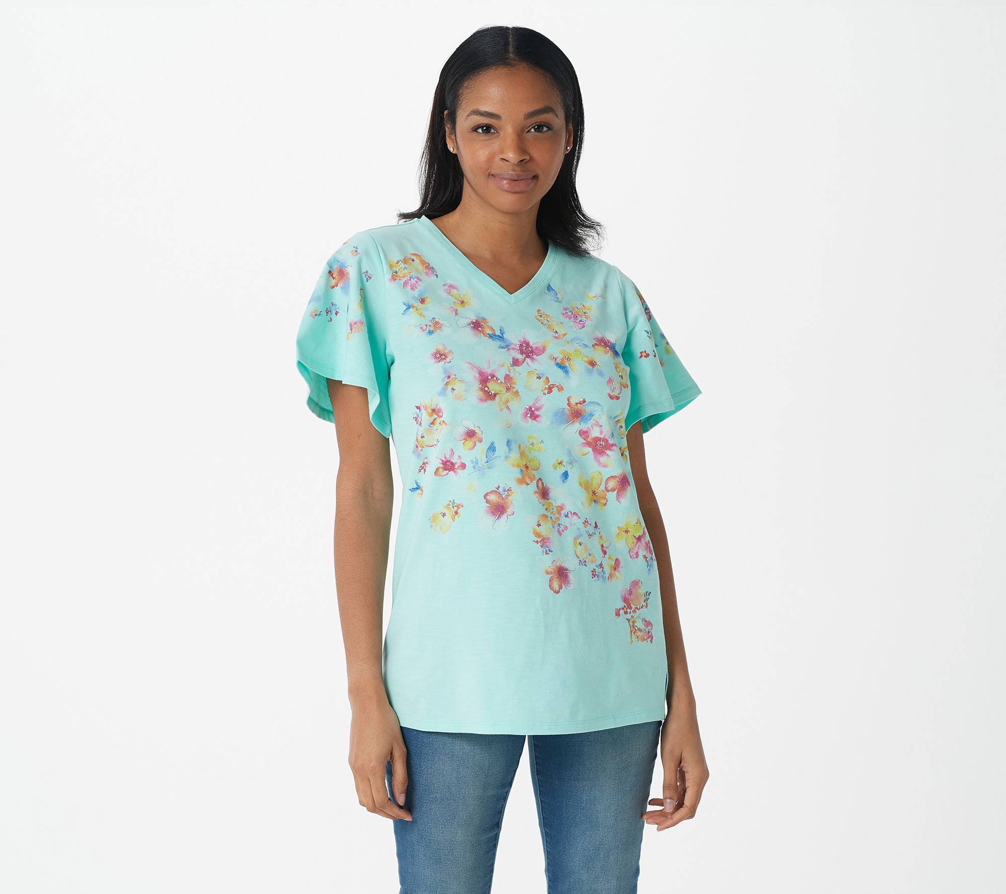 With a flutter of the sleeves and dainty watercolor floral print, this fairy-esque top will help your outfit blossom. From Quacker Factory®.