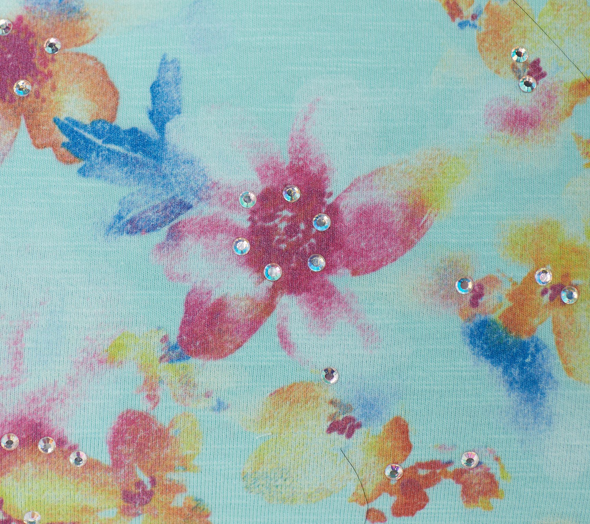 • Features: pullover style, V-neckline, watercolor floral print with rhinestone details, short flutter sleeves, straight hemline
