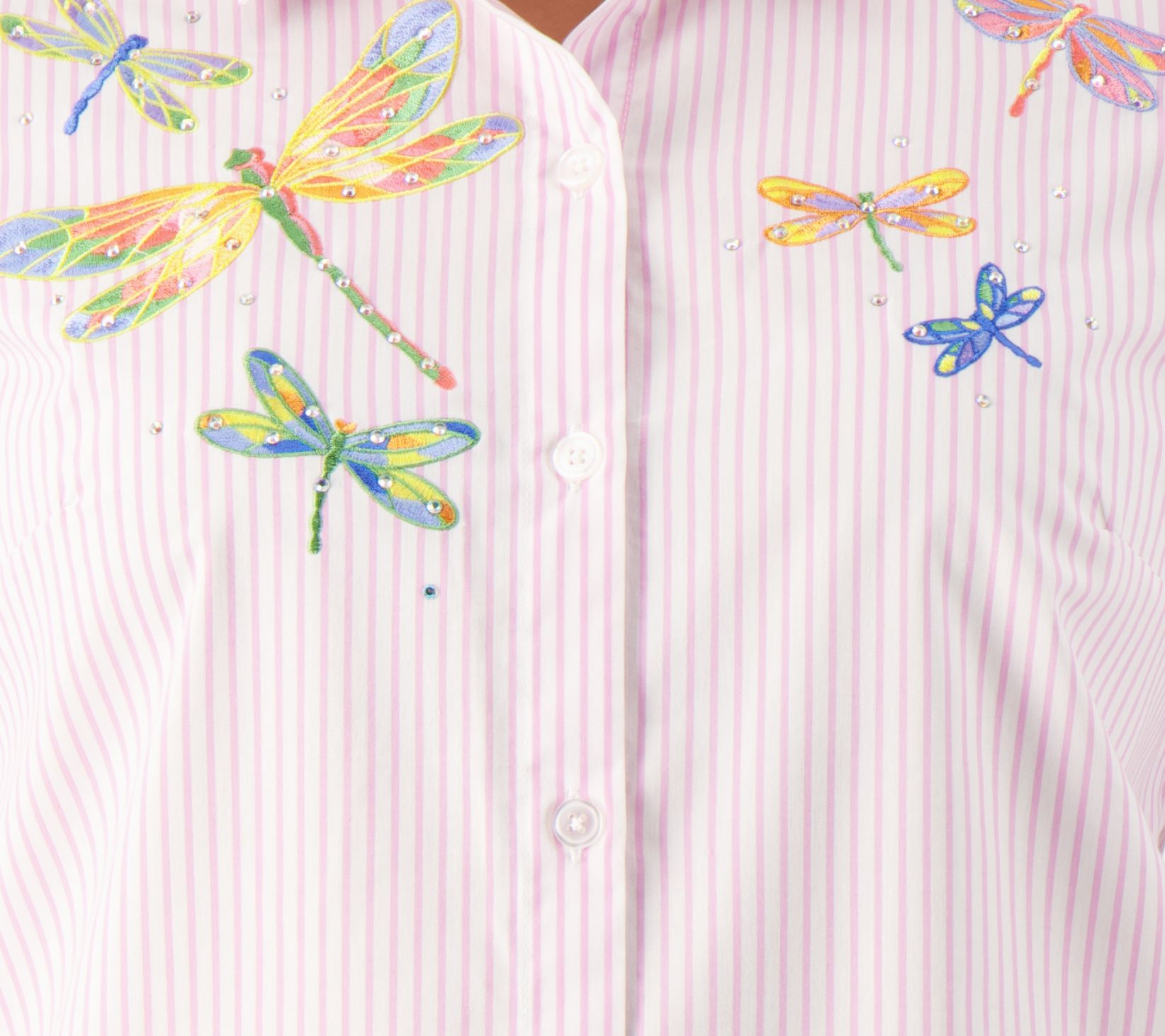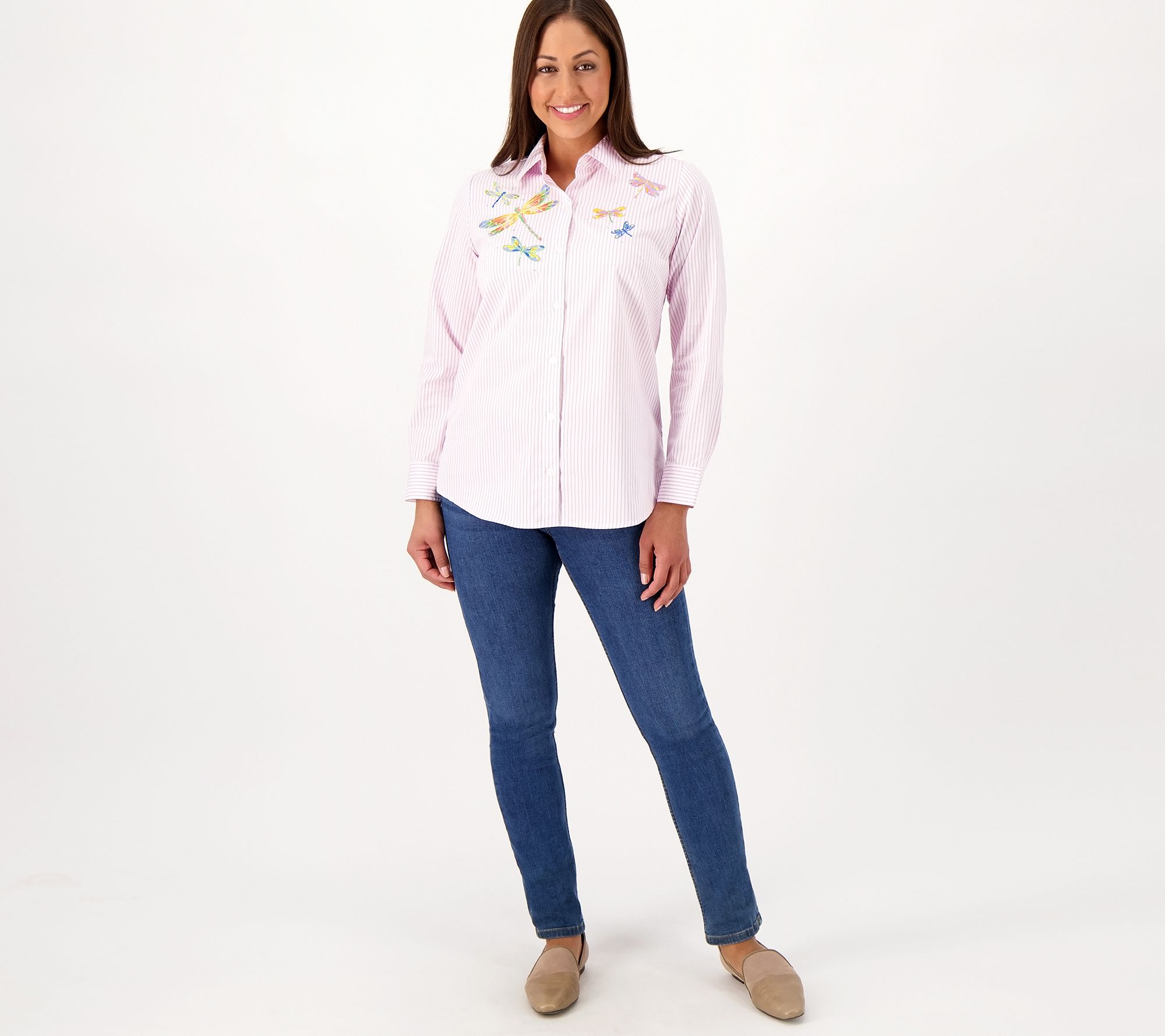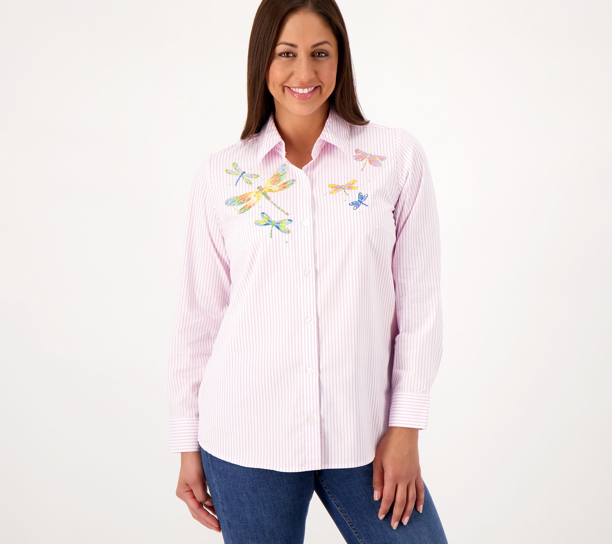 Polished, but make it pretty! This button-front shirt does just that with a fabulous winged design that screams springtime. From Quacker Factory®.
