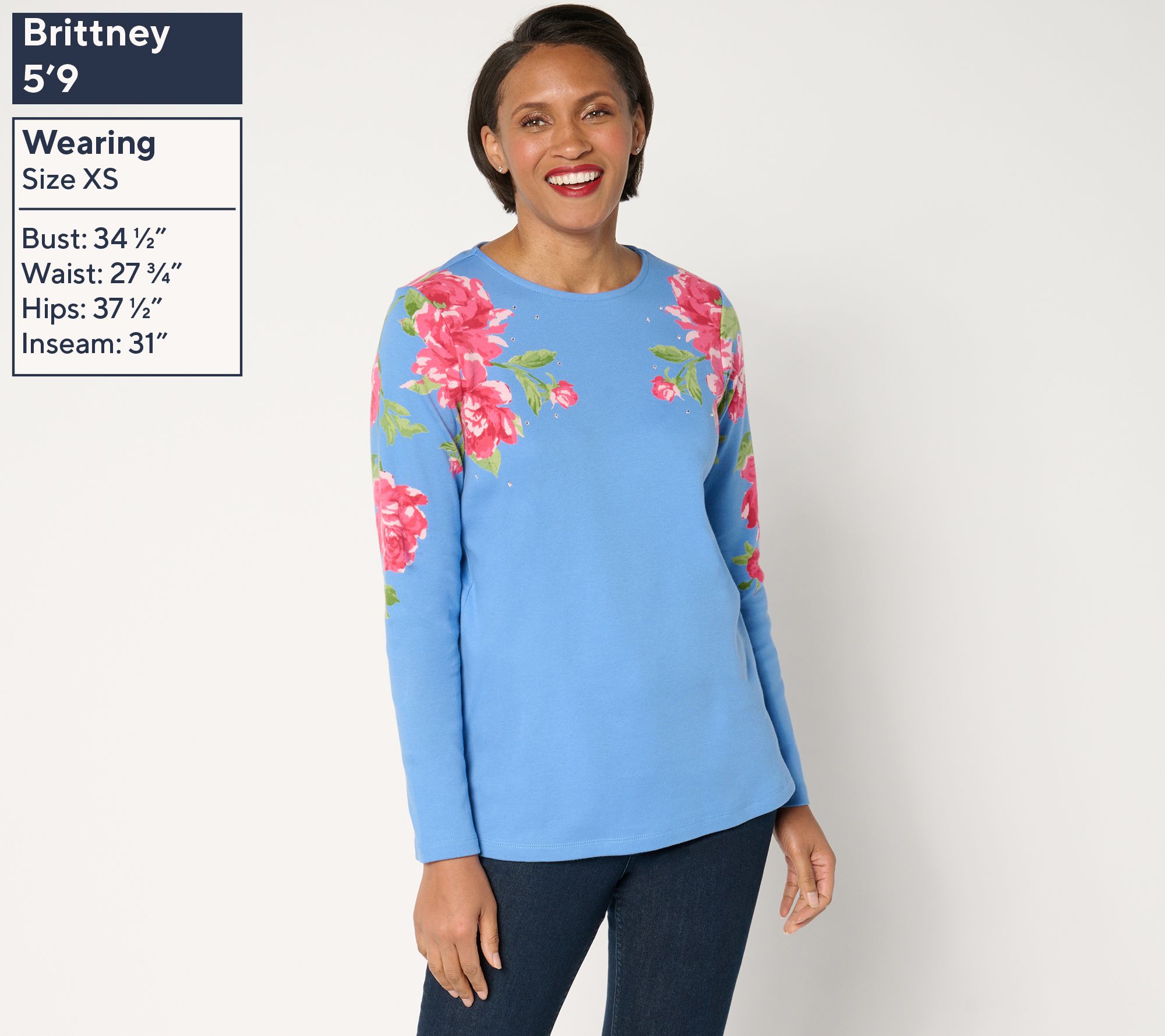 Let your playful personality and sense of style bloom with this Winter Rose Garden embellished top. Beautifully detailed with a printed floral pattern and rhinestone accents, this standout silhouette celebrates the beauty of nature and your natural beauty in a chic and charming way. From Quacker Factory.