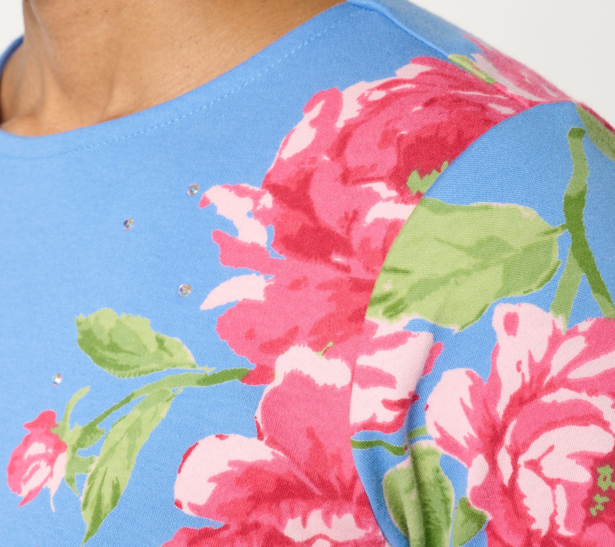 • Features: embellished design, long sleeves, crew neck, straight hem with side slits, rhinestone details, printed floral design