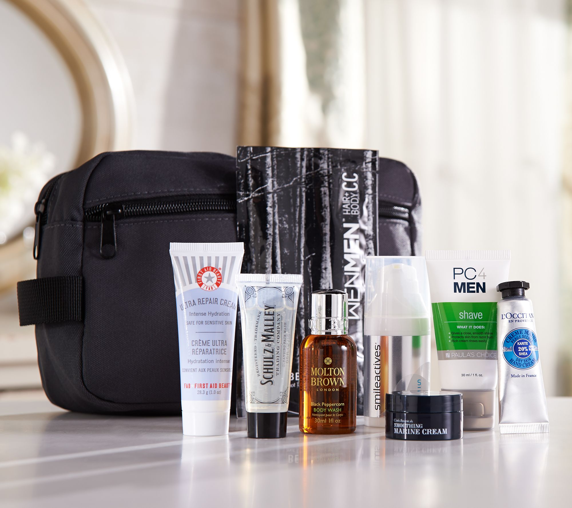 Man of the hour. Give the gift of great grooming essentials with this QVC Gifts for Him collection. The eight-piece set includes sample sizes of shower favorites WEN by Chaz Dean Men's Head to Toe Cleansing Conditioner, Molton Brown Body Wash, and Schulz & Malley Cleansing Face Wash plus moisturizing creams from First Aid Beauty, Clark's Botanicals, and L'Occitane. Paula's Choice PC4Men Shaving Cream and Smileactives Whitening Gel complete the collection--with everything neatly organized in a zippered black bag.